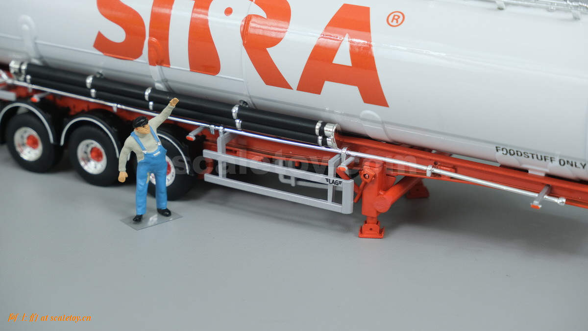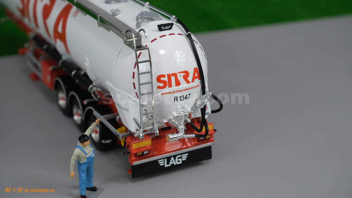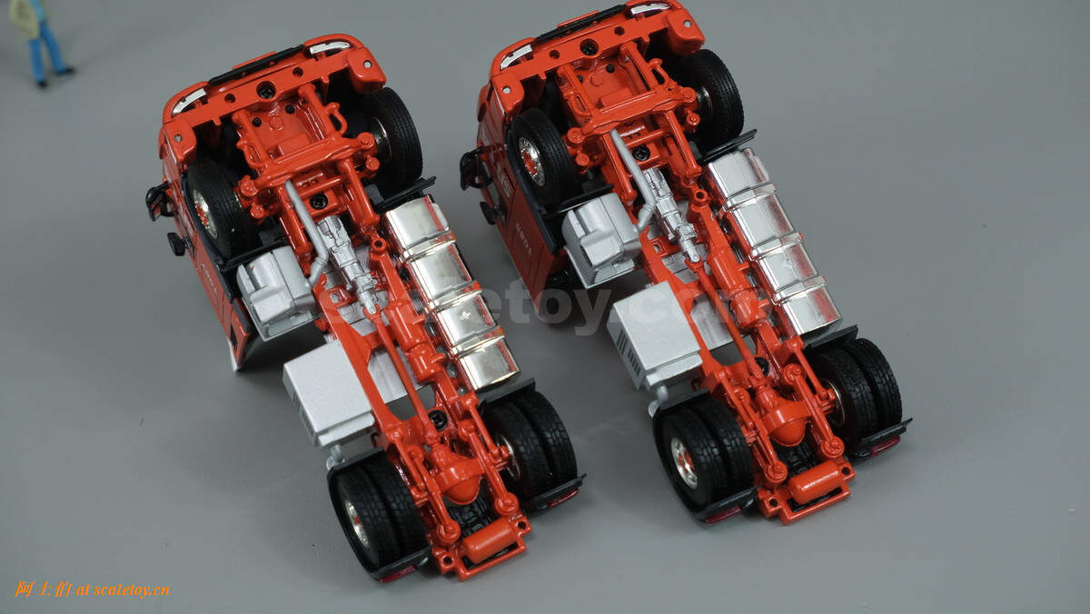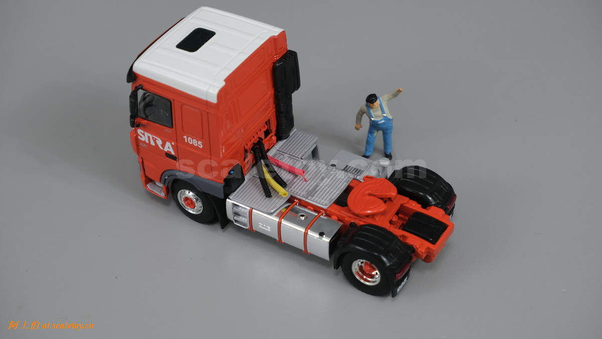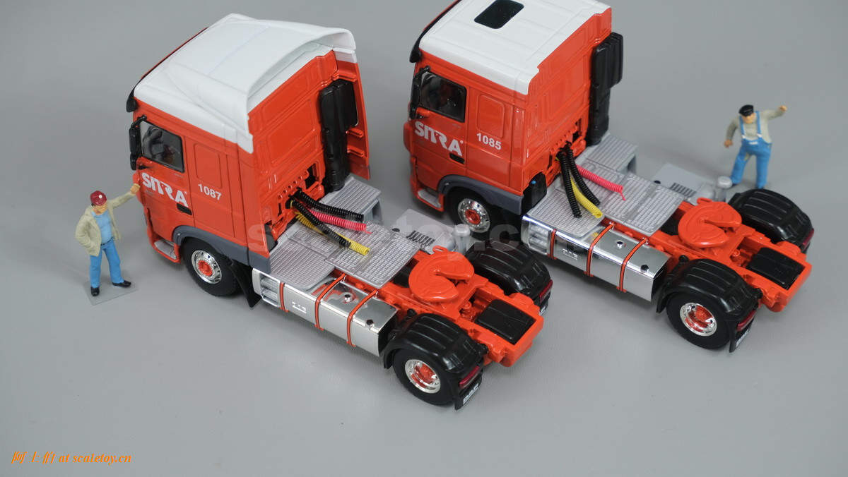 虽然也是反光银色左侧油箱,结构类似第一台拖头,但是看驾驶室顶部和背后,有差异,这款平顶没有扰流板、后面也没有侧裙板