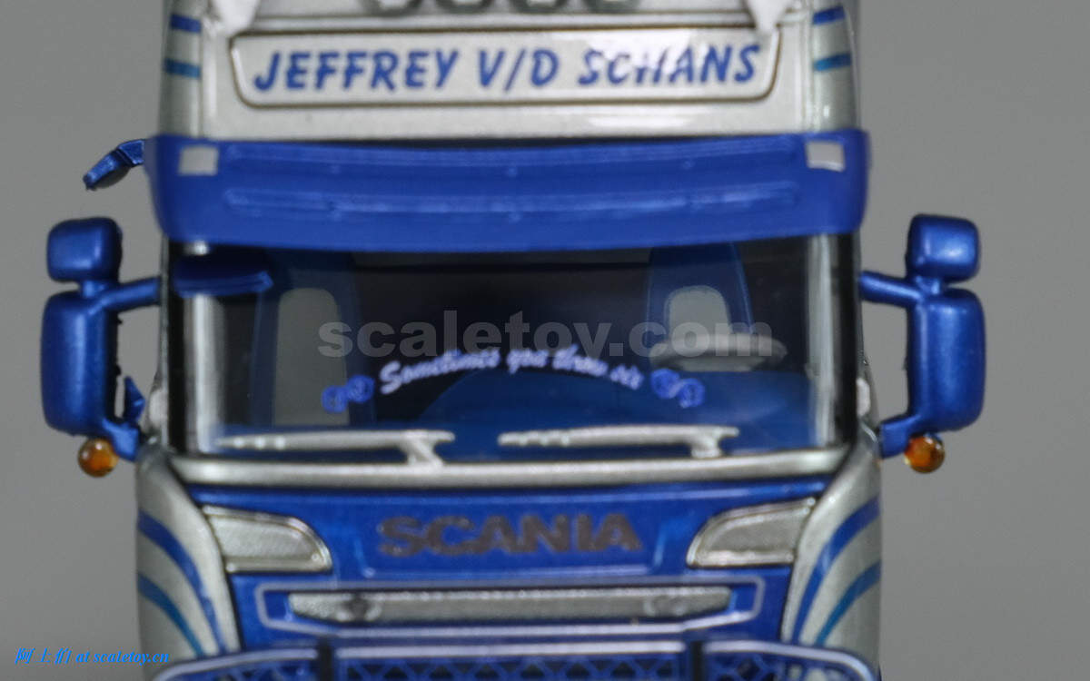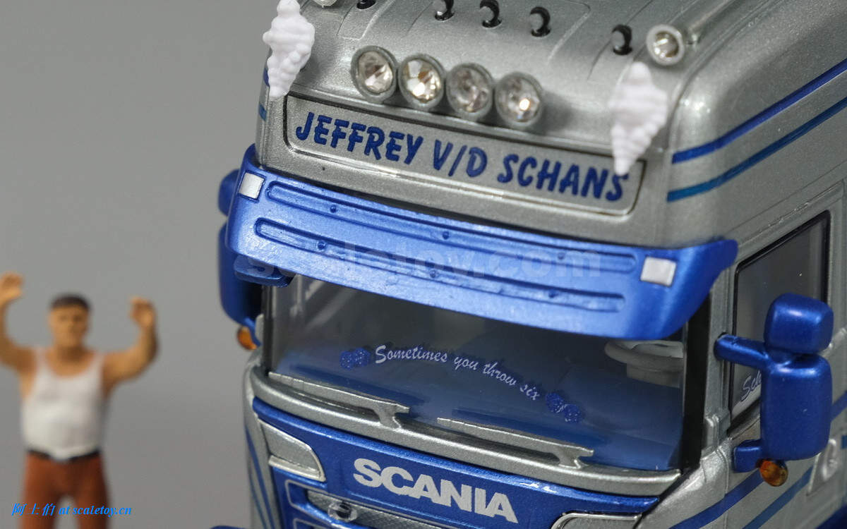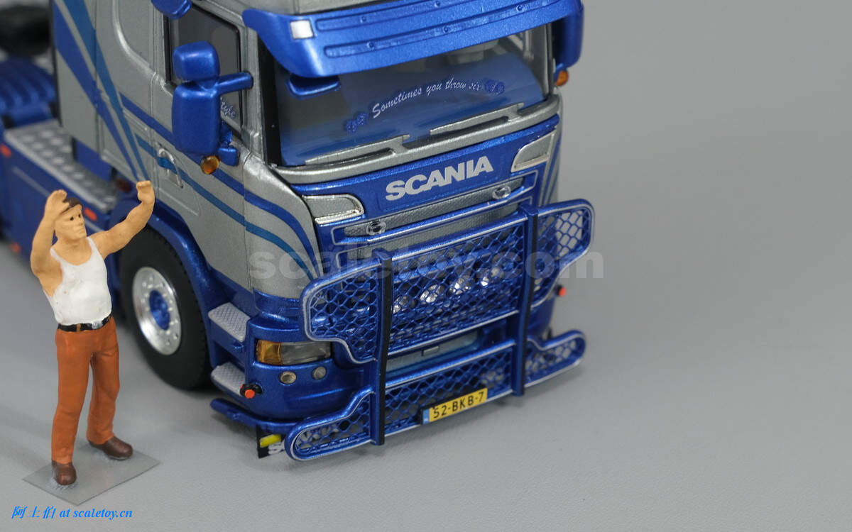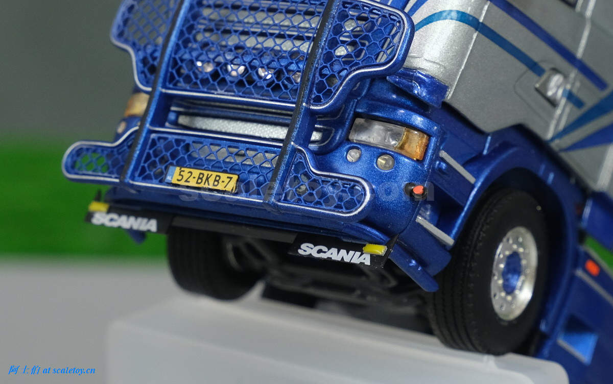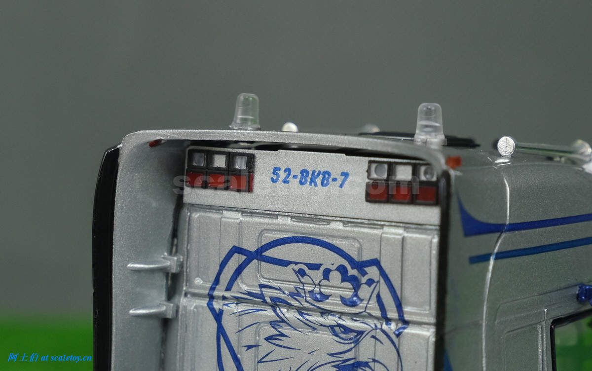 驾驶室背后是斯堪尼亚的鹰头,上方是独立结构的灯组和车辆牌照号。