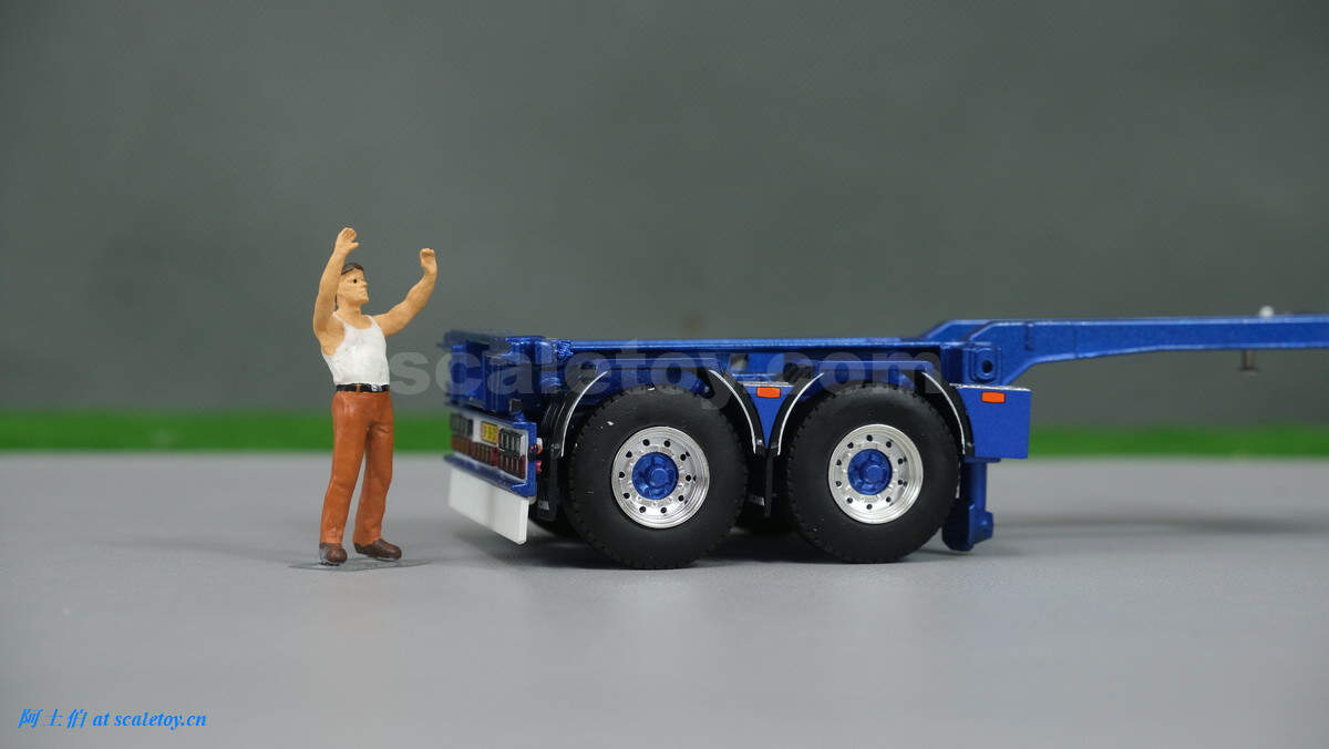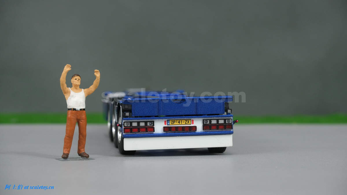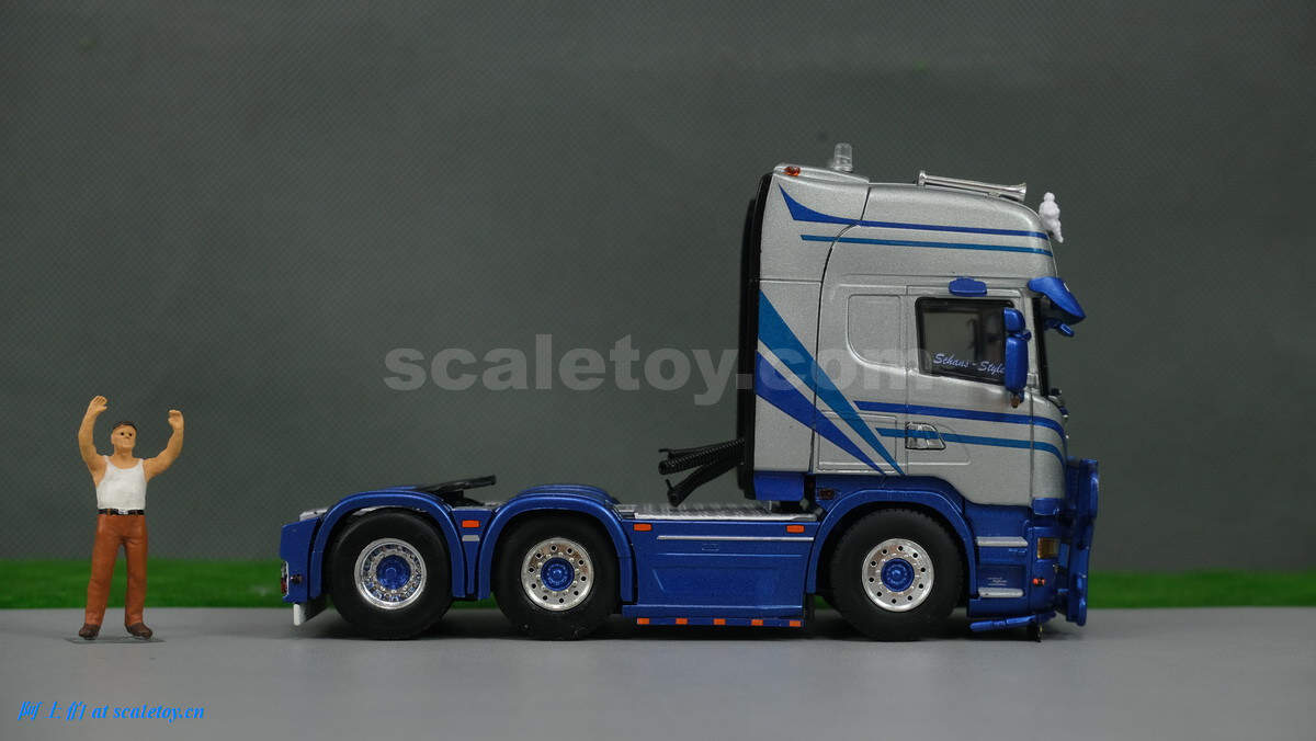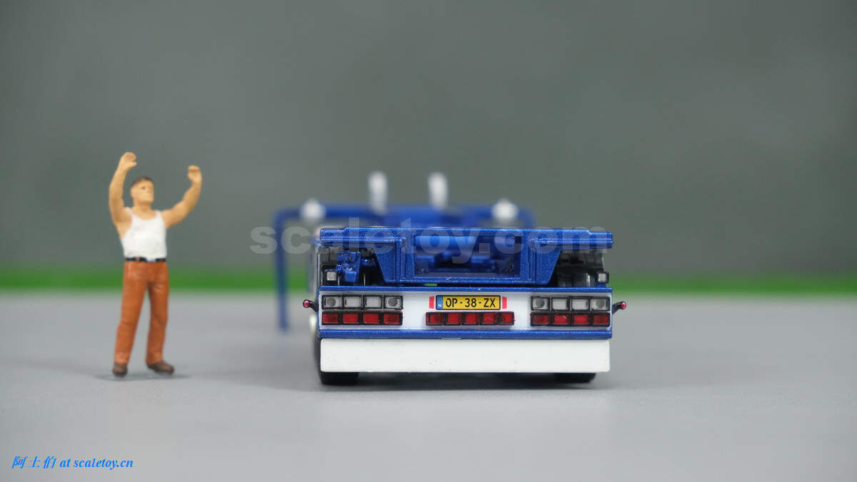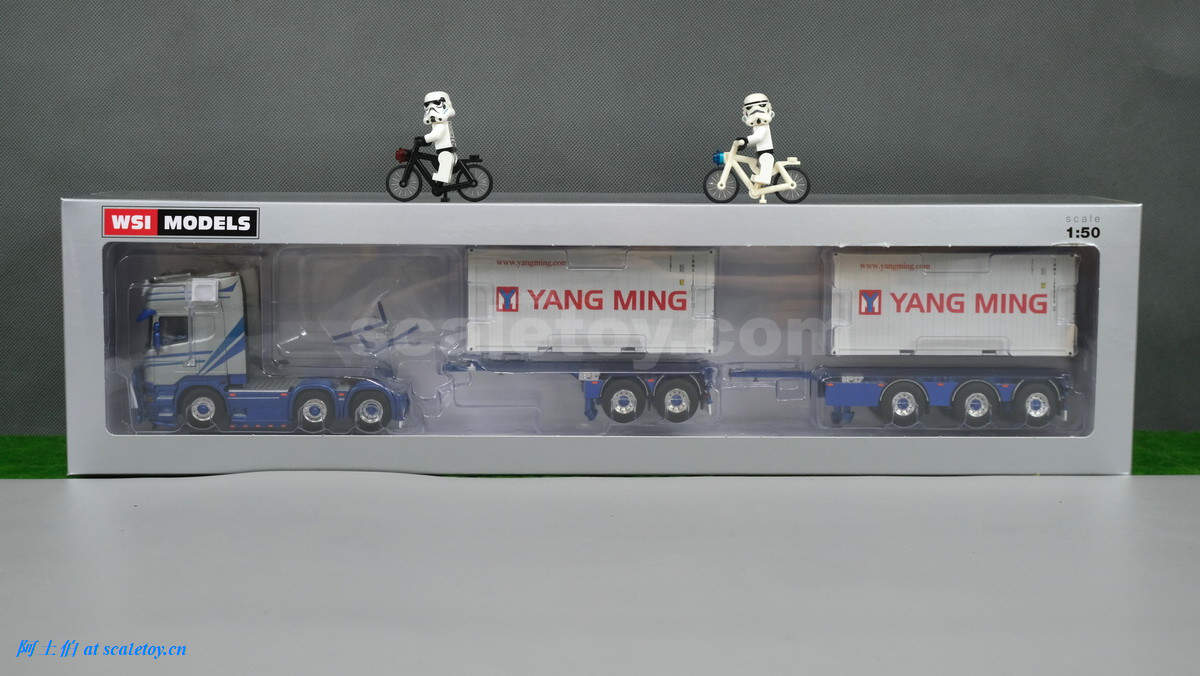 今天介绍的模型是该公司一台斯堪尼亚STREAMLINE TOPLINE 6X2 双转向桥拖头,挂BROSHUIS的 2connect 组合式集装箱托架,配两个阳明海运的20呎集装箱。模型为WSI出品,1/50比例,编号 01-3649 。