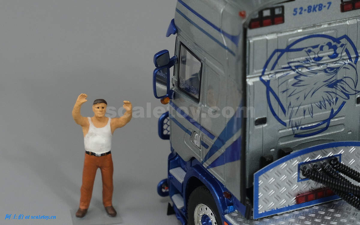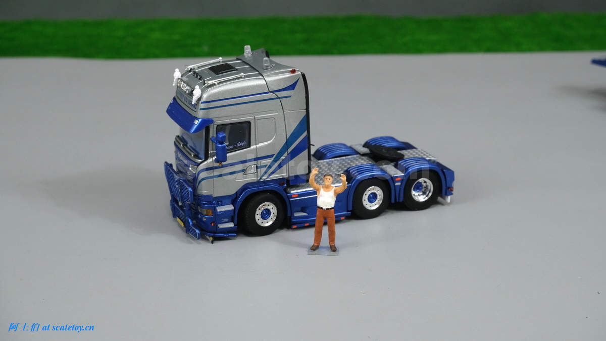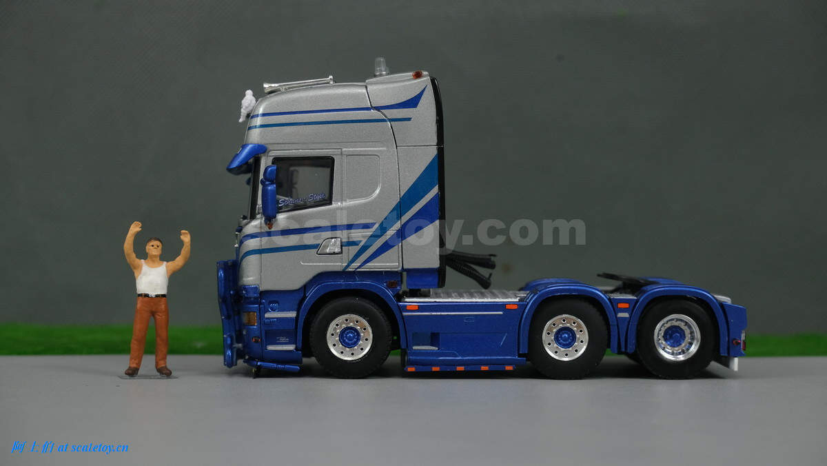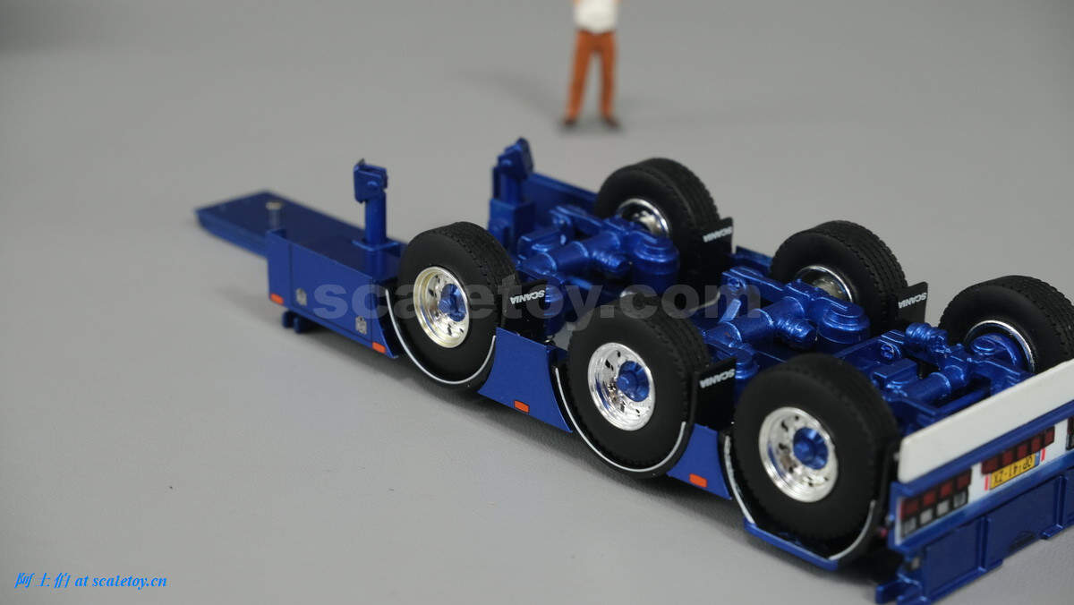 今天介绍的模型是该公司一台斯堪尼亚STREAMLINE TOPLINE 6X2 双转向桥拖头,挂BROSHUIS的 2connect 组合式集装箱托架,配两个阳明海运的20呎集装箱。模型为WSI出品,1/50比例,编号 01-3649 。