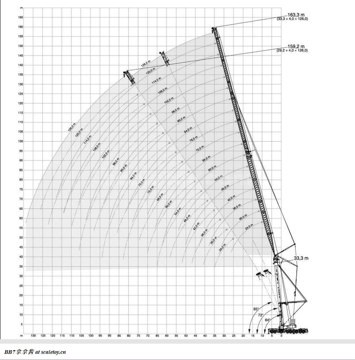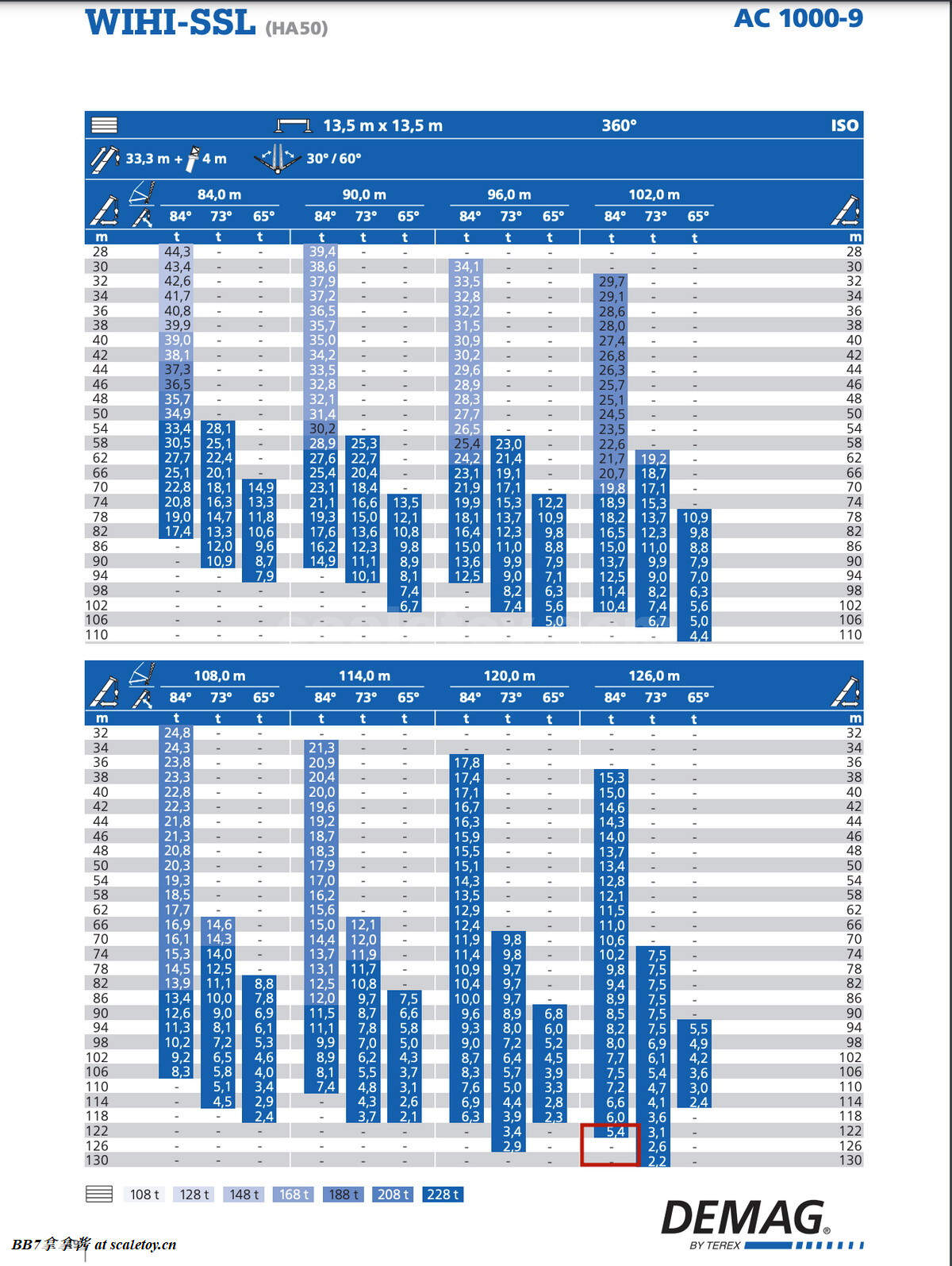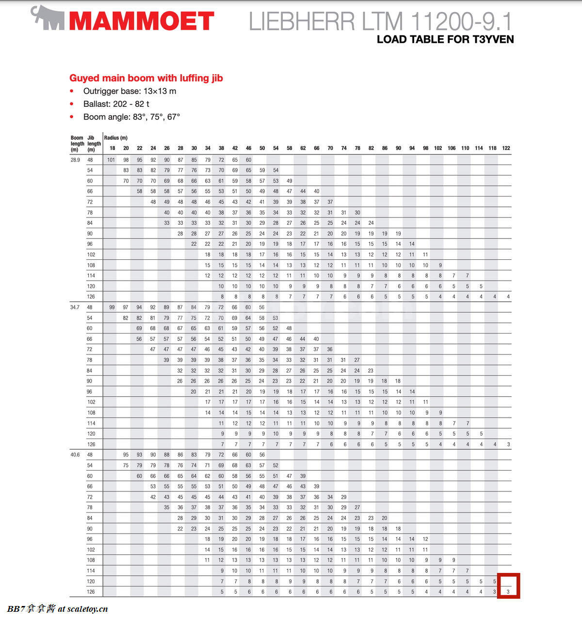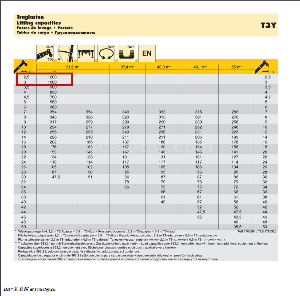 言归正传,让我们来正式开始聊利勃海尔的当家网红ltm11200,先从真车背景介绍开始。ltm11200-9.1的意思是9轴全地面1200吨级伸缩臂起重机第一代(L指Liebherr,T指Telescopic,M指Mobilkran)。不过其实看工况表我们可以知道这车其实是1000吨级,3m半径(全地面伸缩臂起重机通用吨位计算半径)起重吨位只有1000t,2.5m才是1200t。
