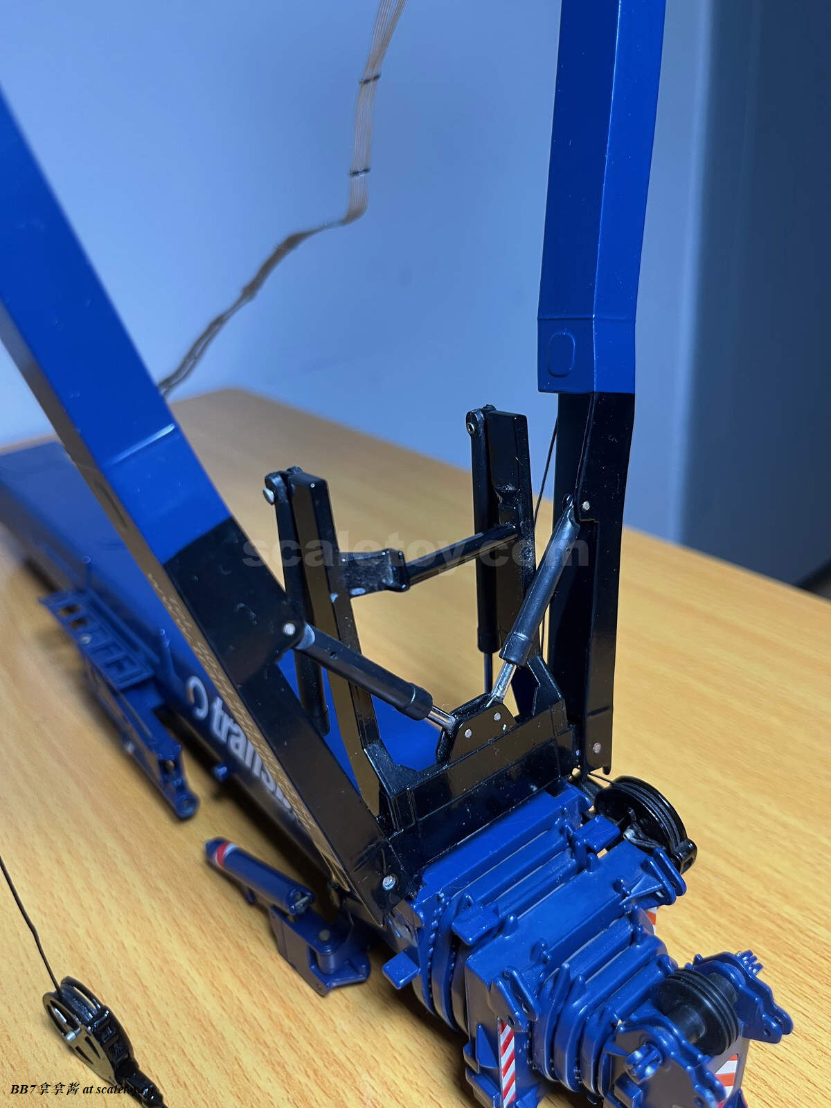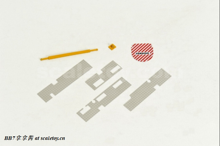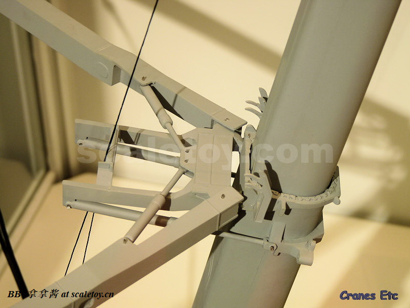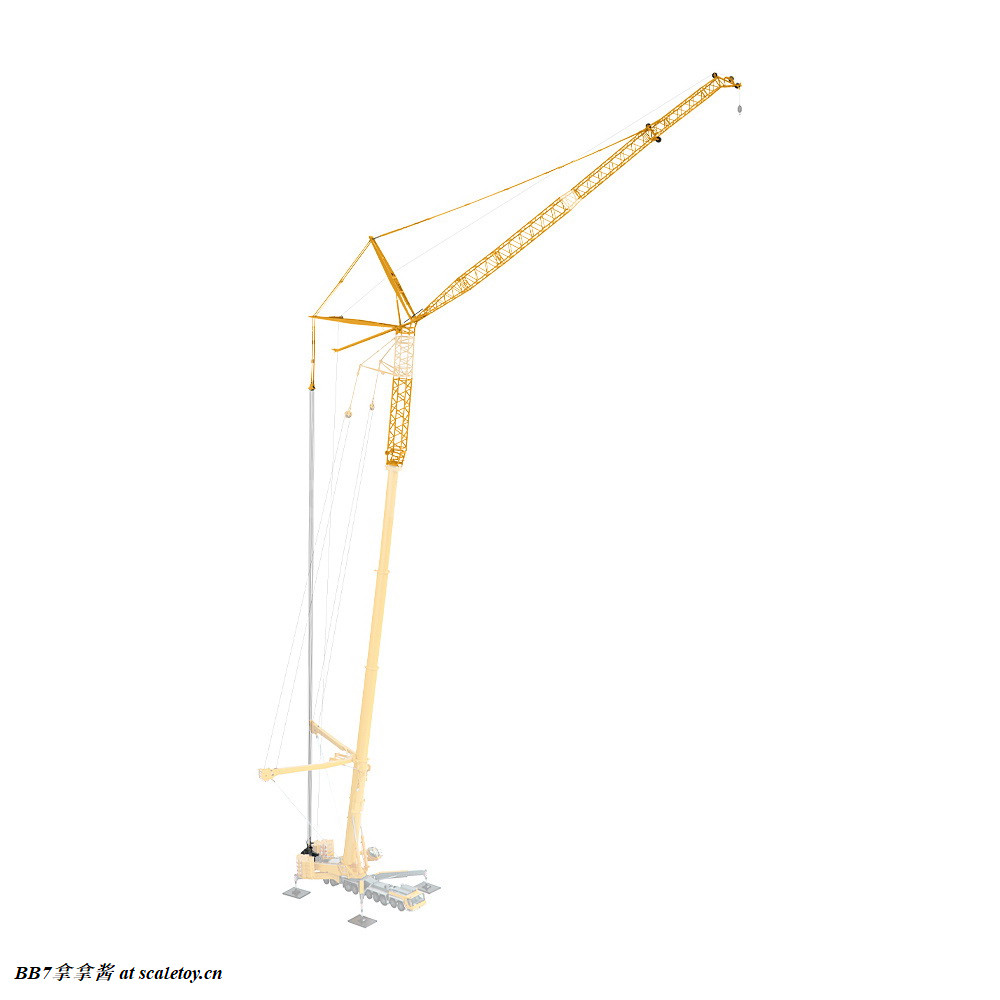 现在再来看看附带的钩子和臂架。首先是一个液压变幅副臂,单独安装就是T7YVEF/T7YVENZF工况。首先最显眼的就是两个塑料大油缸,观感肯定是不出意料的非常一般。把玩上说,这个工况臂比较短,塑料油缸摩擦力也够,如果要塞桁架标准节,那只能换ycc的金属油缸了,但是油缸连接是铆钉,所以拆装也比较麻烦。除了转换头和第一节6m的桁架是摩擦销钉连接,剩下的桁架都是螺丝连接,组装自由度非常高。臂头滑轮和主臂一样同样是高质量的呈现。注意桁架内壁是平面而不是圆管,这一点到是不强求,能做到桁架是圆管的厂商没几家,可能是开模技术限制吧。另外需要注意的一点是超起拉杆和引导滑轮架的金属比较柔软,小心掰弯掰断,我的就已经弯了。细节方面那基本可以说是零,没有蚀刻片步道板,栏杆,爬梯,吊耳和管线,那么大一个液压管线转盘也是完全没有,又被nzg吃了(哎呀大家都懂的,这种细节只有ycc和twh有)。