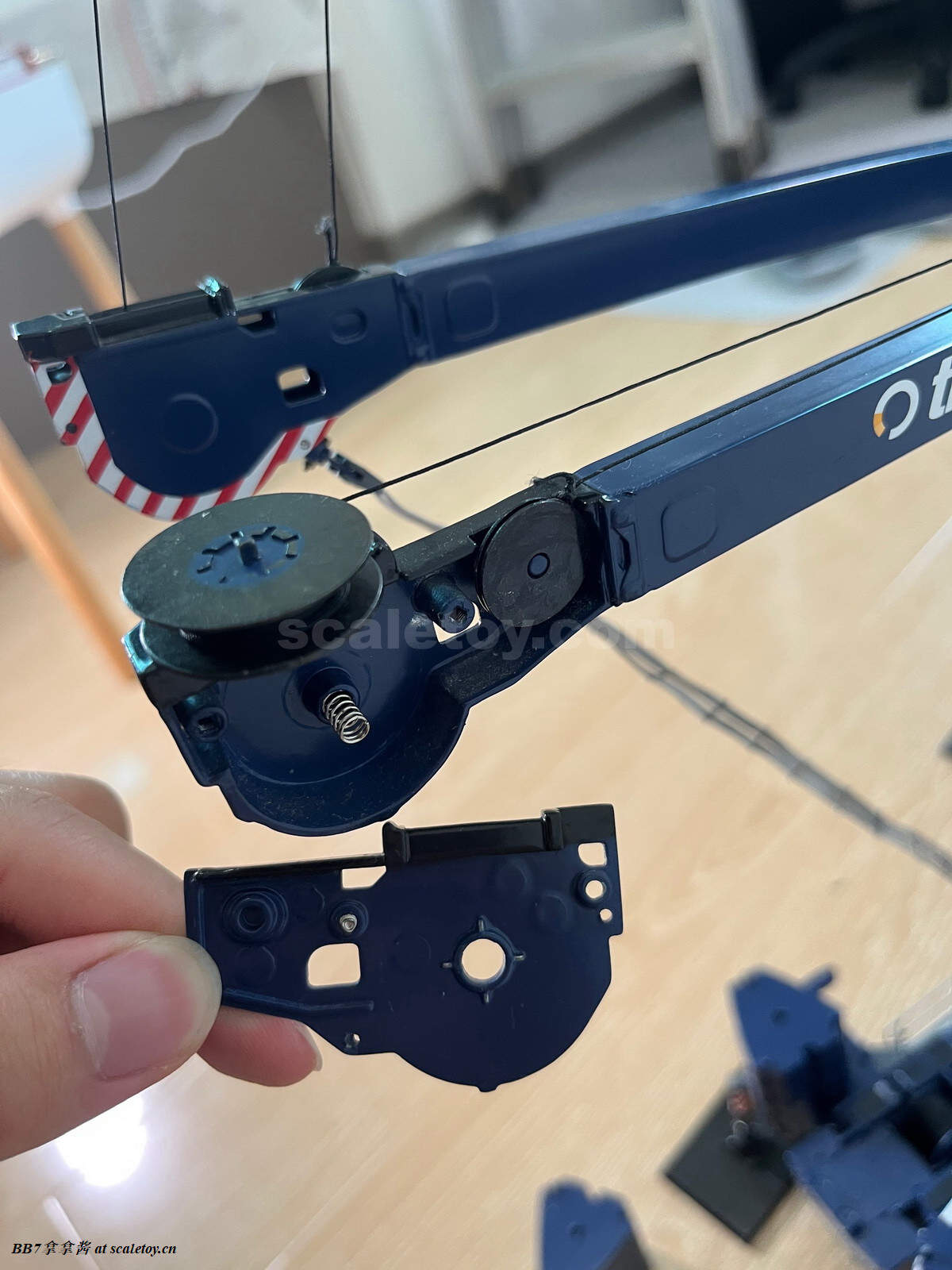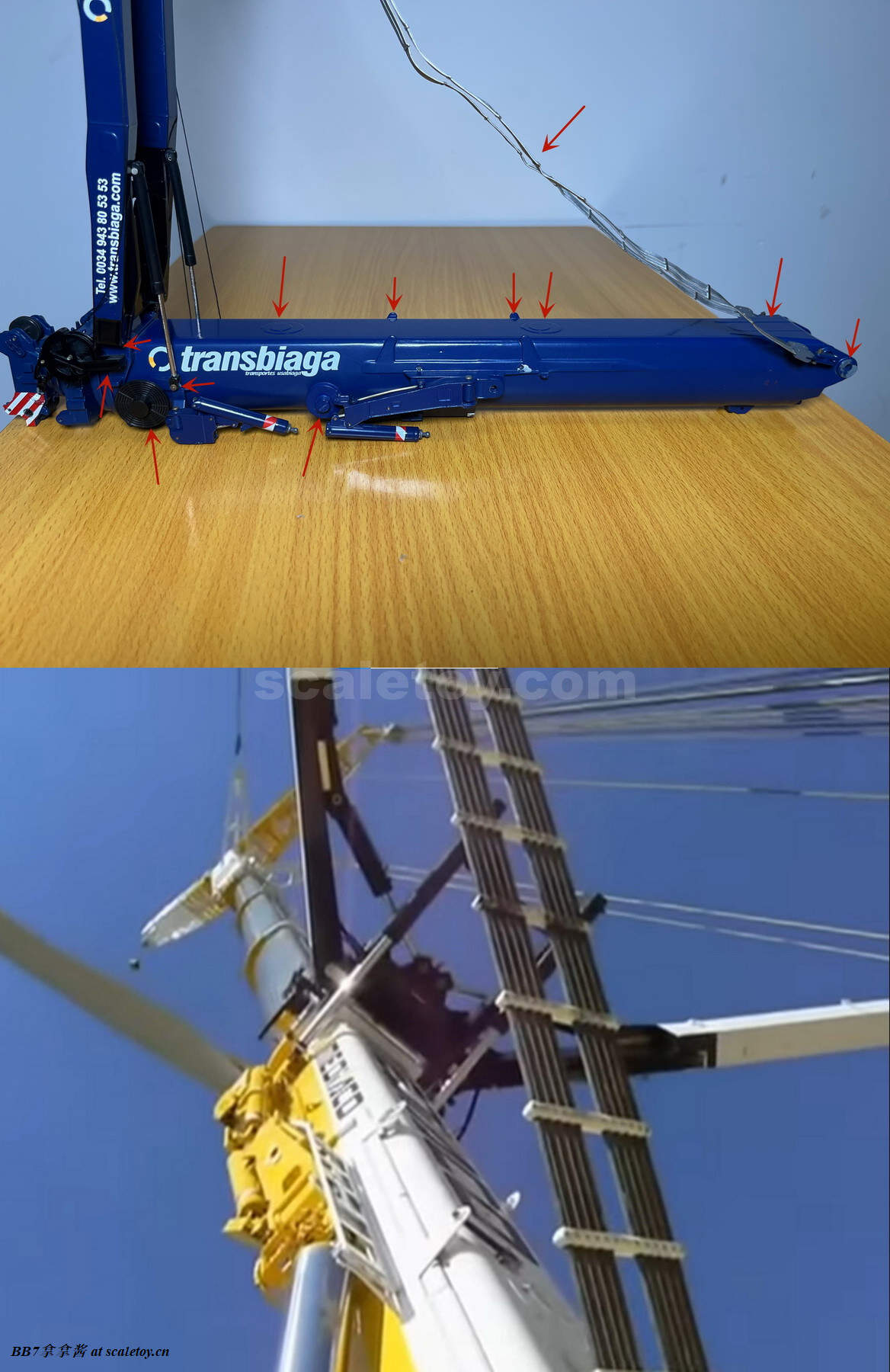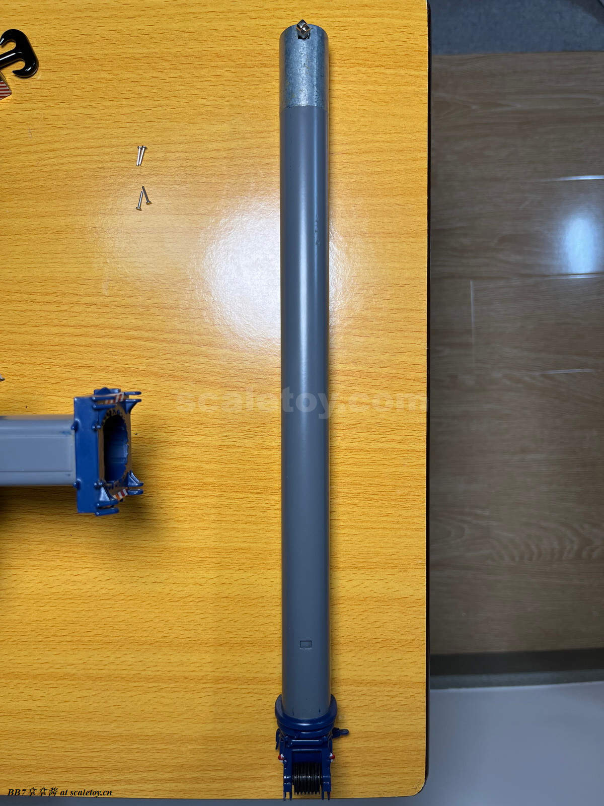 现在再来看看附带的钩子和臂架。首先是一个液压变幅副臂,单独安装就是T7YVEF/T7YVENZF工况。首先最显眼的就是两个塑料大油缸,观感肯定是不出意料的非常一般。把玩上说,这个工况臂比较短,塑料油缸摩擦力也够,如果要塞桁架标准节,那只能换ycc的金属油缸了,但是油缸连接是铆钉,所以拆装也比较麻烦。除了转换头和第一节6m的桁架是摩擦销钉连接,剩下的桁架都是螺丝连接,组装自由度非常高。臂头滑轮和主臂一样同样是高质量的呈现。注意桁架内壁是平面而不是圆管,这一点到是不强求,能做到桁架是圆管的厂商没几家,可能是开模技术限制吧。另外需要注意的一点是超起拉杆和引导滑轮架的金属比较柔软,小心掰弯掰断,我的就已经弯了。细节方面那基本可以说是零,没有蚀刻片步道板,栏杆,爬梯,吊耳和管线,那么大一个液压管线转盘也是完全没有,又被nzg吃了(哎呀大家都懂的,这种细节只有ycc和twh有)。