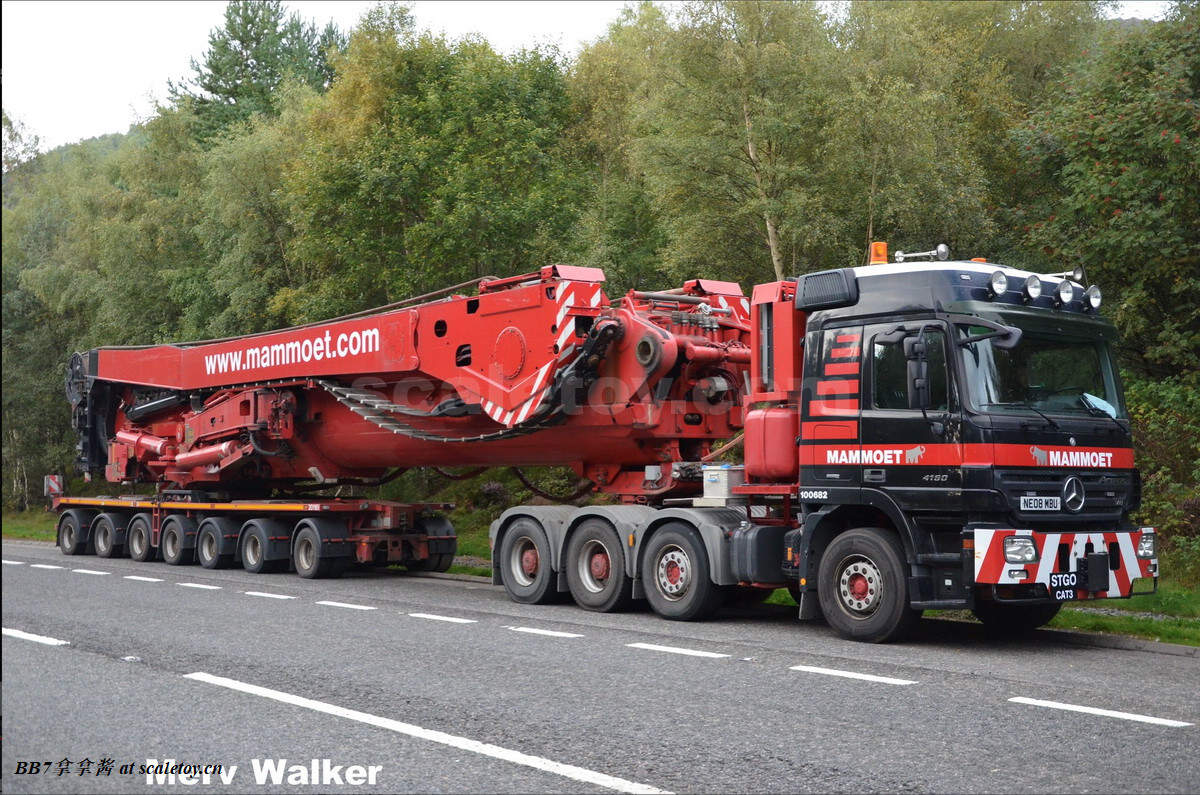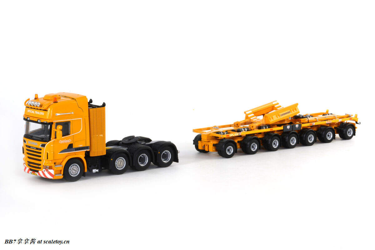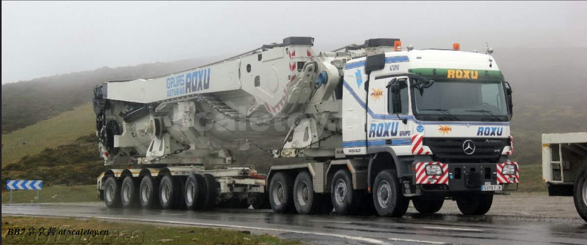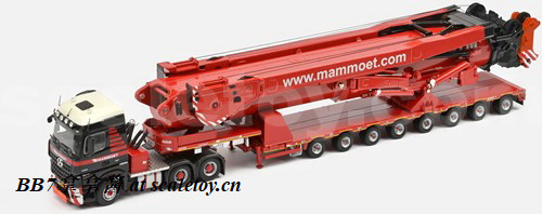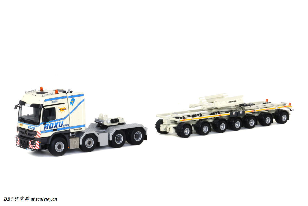 Wsi7轴风电拖车改装主臂运输车,出了6款,标黄tgx,标黄scania,标黄actros,grohmann的actros,roxu的actros和mammoet的tgx。只有大象涂装是符合现实的,不过模型套装里用的是man tgx,现实里大象用的更多的是MB mp2 4160和mp3 4160。由于套用模具,wsi出的其他涂装多少和现实有所出入,roxu是5轴拖板,而且拖头是个mp2 8×6高前悬挂的4160(wsi常规操作了,出mp3套mp2)。而利勃海尔自己和grohmann貌似压根没有用这种拖车运主臂(汗)。mammoet 410026_000