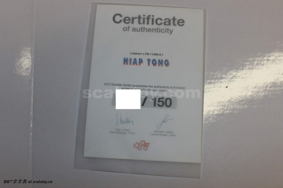 现在展示说明书和包装,由于我这台保存不好,说明书和包装全没了(认真收藏模型的话,包装,说明书和收藏卡也是和模型主体同样重要的啊,缺一不可)。运输箱是个有模型信息的牛皮纸箱,中规中矩。外包装是两端开口的黄白色硬纸盒,采用经典的利勃海尔主题彩绘,正面是模型实拍图(注意还是先行生产版的纯黄色超起),背面是实车照片,侧面是文字介绍。有个别涂装是另外设计的外包装封绘,比较出名的比如mammoet,h.n.krane,启德和mic。内部包装是三层白色泡沫箱,非常稳固。打开来看,这个包装可以说是非常得好,每一个部件都稳固放置,也都有纸包着防止摩擦掉漆,配重还有小塑料盒,主车和大臂也是有大量的泡沫,纸和塑料封条捆绑,防止移动和摩擦掉漆。早期生产版本支腿垫板是纸包着,后期型换成了塑料袋包着,总之也是非常良心。总体实际保护效果一级棒,可能也是因为没太多细节可以损坏吧(bushi)。整个包装功能性强,观感中规中矩,和wsi差不多,显然没有imc和ycc高级。Ycc的运输箱泡沫护角,内部黑色泡沫,红色彩绳,凹槽存放说明书,塑料卡子固定多层泡沫盒免除烦人的胶带,确实可以说是相当高级,十分养眼,保护性出色,同时也很人性化,希望各大厂商学习这样的优秀包装。说回来11200,比较特别的是,虽然这台车涂装都是限量,但早期生产的涂装没有限量卡(除了mammoet有自己的限量卡),后期生产的有这种nzg统一排版的签名限量卡,看起来还是比较高端的(虽然签名是复印件)。最后需要玩家注意的就是,买车一定要检查好这些包装和封条,仔细看看塑料封条和泡沫有没有缺失,不怕买二手车,就怕以为买的是全新其实是二手。