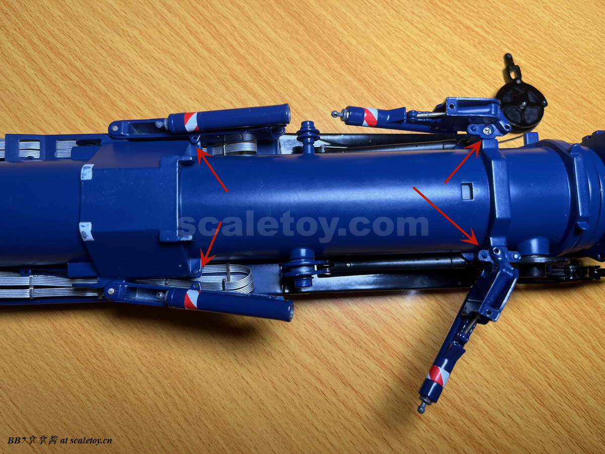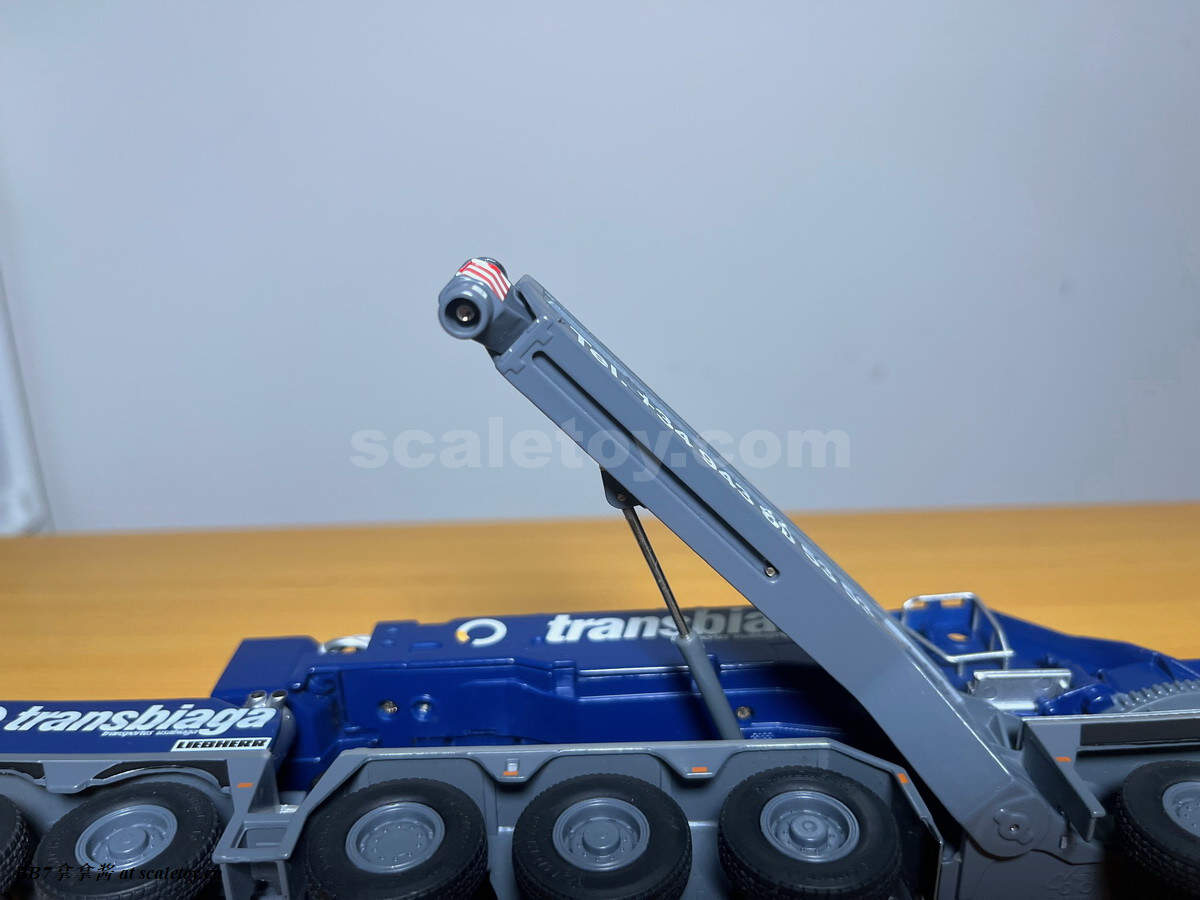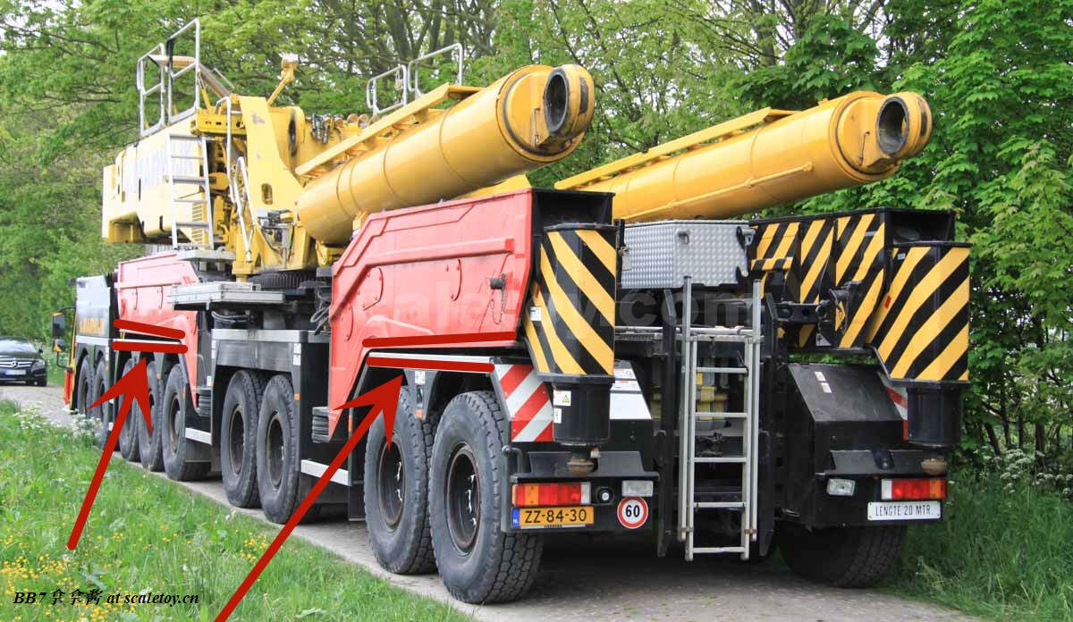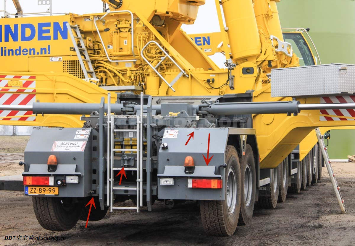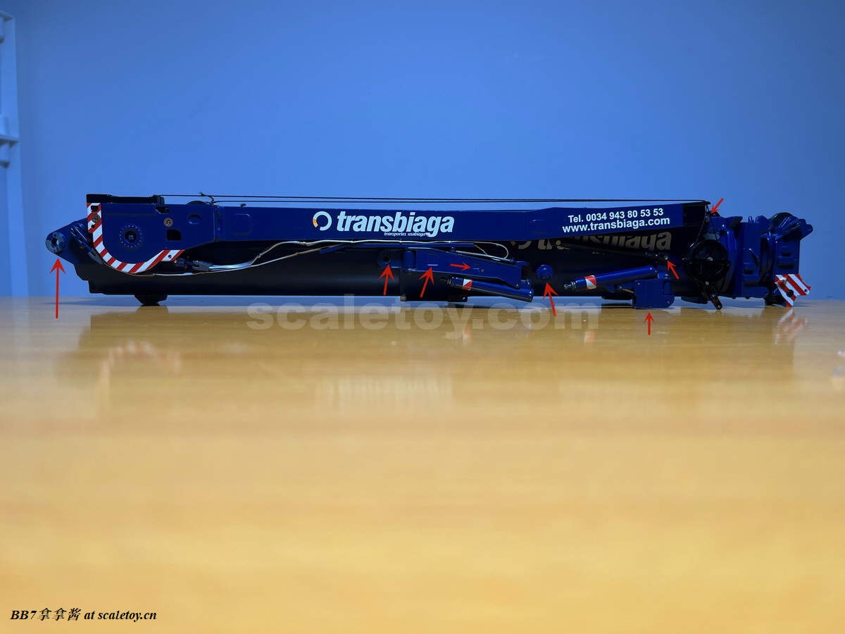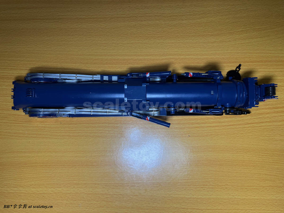 再来看看主臂基本臂。纯色的涂装,漆面优秀,整体细节比较少,重量到是非常可观。我的主臂顶部漆面龟裂严重,但到是没有橘皮和漆面变脆掉漆的现象,感觉像是外部保护漆包住了内部受损的漆面。不知道是不是个例,因为我存放环境比较潮湿,而且主臂上方长期被重物压着。涂装方面公司移印清晰锐利。细节方面没有任何油管和盖板(11200实车主臂就比较简洁,油管不少都用盖板包住了),结构加强筋也是没有刻画,一些固定位点和标识也是毫无刻画,上方四个吊耳也是实心不可用,属于糊弄细节,良好示范可以参考ycc的1800,吊耳可用。主臂上方的三个单杠插销检修口到是有所刻画,两个忠于实车,一个主臂根部检修口刻画错误,只能说nzg还有一些良心,不至于做出康拉德废铁厂那样的大光棍主臂。可以看到主臂左侧前端的油管绞盘是一个黑色成型色的塑料件,毫无细节和分色,效果一般,后侧小一点的蓝色电线绞盘视觉效果更是差,虽然喷了漆,但是塑料合模线明显,水口粗犷,绞盘上没有缠绕管线。主臂右侧的一个电线绞盘,同样的设计,同样的糟糕,而且这几个绞盘是胶水粘接比较容易碰掉,需要小心。接下来看主臂中段的超起拉索托架,同样是塑料,中规中矩,除了太厚,观感没大问题,但是胶水粘的容易掉,而且和后侧主臂支腿产生干涉。移动支腿的时候小心把托架扯下来(笑)。再看主臂和油缸连接处,使用一个大的金属原色一字螺丝连接,组装非常轻松,油缸和主臂连接紧实无虚位。但是缺乏管线,保护框架,和销钉自安装系统,细节稍显空洞。把主臂翻过来可以看到毫无细节,缺乏管线和下方的探照灯。主臂尾部结构有所刻画,同时能看到所有内部合金原色的伸缩臂。缺乏的是大量油管和接头细节,螺丝铆钉细节刻画,和中间的一个油管总成快拆结构。主臂末端的导缆滚轮一如既往的是一体铸造无功能。臂根和上车连接的地方也没有安装不锈钢或者铝垫片或者脱漆处理,会被直接磨掉漆,比较丑陋,良好的示范同样参考ycc的1800。另外值得注意的是,早期型11200实车主臂上方是没有黑色防滑步道的,后续版本才有所增加,不过模型是统一从28号松浦才开始有黑色防滑步道。可以对比一下,nzg还是比较细心的,主臂黑色防滑步道位置全部正确,仅仅缺少了边上的几个。最后来看一下四个主臂支腿,总体而言把玩方面是可以的,虽然看着细,但是完全能稳定支撑主臂重量。不好的地方是四个支腿比较松,只有前支腿的固定位点比较可靠,后支腿在抬起主臂时会自己打开很难固定,摆pose比较烦心。而且抬升油缸不能很好收起,会有下垂,原因还是塑料顶出油缸支持力不够。总而言之就是这四个支腿也是松松垮垮的虚位很大,所以当支腿油缸完全伸出支撑主臂时一定要摆正支腿,保证力线垂直,否则油缸容易断。另外很多人不知道的是,四个油缸仅仅是用一根长销钉固定,取下来十分方便,可以还原不携带主臂顶升油缸的场景(国内的11200喜欢这么干),非常好评。去掉顶升油缸的主臂实际上看起来还会更干净简洁。有很多人不知道后支腿上这根金属杆是干什么的,其实这是固定后支腿位置的,理论上应该插入后方这个孔里,但模型上好像不太方便操作。看回细节方面,这四个支腿可以说毫无细节,刻线,浮雕,镂空,管线,分件,蚀刻片,标识全部缺失,每个支腿几乎就两个零件——一个横向支腿,一个主臂顶升油缸。最大的槽点是油缸外套筒顶端居然没有做封闭处理,还莫名其妙的加了两个销钉,非常出戏。我实在是没理解这设计的是什么,简直太乱来了,首先不是因为内层油缸太长需要开孔,很明显也不是工艺问题,因为nzg甚至很贴心的在开孔内部安装了挡板!所以是完全看不到内部螺纹和油缸的,但是就是留了一个开孔!(恼)