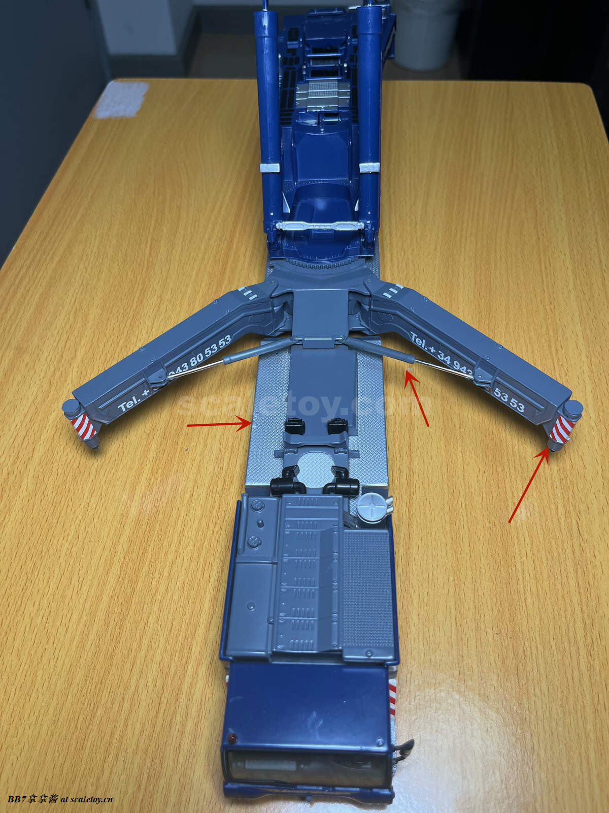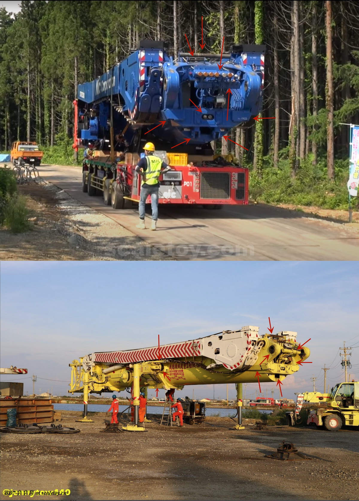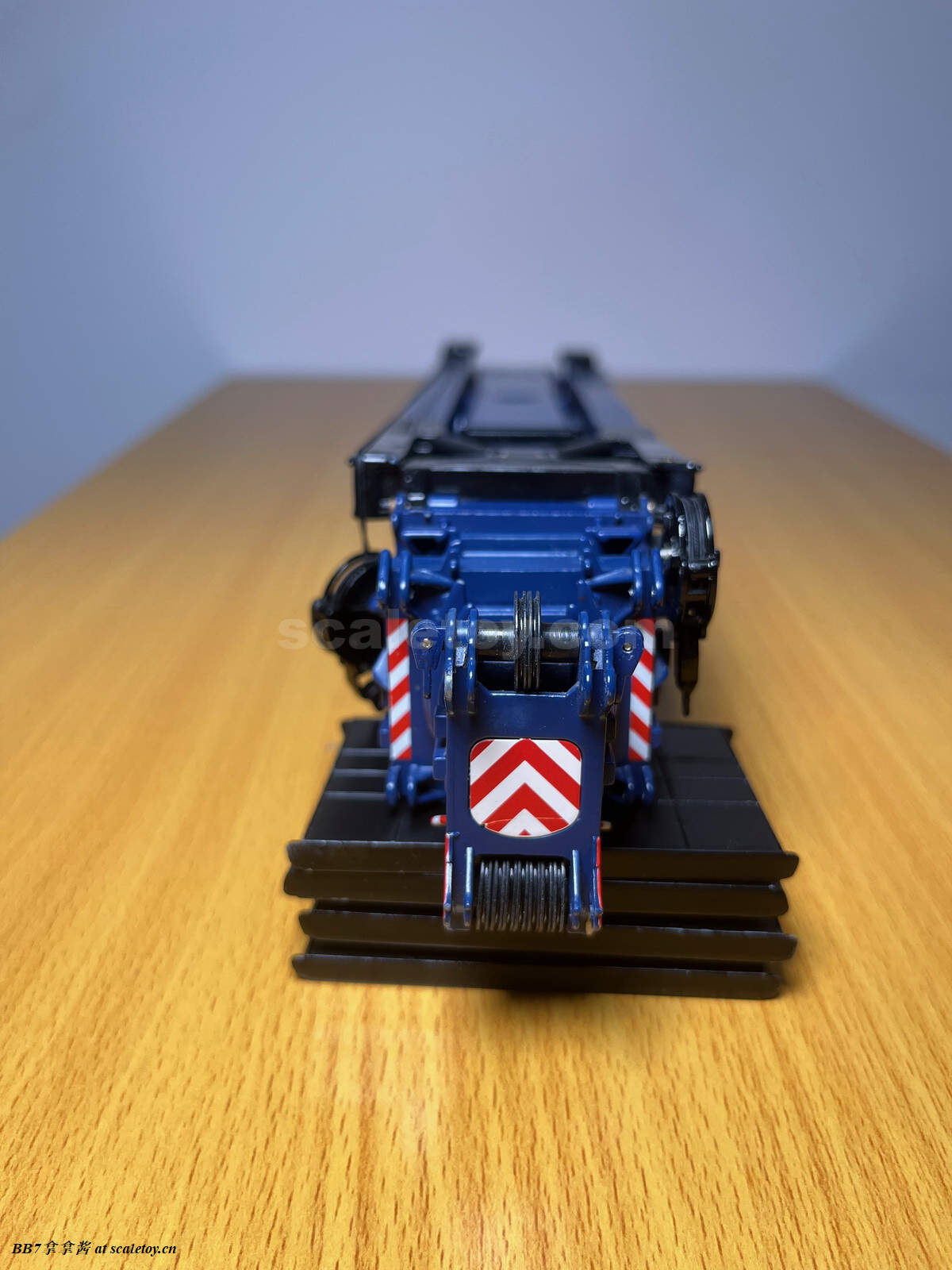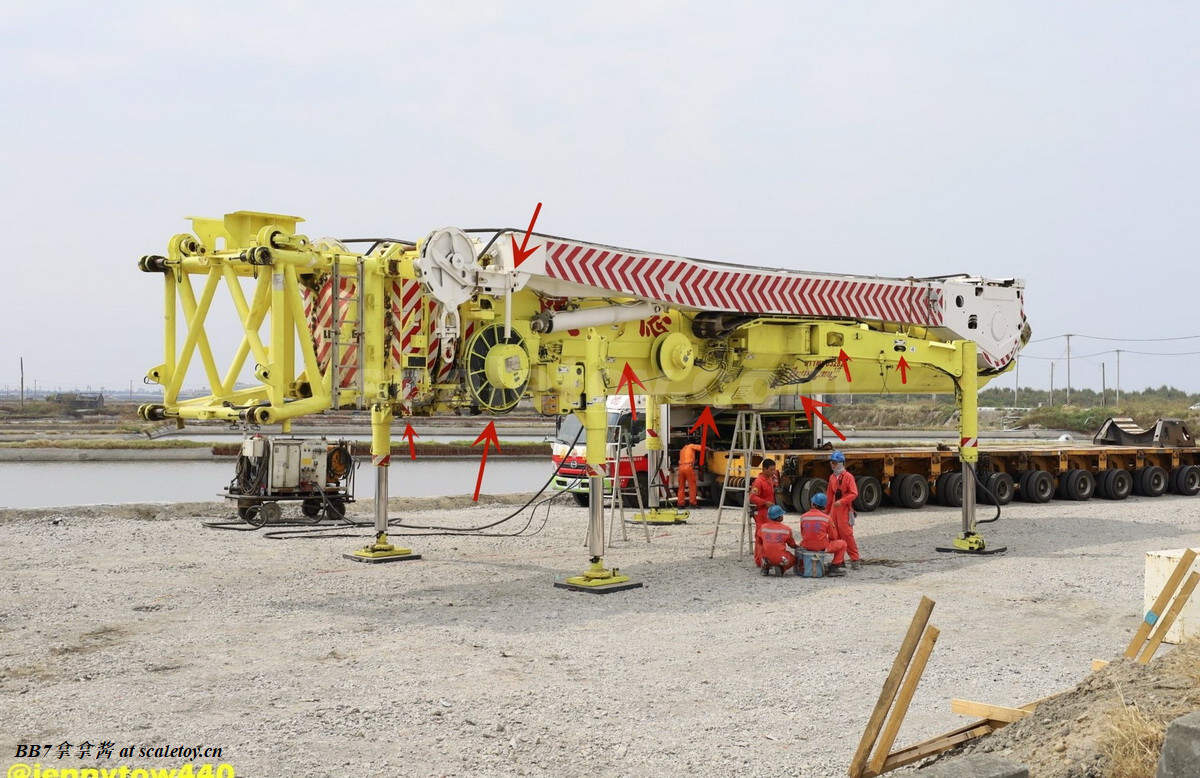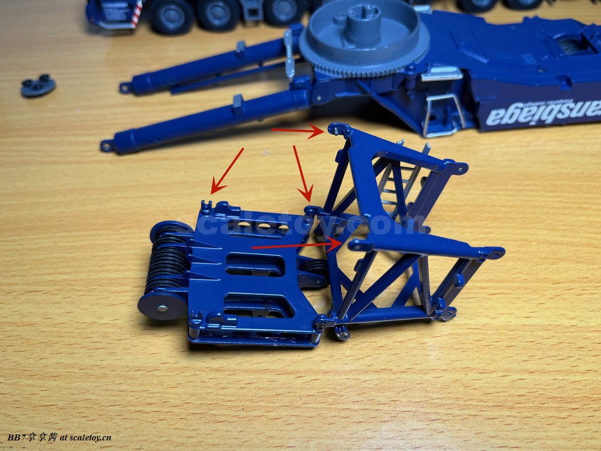 再来看看主臂基本臂。纯色的涂装,漆面优秀,整体细节比较少,重量到是非常可观。我的主臂顶部漆面龟裂严重,但到是没有橘皮和漆面变脆掉漆的现象,感觉像是外部保护漆包住了内部受损的漆面。不知道是不是个例,因为我存放环境比较潮湿,而且主臂上方长期被重物压着。涂装方面公司移印清晰锐利。细节方面没有任何油管和盖板(11200实车主臂就比较简洁,油管不少都用盖板包住了),结构加强筋也是没有刻画,一些固定位点和标识也是毫无刻画,上方四个吊耳也是实心不可用,属于糊弄细节,良好示范可以参考ycc的1800,吊耳可用。主臂上方的三个单杠插销检修口到是有所刻画,两个忠于实车,一个主臂根部检修口刻画错误,只能说nzg还有一些良心,不至于做出康拉德废铁厂那样的大光棍主臂。可以看到主臂左侧前端的油管绞盘是一个黑色成型色的塑料件,毫无细节和分色,效果一般,后侧小一点的蓝色电线绞盘视觉效果更是差,虽然喷了漆,但是塑料合模线明显,水口粗犷,绞盘上没有缠绕管线。主臂右侧的一个电线绞盘,同样的设计,同样的糟糕,而且这几个绞盘是胶水粘接比较容易碰掉,需要小心。接下来看主臂中段的超起拉索托架,同样是塑料,中规中矩,除了太厚,观感没大问题,但是胶水粘的容易掉,而且和后侧主臂支腿产生干涉。移动支腿的时候小心把托架扯下来(笑)。再看主臂和油缸连接处,使用一个大的金属原色一字螺丝连接,组装非常轻松,油缸和主臂连接紧实无虚位。但是缺乏管线,保护框架,和销钉自安装系统,细节稍显空洞。把主臂翻过来可以看到毫无细节,缺乏管线和下方的探照灯。主臂尾部结构有所刻画,同时能看到所有内部合金原色的伸缩臂。缺乏的是大量油管和接头细节,螺丝铆钉细节刻画,和中间的一个油管总成快拆结构。主臂末端的导缆滚轮一如既往的是一体铸造无功能。臂根和上车连接的地方也没有安装不锈钢或者铝垫片或者脱漆处理,会被直接磨掉漆,比较丑陋,良好的示范同样参考ycc的1800。另外值得注意的是,早期型11200实车主臂上方是没有黑色防滑步道的,后续版本才有所增加,不过模型是统一从28号松浦才开始有黑色防滑步道。可以对比一下,nzg还是比较细心的,主臂黑色防滑步道位置全部正确,仅仅缺少了边上的几个。最后来看一下四个主臂支腿,总体而言把玩方面是可以的,虽然看着细,但是完全能稳定支撑主臂重量。不好的地方是四个支腿比较松,只有前支腿的固定位点比较可靠,后支腿在抬起主臂时会自己打开很难固定,摆pose比较烦心。而且抬升油缸不能很好收起,会有下垂,原因还是塑料顶出油缸支持力不够。总而言之就是这四个支腿也是松松垮垮的虚位很大,所以当支腿油缸完全伸出支撑主臂时一定要摆正支腿,保证力线垂直,否则油缸容易断。另外很多人不知道的是,四个油缸仅仅是用一根长销钉固定,取下来十分方便,可以还原不携带主臂顶升油缸的场景(国内的11200喜欢这么干),非常好评。去掉顶升油缸的主臂实际上看起来还会更干净简洁。有很多人不知道后支腿上这根金属杆是干什么的,其实这是固定后支腿位置的,理论上应该插入后方这个孔里,但模型上好像不太方便操作。看回细节方面,这四个支腿可以说毫无细节,刻线,浮雕,镂空,管线,分件,蚀刻片,标识全部缺失,每个支腿几乎就两个零件——一个横向支腿,一个主臂顶升油缸。最大的槽点是油缸外套筒顶端居然没有做封闭处理,还莫名其妙的加了两个销钉,非常出戏。我实在是没理解这设计的是什么,简直太乱来了,首先不是因为内层油缸太长需要开孔,很明显也不是工艺问题,因为nzg甚至很贴心的在开孔内部安装了挡板!所以是完全看不到内部螺纹和油缸的,但是就是留了一个开孔!(恼)