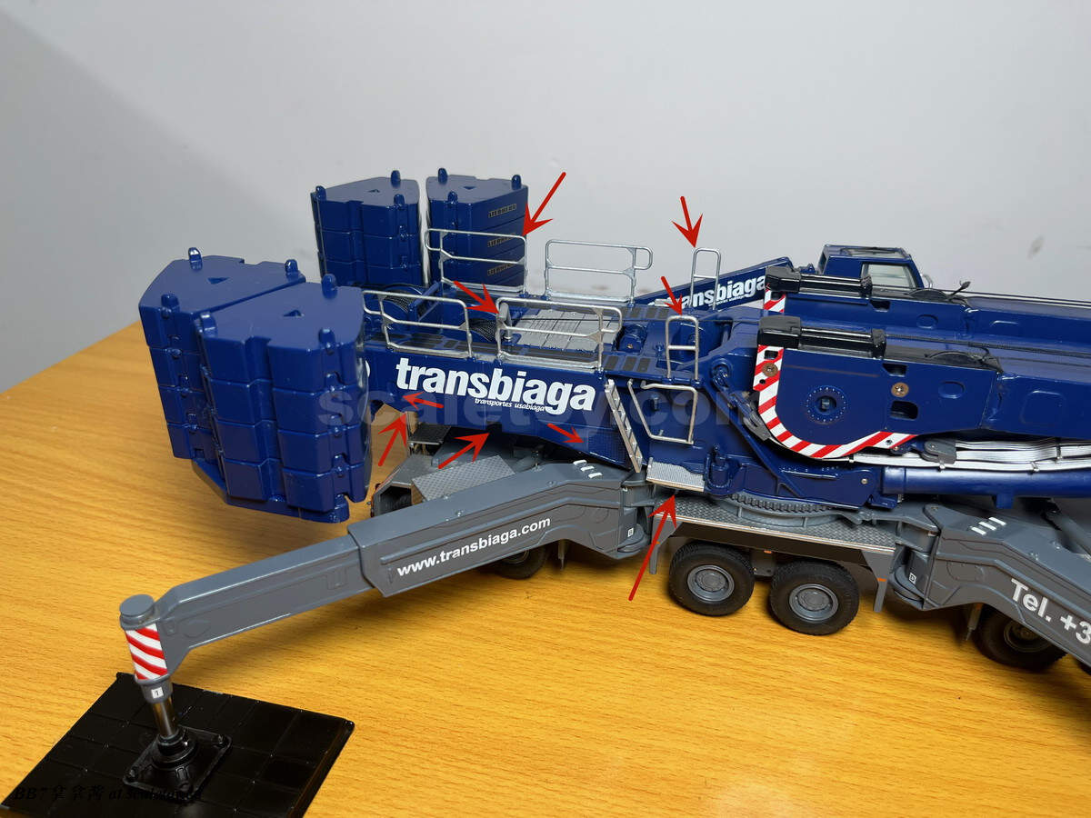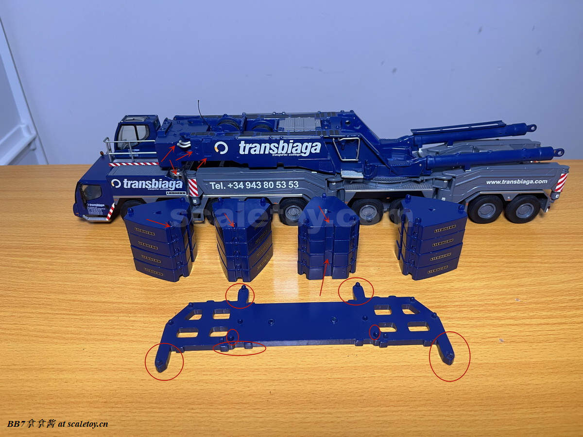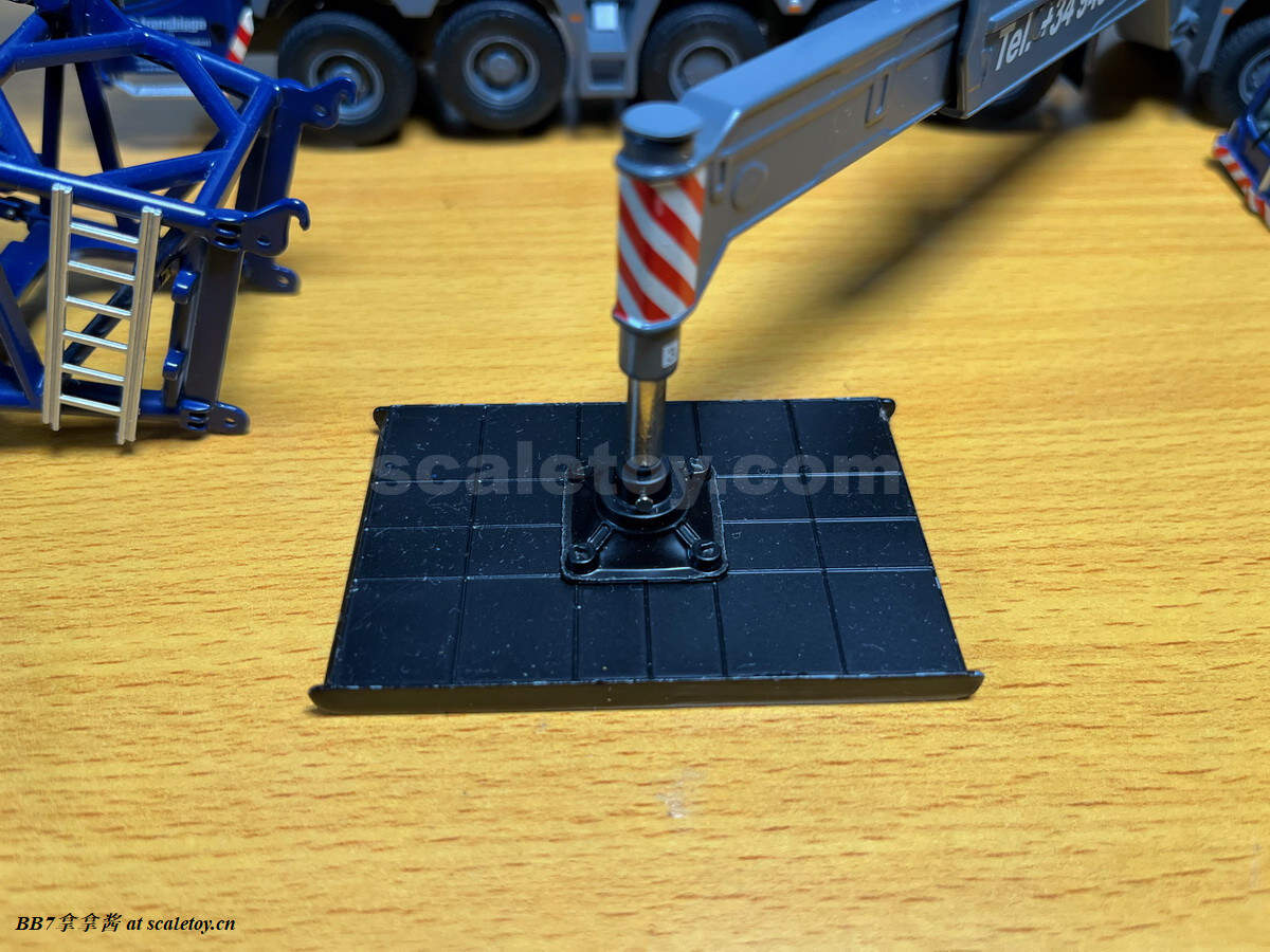 现在来看一下配重和托盘。给了16个10t配重,比较坑的是nzg没有做5t配重,所以原厂状态下是少20t配重的,几乎是强制玩家去买ycc(不禁让人怀疑nzg是不是和ycc串通好了啊)。同时nzg这个配重也只能说做的比较简单,只有一个大致形状,三个吊耳都是浮雕不可用,背后凹槽里的爬梯也没有表现,可用的吊耳和爬梯扶手这一块就连废铁厂的配重都有所表现啊,nzg太拉了(悲)。配重中心吊装孔的盖板也没有提供,横向对比wsi的1750就提供了这个配件。配重侧面海尔标志清晰板正,漆面光滑平整无颗粒。我尝试了一下,就算是把16个配重全部堆成一摞,仍然非常笔直,说明漆面很平整,公差很小。举个例子,废铁厂的配重堆太高就会因为漆面不平整而歪(笑)。再来看配重托盘这一块,可以说也是个大败笔了,功能和观感都比较简单,比较令人失望。首先是没有任何浮雕刻线细节,没有警示标记移印,没有自提升绳索固定位点的刻画。糟糕的是,托盘上可以旋转的支撑也没有实现,对比下来同样的机构wsi的1750就实现的很好。在11200这里你只能选择买ycc改件。更糟的是,这个配重托盘上凭空多了一个真车不存在的固定位点,引起干涉,导致配重无法实现实车的单摞放置,三角形尖头朝外。最令人不解的是连ycc出的改件也没有纠正这个错误,非常糟心。可能这个工况比较鸡肋大家用得不多就不在意吧……可以看到,ycc不但保留了那个错误的位点,增加的可旋转支撑旋转方向还不对,在新增了四个可用的吊耳同时,仍然没有刻画自提升绳索的固定凹槽,可谓是太乱来了。糟心完了以后看看原厂的把玩方面,配重放置的很稳,托盘和上车用两颗大螺丝固定,安拆简易,非常稳定,算是仅有的慰藉了吧。