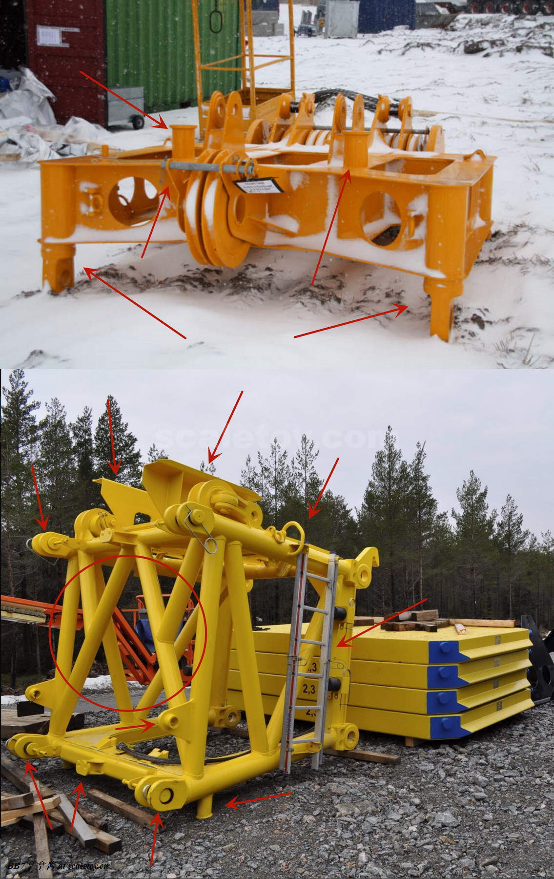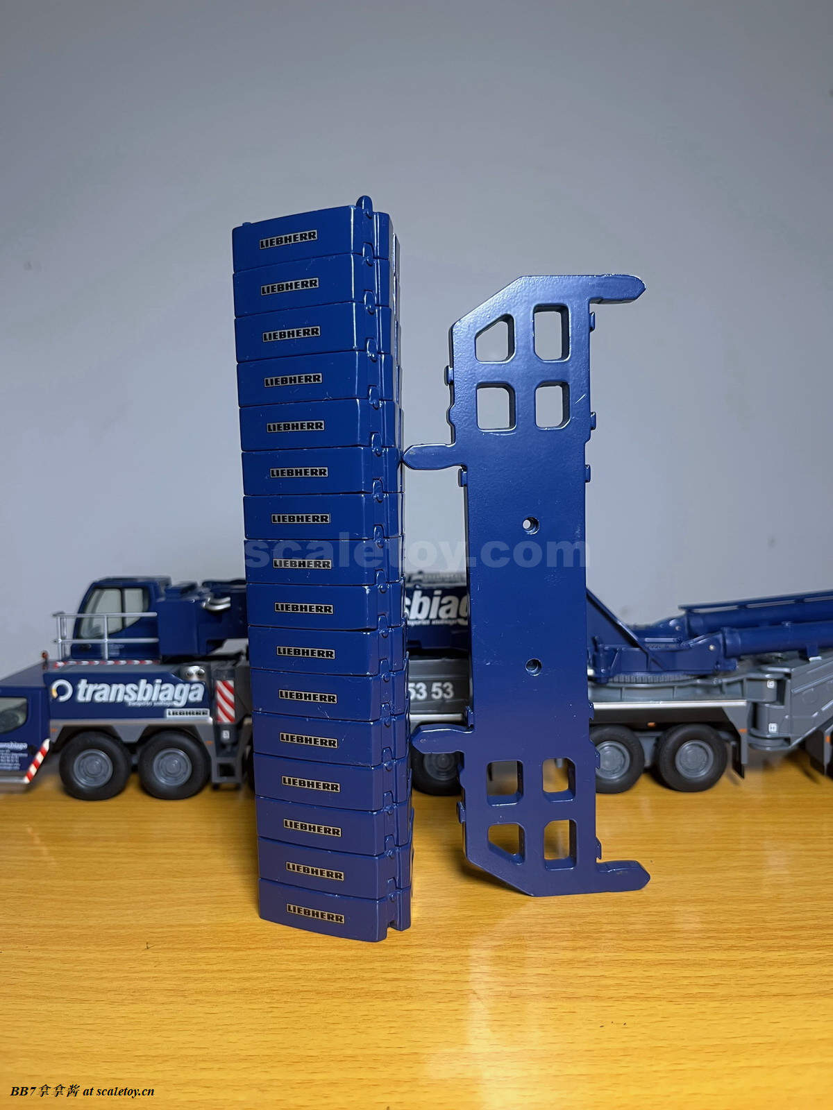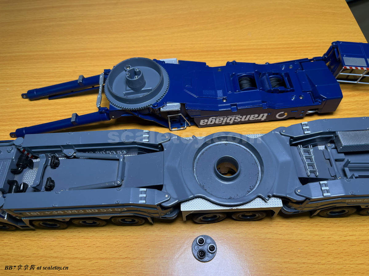 现在来看一下配重和托盘。给了16个10t配重,比较坑的是nzg没有做5t配重,所以原厂状态下是少20t配重的,几乎是强制玩家去买ycc(不禁让人怀疑nzg是不是和ycc串通好了啊)。同时nzg这个配重也只能说做的比较简单,只有一个大致形状,三个吊耳都是浮雕不可用,背后凹槽里的爬梯也没有表现,可用的吊耳和爬梯扶手这一块就连废铁厂的配重都有所表现啊,nzg太拉了(悲)。配重中心吊装孔的盖板也没有提供,横向对比wsi的1750就提供了这个配件。配重侧面海尔标志清晰板正,漆面光滑平整无颗粒。我尝试了一下,就算是把16个配重全部堆成一摞,仍然非常笔直,说明漆面很平整,公差很小。举个例子,废铁厂的配重堆太高就会因为漆面不平整而歪(笑)。再来看配重托盘这一块,可以说也是个大败笔了,功能和观感都比较简单,比较令人失望。首先是没有任何浮雕刻线细节,没有警示标记移印,没有自提升绳索固定位点的刻画。糟糕的是,托盘上可以旋转的支撑也没有实现,对比下来同样的机构wsi的1750就实现的很好。在11200这里你只能选择买ycc改件。更糟的是,这个配重托盘上凭空多了一个真车不存在的固定位点,引起干涉,导致配重无法实现实车的单摞放置,三角形尖头朝外。最令人不解的是连ycc出的改件也没有纠正这个错误,非常糟心。可能这个工况比较鸡肋大家用得不多就不在意吧……可以看到,ycc不但保留了那个错误的位点,增加的可旋转支撑旋转方向还不对,在新增了四个可用的吊耳同时,仍然没有刻画自提升绳索的固定凹槽,可谓是太乱来了。糟心完了以后看看原厂的把玩方面,配重放置的很稳,托盘和上车用两颗大螺丝固定,安拆简易,非常稳定,算是仅有的慰藉了吧。