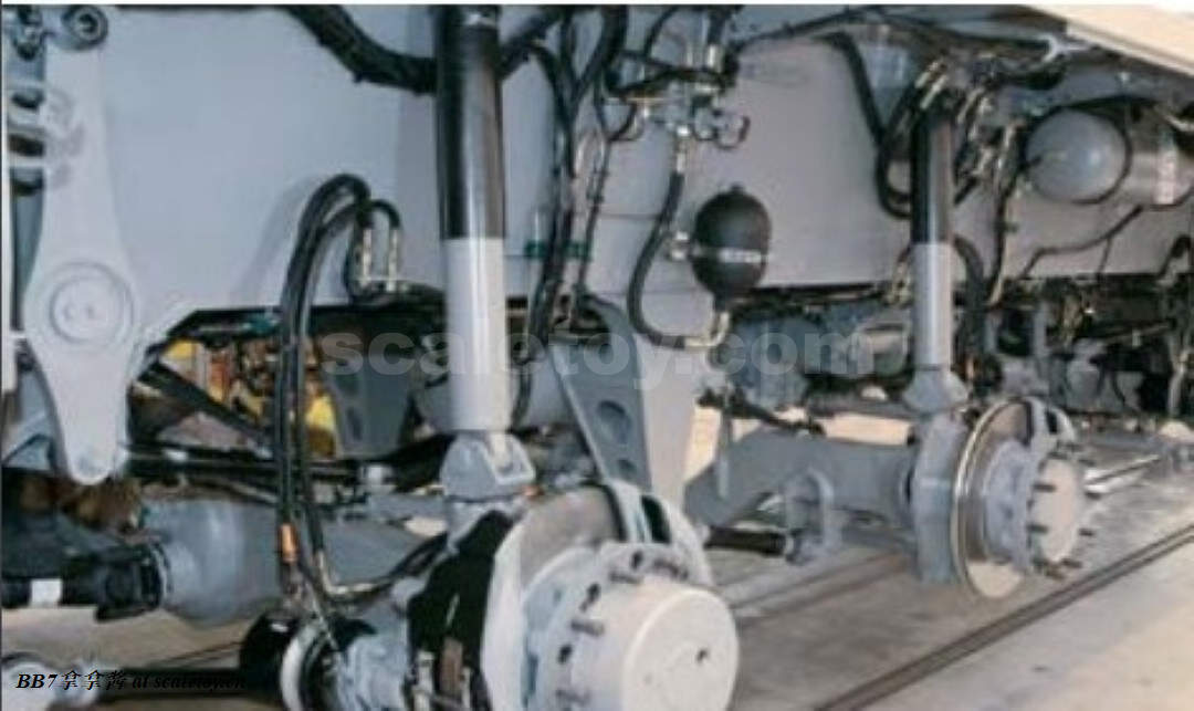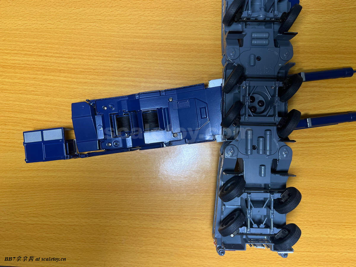 轮胎方面米其林浮雕清晰可见,表现力极佳,轮毂也有区分驱动轴和非驱动轴,刹车片散热孔则是实心的没有开孔有点可惜。挡泥板也都是硬质胶水粘接,没有使用软胶材质有点可惜,而且容易碰掉,我的已经掉了好几个了(悲)。底盘方面从细节上来说比较一般,一个小亮点是驾驶室下方的框架结构有所刻画而且是正确的,整体有一些基础但失真的悬挂刻画和气罐分件,也没有管线,但是功能性上非常强大,算得上是亮点。9轴全部自由无联动转向,角度巨大毫无干涉,摆pose是一等一的棒。弹簧悬挂虽然结构简单但是行程也很大,支持力也够用,没装主臂的情况下底盘还是能有风骚舞姿的。