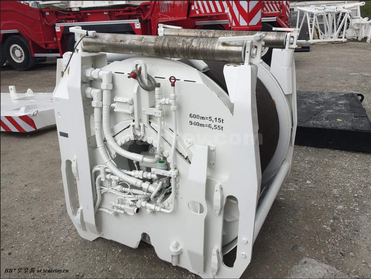 超起方面采用螺丝和主臂固定,牢靠没有虚位,但是不方便反复拆装,还有一个比较大的问题,油缸是铆钉固定在主臂上的,所以看来设计的时候没有考虑拆超起的玩法。这属于阉割工况,在吊车模型上来说是大问题,必须差评。超起滑轮托架是一个比较大的问题。首先模型上是一个单独的托架粘在基本臂上,比较容易掉。不过最大的问题是这个设计完全失真,实车滑轮托架和超起是一体的,完全没有固定在主臂上,同时滑轮托架还有支撑杆,这属于nzg设计上的偷懒,超起一塌糊涂,又是一个败笔。来看超起本身,油缸都是塑料,支持力是非常堪忧的,主臂直立的话,没拉绳子超起基本立不起来,整个超起况量比较大,给人感觉也是较为松垮,算是全车唯二松垮的地方,另一个是主臂支腿。细节方面稍微肉了点,可能是漆面比较厚的缘故。因为11200实车超起侧面就比较简洁,模型上也就很幸运的没有丢失太多侧面细节。超起缺少末端的一块突起盖板结构,一个该镂空的孔没有镂空。虽然侧面细节不错,但是底部又是一塌糊涂毫无细节,实车超起非对称设计,右侧超起底部前端有大量油管和接头,nzg又是直接无视,“取舍”掉了。再来看上端,卷扬开口边缘的导缆滚轮也没有分件实现,只有一个尺寸过小的浮雕刻画。由于左右合的结构,没有导缆滚轮直接导致超起绳子很容易卡进组合缝里,比较烦。超起末端两颗大螺丝外露,不太美观,而且旋转超起卷扬的大轴也直接外露,如果像ycc的车一样提供一块盖板会比较真实。我这台车上右侧超起卷扬旋转非常不顺,打开以后发现是卷扬上有金属毛刺,和锁止位点产生干涉,只能通过松开盖板螺丝缓解弹簧压力来解决,不知道是否通病。