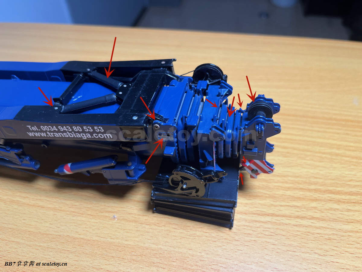 然后再来看主臂部分。首先看看第7节臂头,简单细节不多但是比较美观。两点原因,臂头没有wsi那种大到糟心的组合缝(臂头用一体铸造是非常正确的设计),滑轮非常漂亮,是精加工的弧度凹槽,滑轮壁非常薄,观感很好,不是imc,wsi那种粗加工方槽的五金通用件滑轮可以比的,这一点必须批评wsi和imc滑轮非常失真,表扬废铁厂现在的金属滑轮,也是曲线凹槽非常漂亮。臂头滑轮数量也是符合真车的下面7个上面2个,这一点算是非常基本需要做到的一点,做不到的模型只能说设计多少有点问题(没错说的就是你,废铁厂一众车和imc的ac450)。但是上面两个滑轮位置居中这是错误的,实车是偏左固定设计。再看桁架臂接口,也是忠实刻画结构,没有失真或者取舍。细节方面缺乏管线,防跳线杆,加强筋的浮雕刻线,风速计配件,油管,电线,导缆支架,吊耳和标识移印。同时绳索结尾的结构给了刻画却没有开孔不可用,这属于不及格操作了,不过对于一个2010年的模型就勉强接受了吧。现在的模型可用的绳索结尾器是标配了。