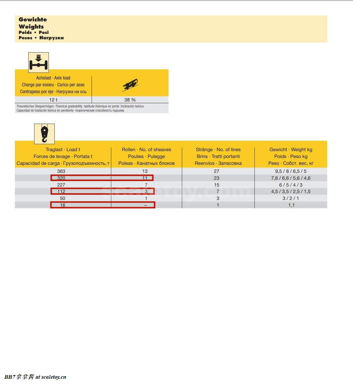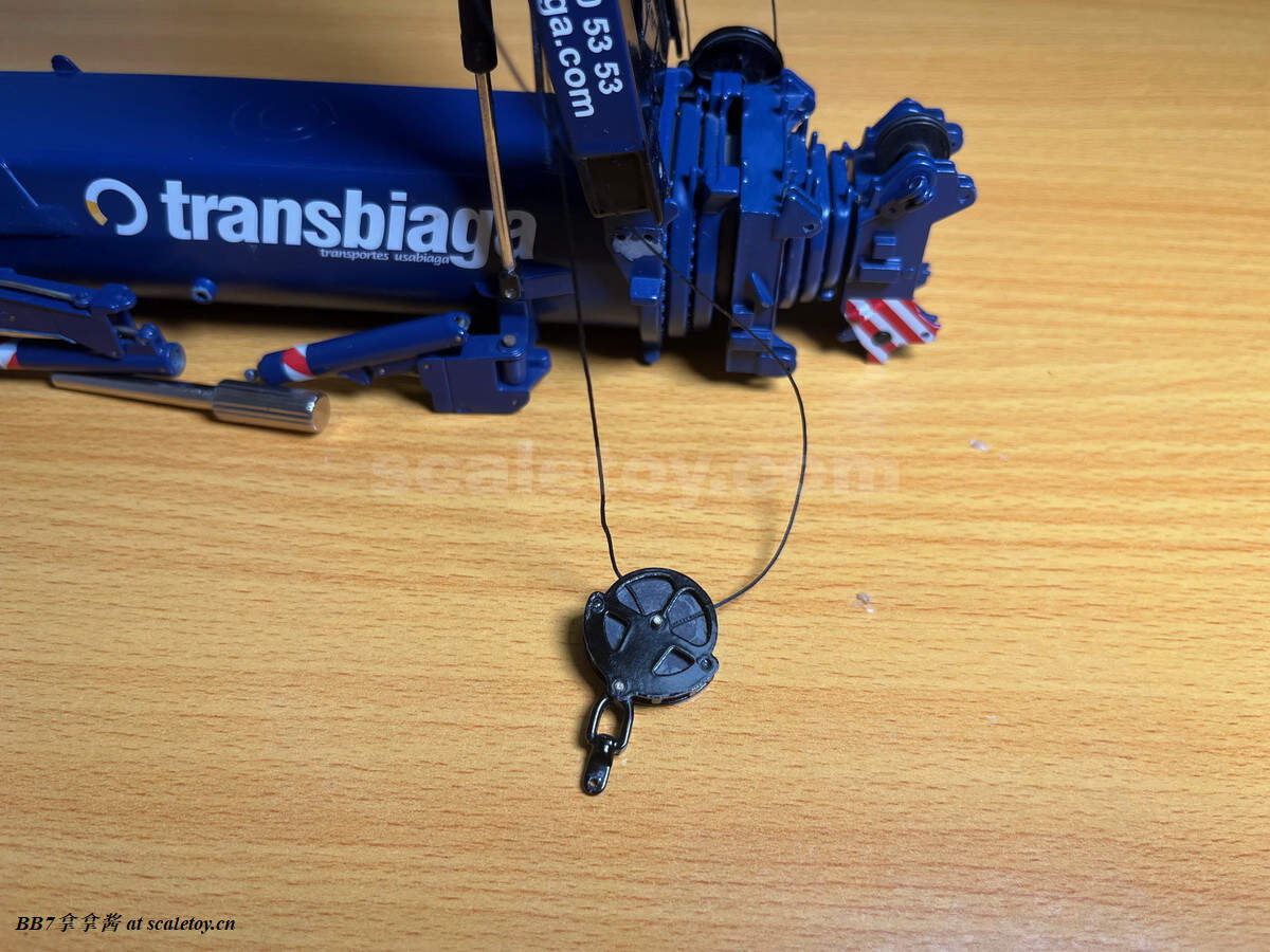 然后是三个钩子,一个11滑轮的320t钩子,一个3滑轮的112t钩子,一个16t的单线钩。很奇怪的是nzg给了一个11滑轮的钩子,而不是最大的13滑轮的363t钩子,导致重型臂头的滑轮用不完。这三个钩子总体来说属于标准水平,虽然没有ycc,twh那么精致,但比废铁厂粗制滥造的钩子确实是强了不止一个级别,所以说这三个钩子深得各路玩家的喜爱,你经常可以看见11200的钩子出现在各种其他吊车模型上。细节方面有一些浮雕刻线,配重有刻画但不可拆卸,防脱线杆没有实现,勾头的安全扣没有,大钩的钩头也没开孔(小钩真车没孔)。海尔标识印刷清晰,警示标识涂装清晰无溢色。功能方面勾头可以自由旋转,金属加螺丝,吊重物十分稳妥,滑轮顺滑,穿线相对简单,结尾孔也有刻画同时是可用的。总体中规中矩吧。