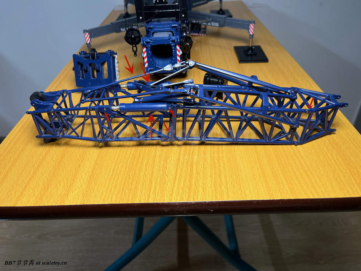 然后是一个2.7m的重型臂头,由一个2.2m的桁架接头和0.5m的滑轮臂头组成。臂头有13滑轮,品控非常良好,没有滑轮轴弯曲等等糟心问题,所有滑轮轻松转动,缝隙适中(这不是吊车模型必须做到的一点吗,没做到这一点的厂家在搞什么飞机啊)。有个小梯子,细节勉强不是零吧(笑)。缺少吊耳,标识,防跳线杆和超起连接处的挡板。很迷的一点是臂头和前面桁架连接的地方做了一个可以开合的设计,后方又是铆钉,只能说怪。而且这个结构也不符合实车,实车是正常的桁架连接结构。最后还有一个错误,2.2m转接头的末端实车有三角形的桁架结构,模型直接缺失了,没有表现。