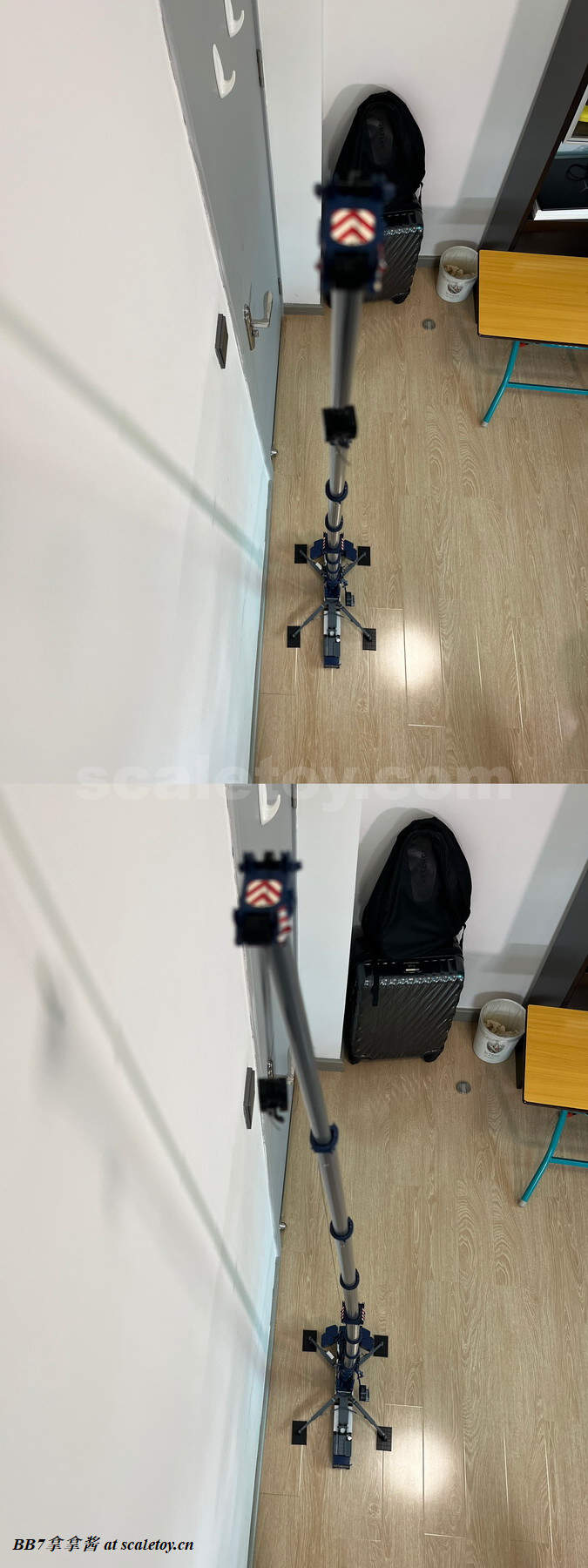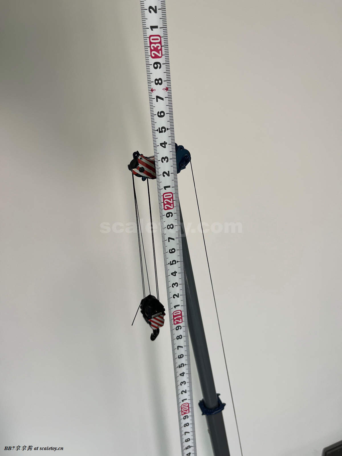 现在把主臂伸开,7节全伸,T7工况,效果还是相当不错的,非常震撼,尺寸很大,瞬间就有了实车的压迫感,毕竟100m主臂啊!整个主臂还是比较笔直的,之前心里担心主臂会断或者挠度很大,事实证明还是比较强大的,这还是没拉超起的情况。我这里是用了油缸第二个位点,也就是油缸角度不是最大,主臂仍然不是最高状态,但我还是测量了一下,高度达到了惊人的224cm,几乎是捅穿屋顶的高度了(笑)。不过显然转换成真车有112m了,真车只有104m,所以是哪里出了问题呢,我也没寻找……同时注意一下,可能为了保证良品率和不蹭漆,主臂虚位比较大,导致主臂会有侧弯,摆pose的时候细心调整一下就好。然后拉超起的时候也要注意两边拉力平衡,不要加剧主臂侧弯,同时超起不要拉太紧,不仅会主臂后仰非常不好看,而且后仰也会加剧侧弯。不买配件的话原车能组5个工况,T3,T3Y,T7,T7Y, T7YVEF/T7YVENZF。