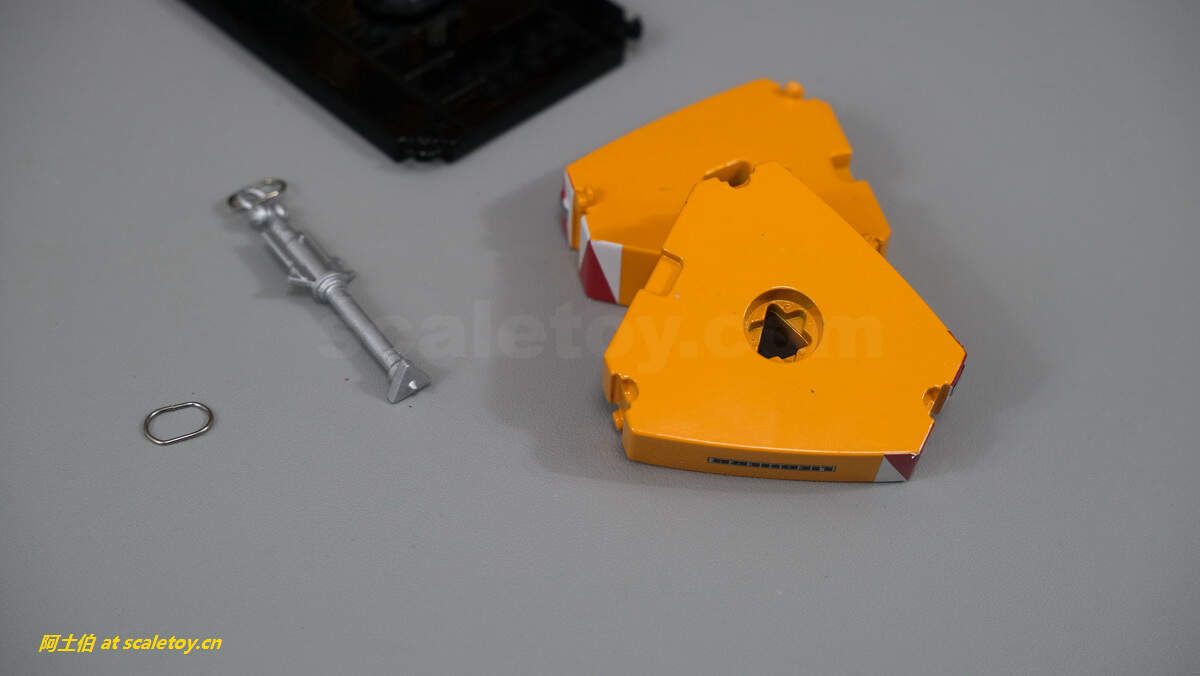 顺带看一下这个小附件(两侧各一个)可以在托盘转到最前方时,竖着插在托盘和中间件对齐的孔上,这是带配重运输时的锁定装置: