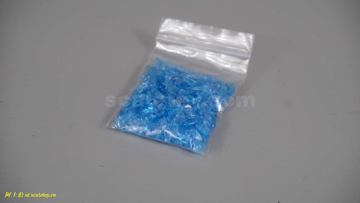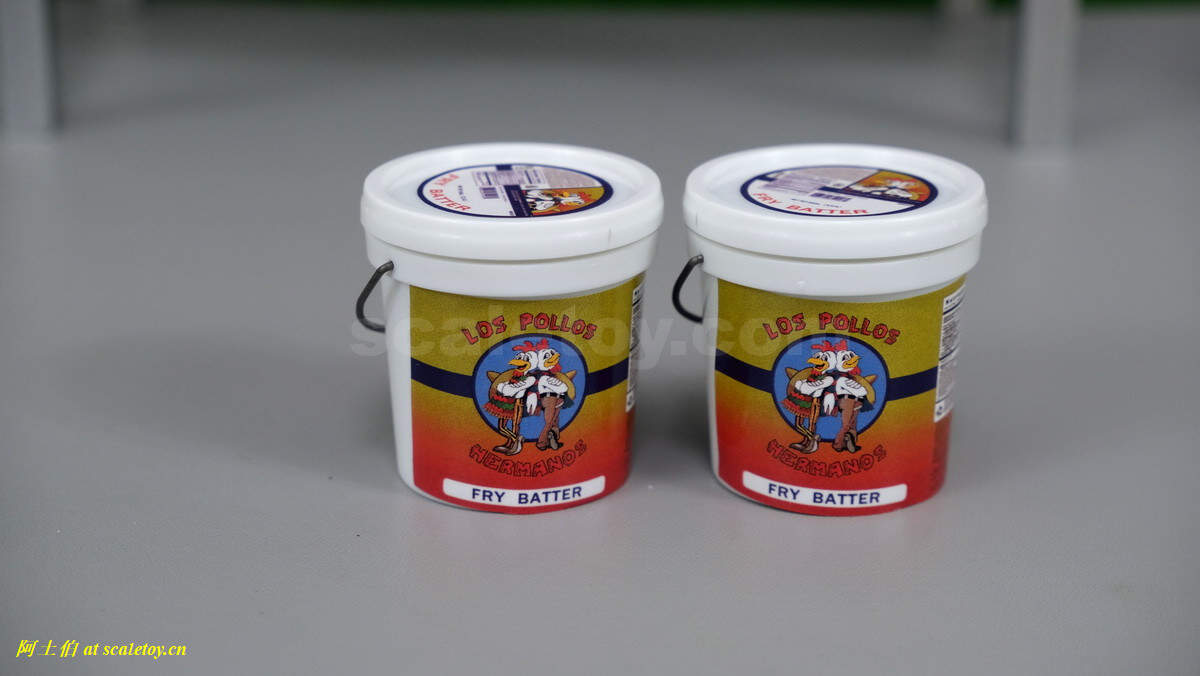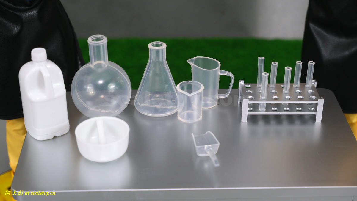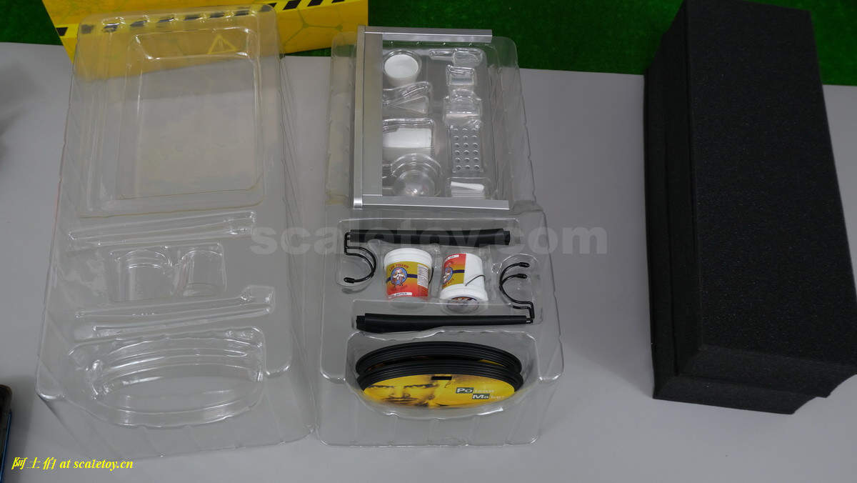 配件不少,一个桌子,化学实验的一套仪器,炸鸡店的两个桶,一包蓝色晶体,两个过滤面具,两个替换手型。