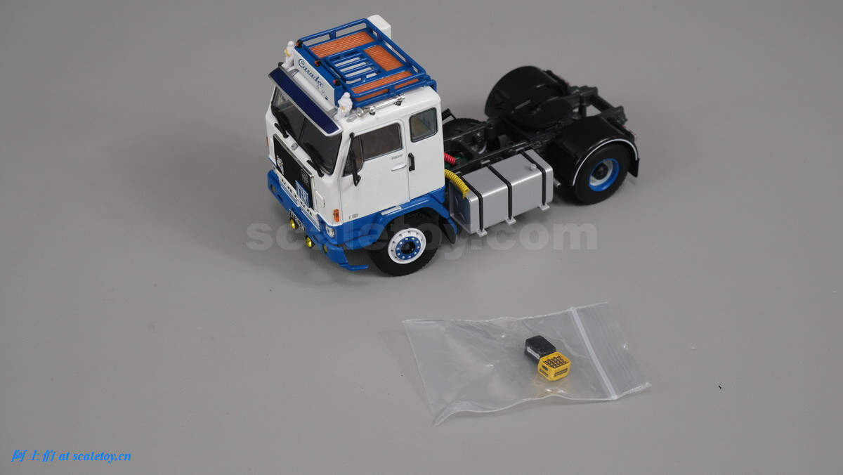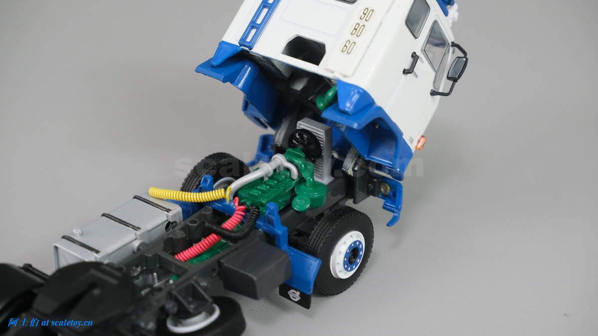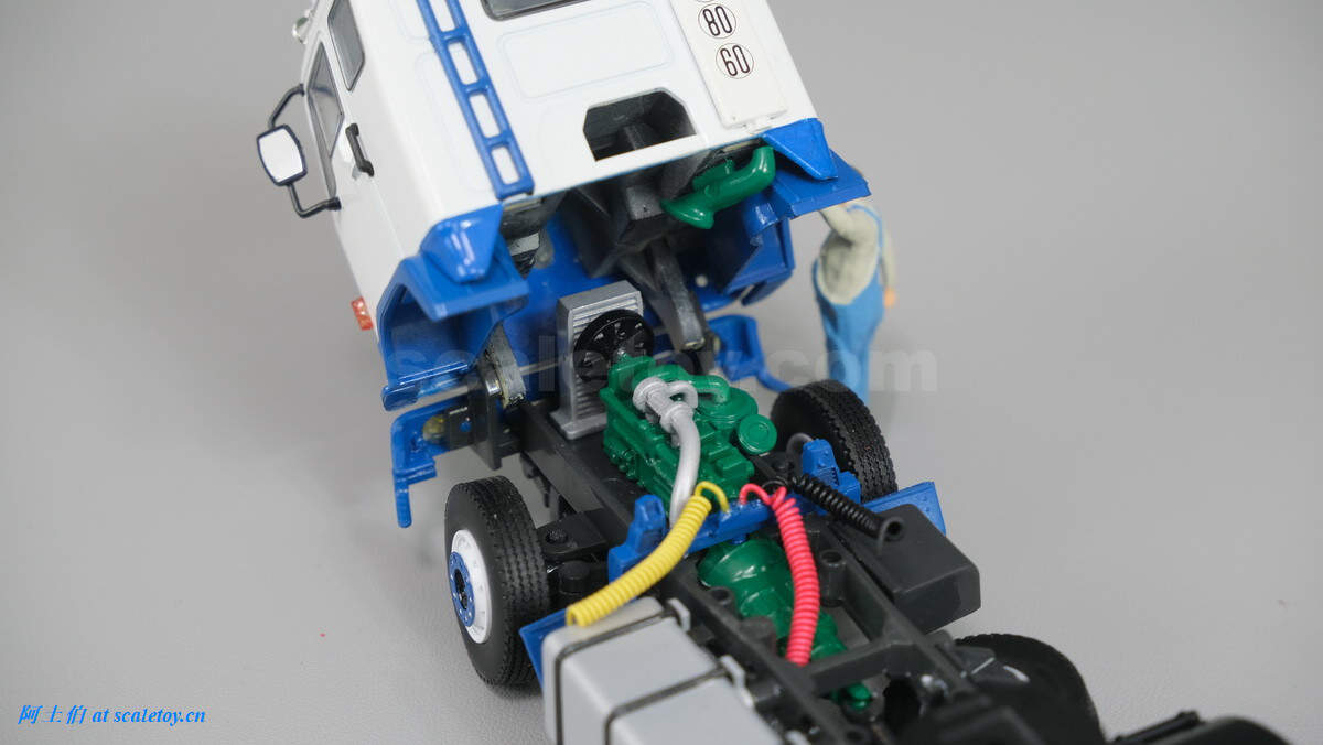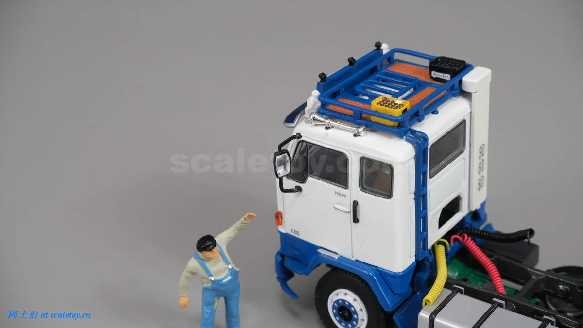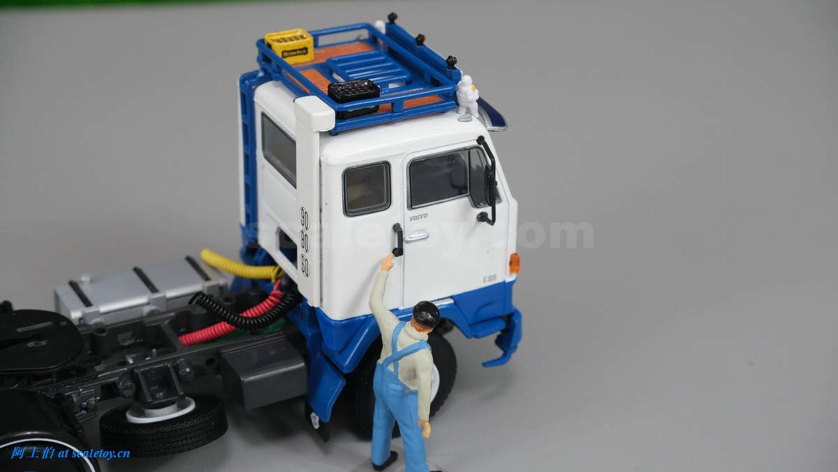 车辆顶部为储物框,额头为厂牌和米其林宝宝,遮阳板比较大。车内也有不错的分色细节表现。靠近地面的两个大黄灯很萌。