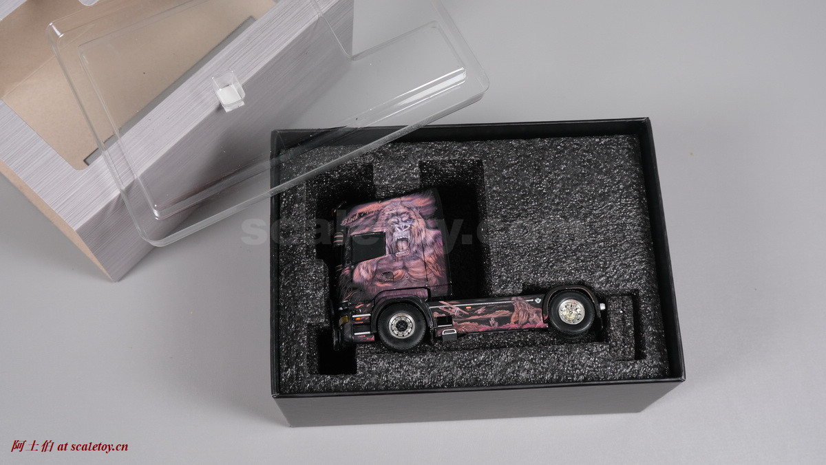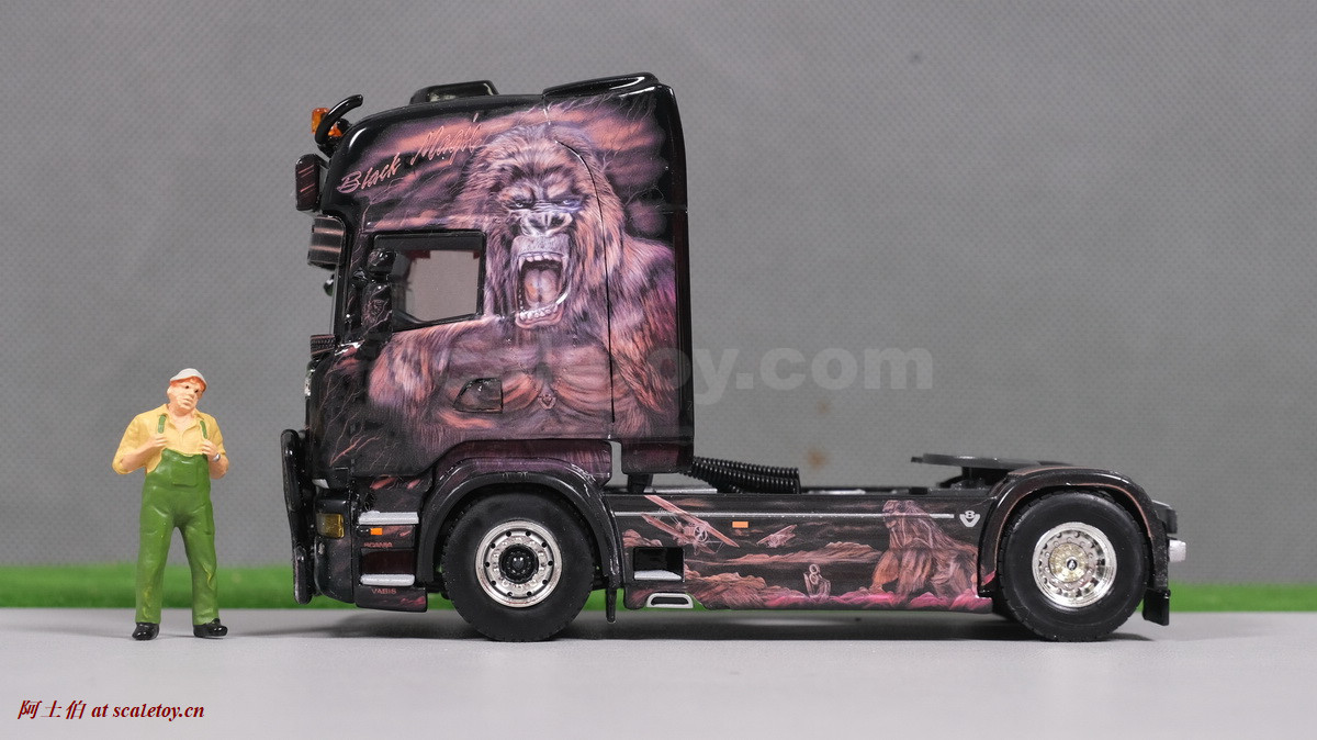 今天介绍的这款是斯堪尼亚的R6 STREAMLINE TOPLINE 4X2拖头,涂装是彩绘的大猩猩;但也没有很特别的其他信息,是否是金刚电影系列不确定。
