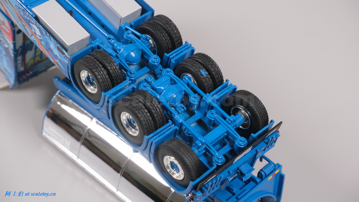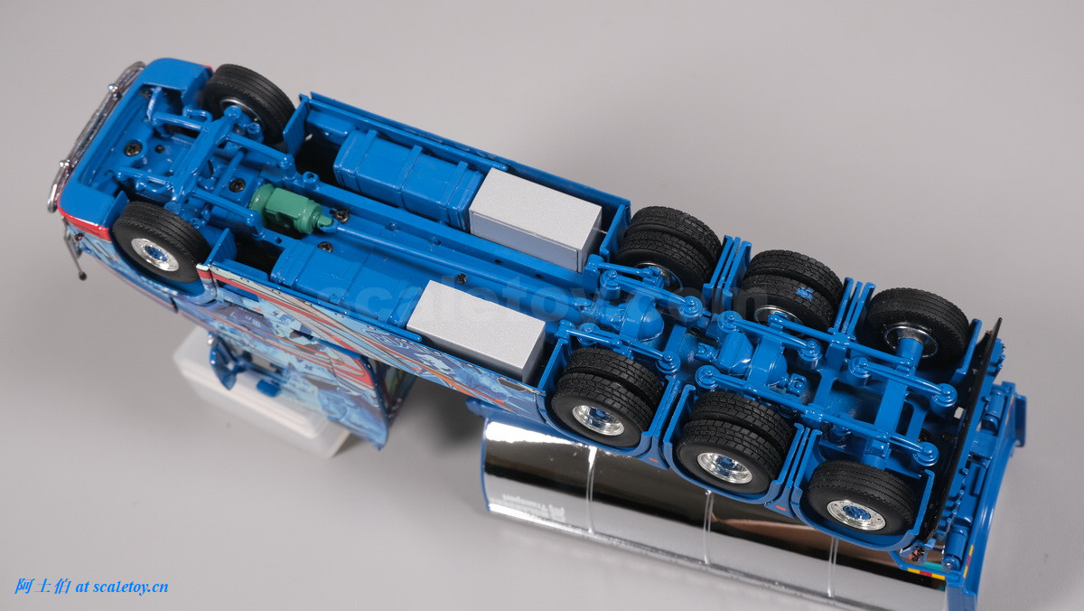 底盘。可以看到第四轴不能转向;二三轴是驱动胎纹,但是,但是,二三轴之间没有传动轴。。。