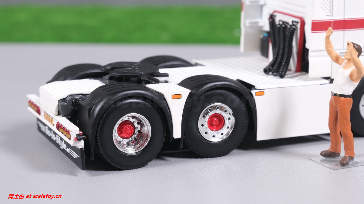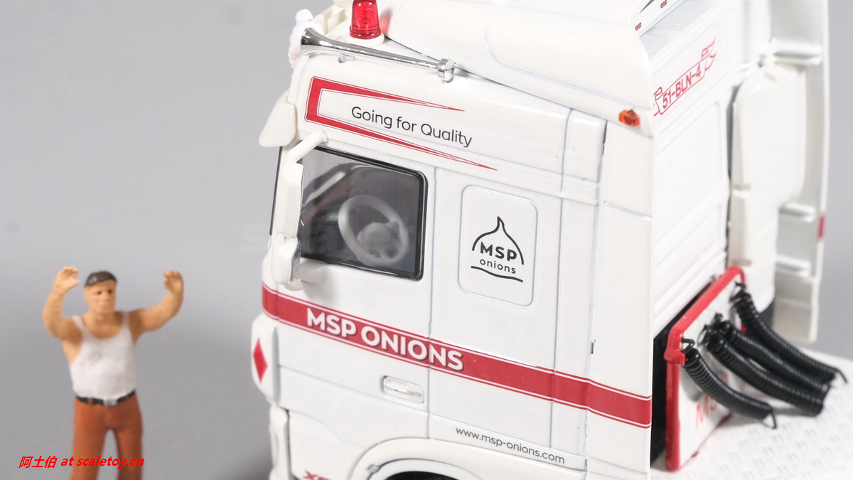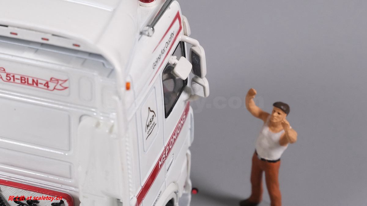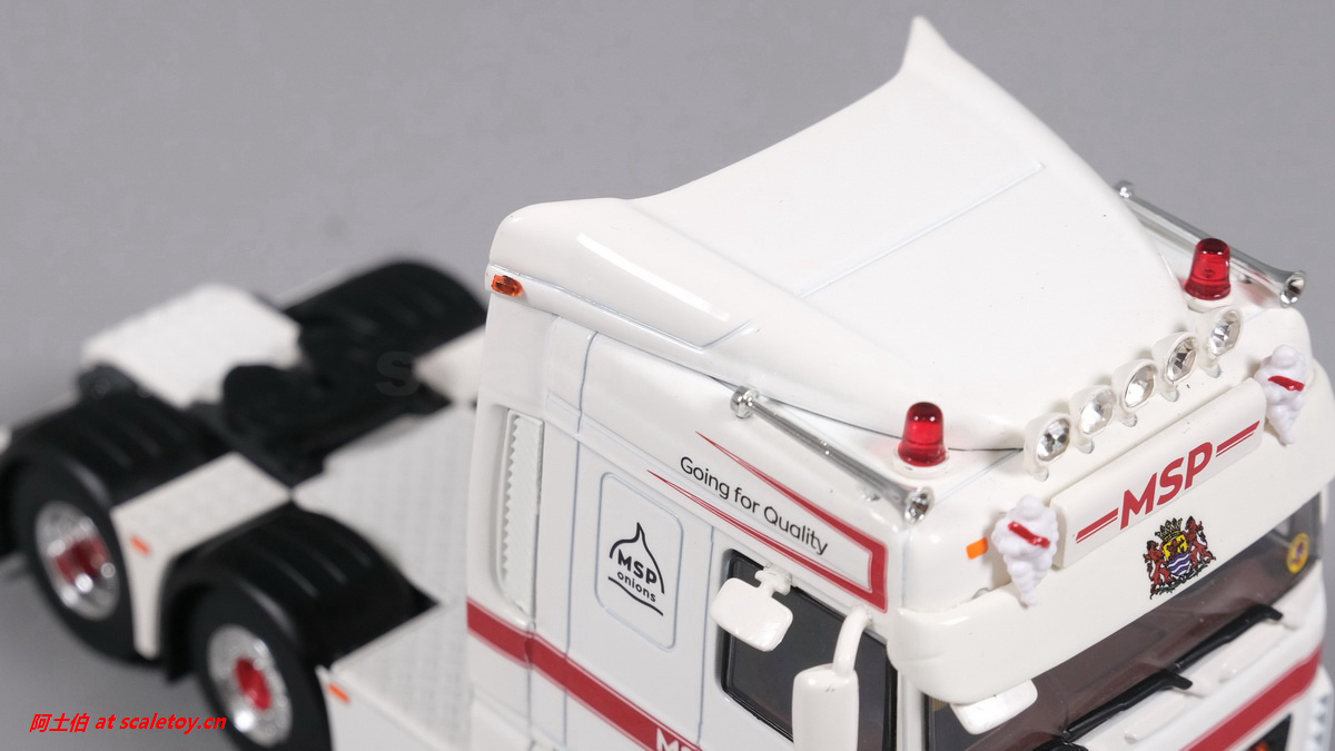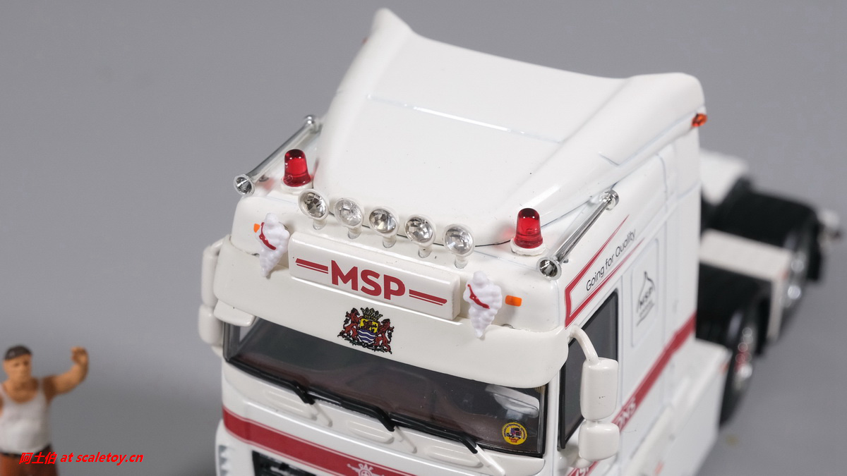 额头加装了头灯,厂牌灯箱两侧是米其林宝宝带绶带,遮阳帘、前档玻璃都有图案刻画。驾驶室内部分色表现。
