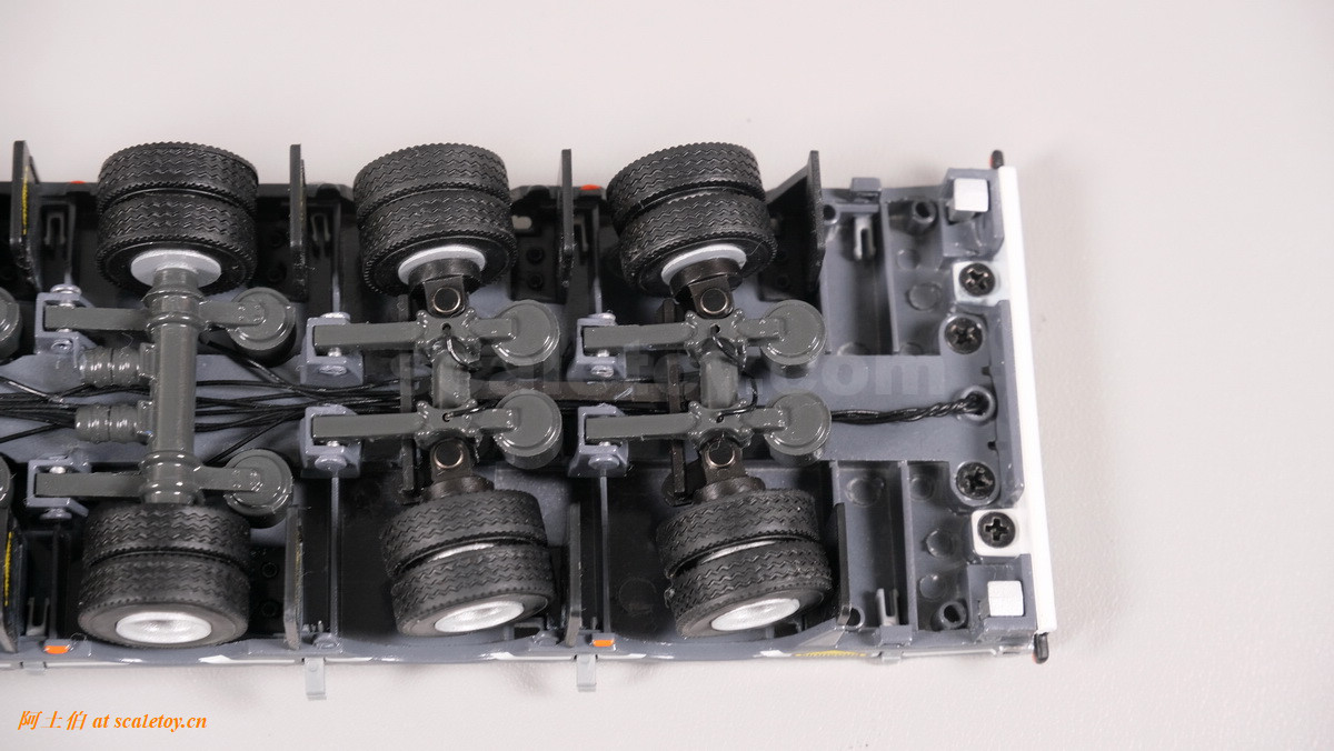 四轴,后两轴可转向联动,都带弹簧避震