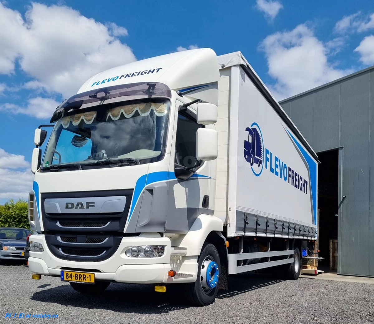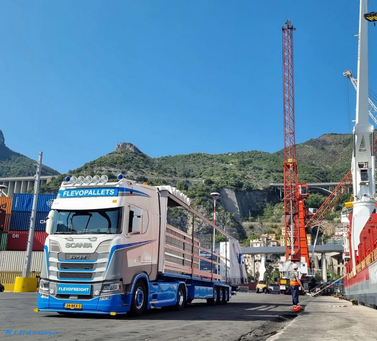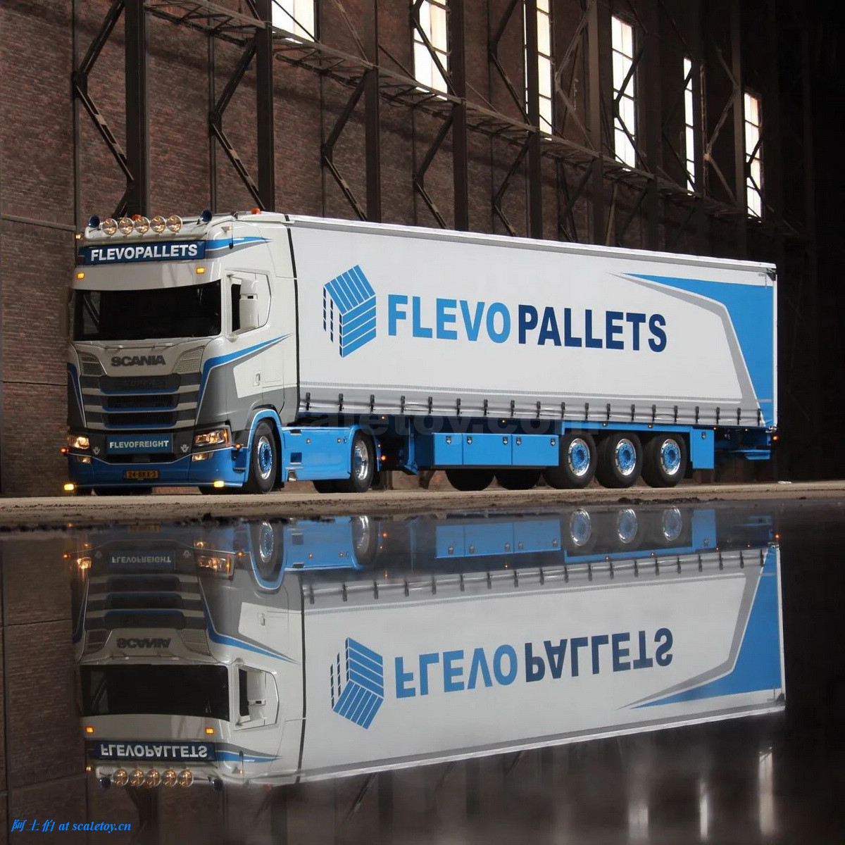 拖头,额头是FLEVOPALLETS,前脸的牌子写的是FLEVOFREIGHT字样,两不耽误。