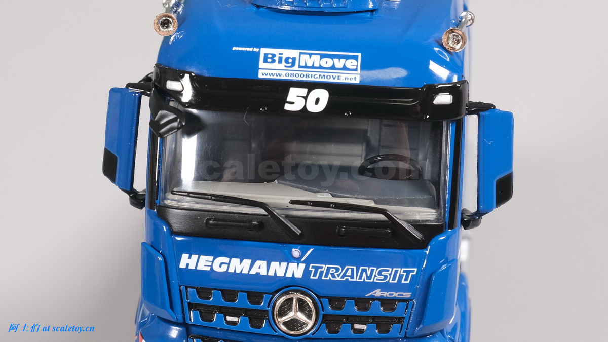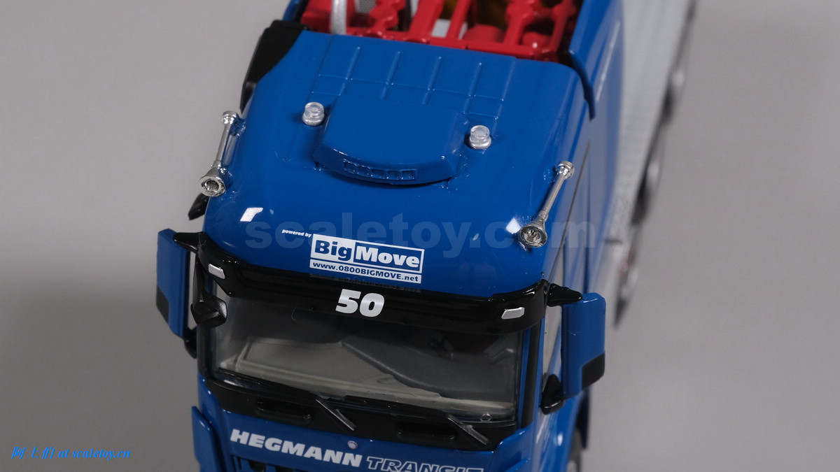 头顶,两颗警示灯位置比较独特。额头上有BIG MOVE组织的标记,遮阳帘上是Hegmann的车辆编号50。