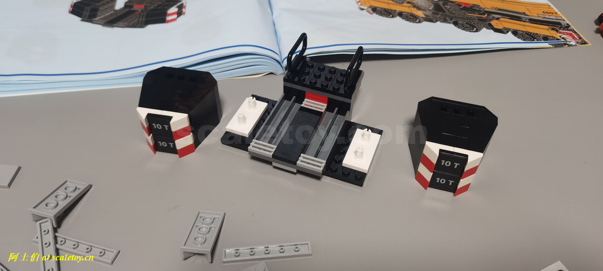 配重平台,四个10吨配重块。中间插槽开始不知道干嘛的,然后恍然大悟,原来是支腿垫板!