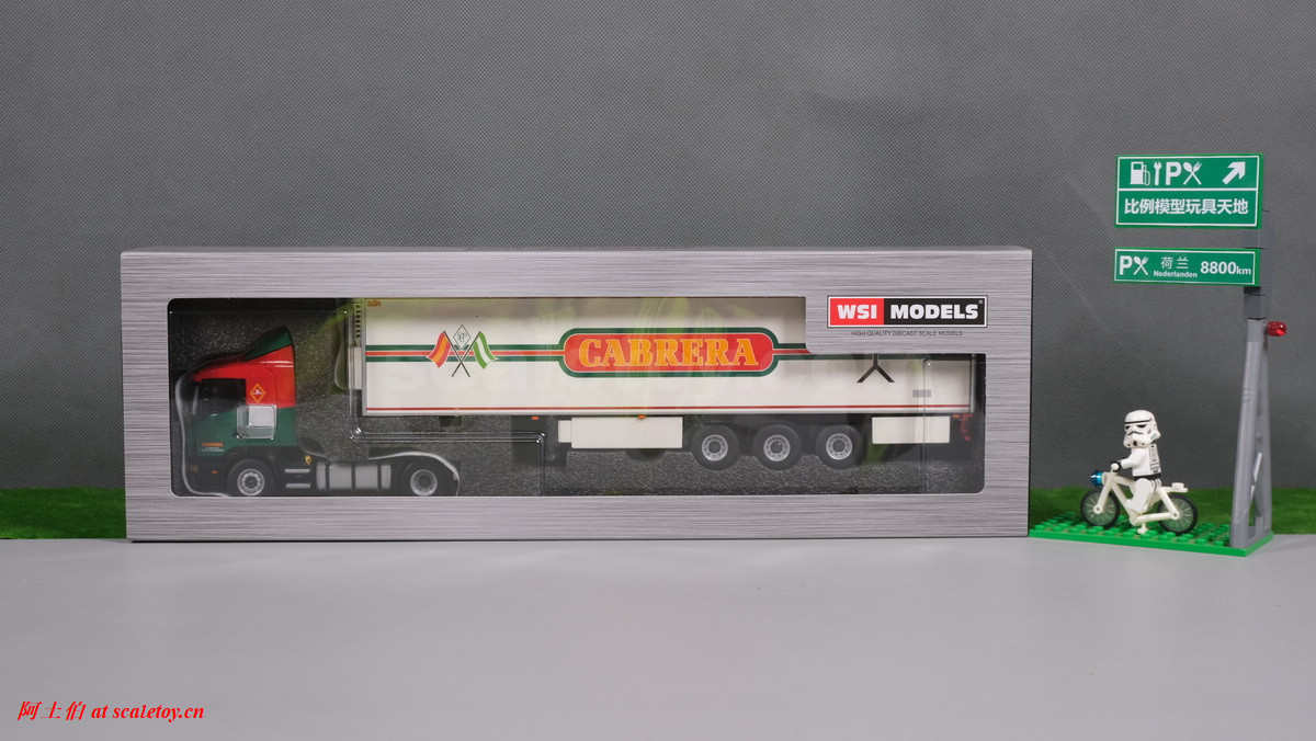 今日介绍的模型为一台斯堪尼亚4系平顶拖头,挂三轴冷藏车。模型为WSI出品,编号01-4324,比例1/50。