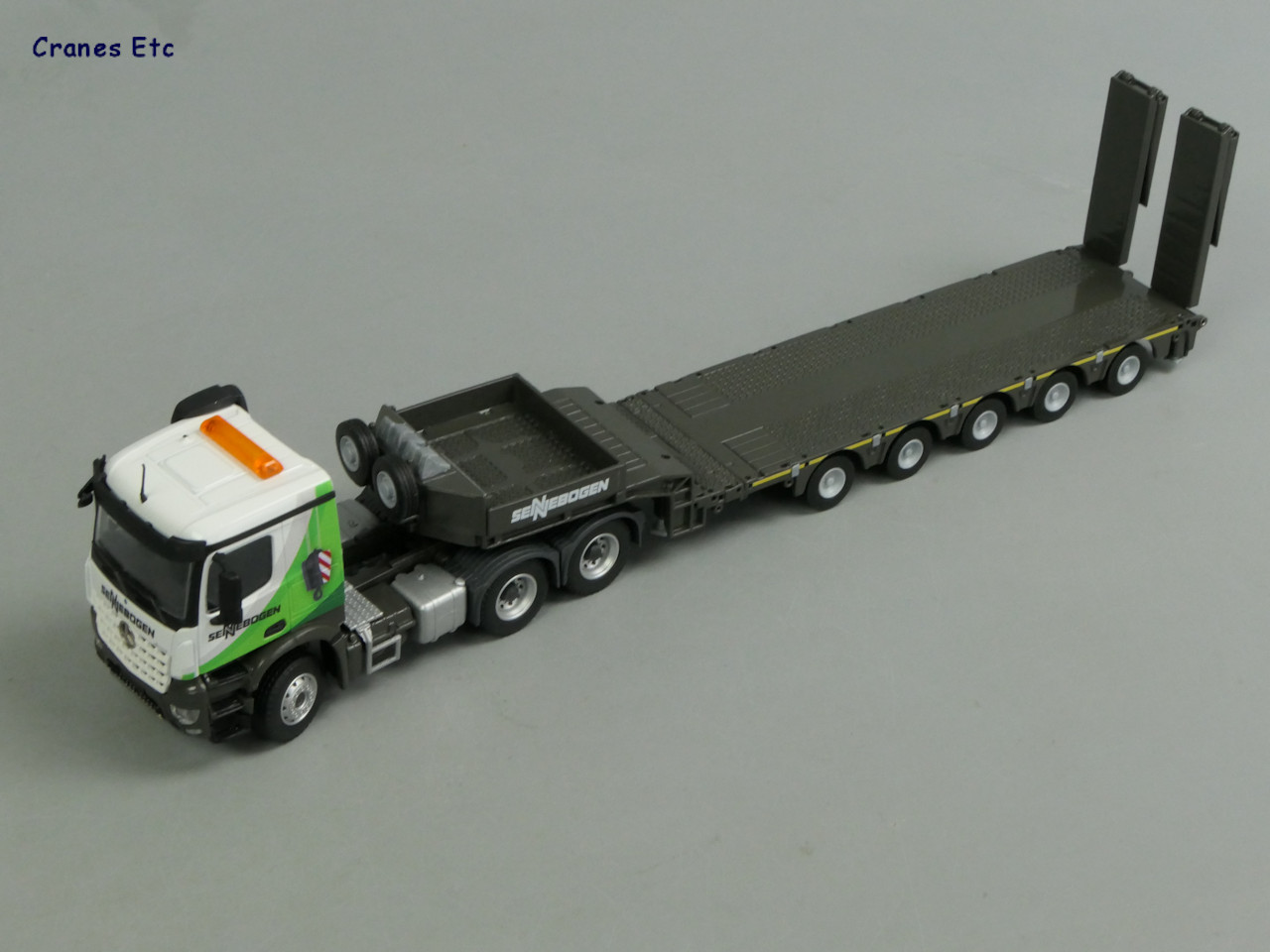 这款模型是奔驰 Arocs 6×4 拖头挂五轴挂车。涂装是 Sennebogen。