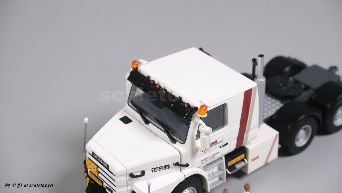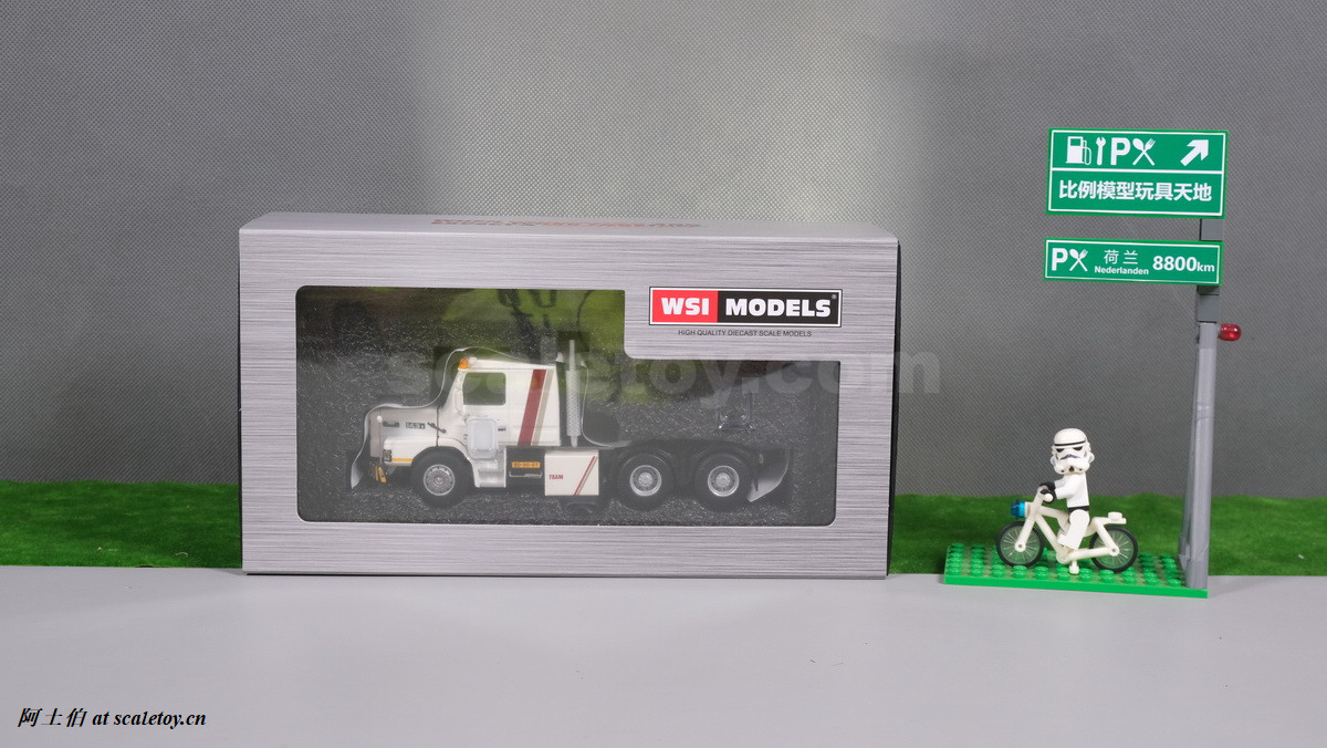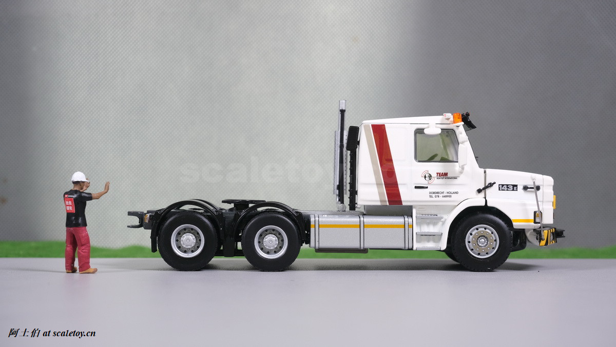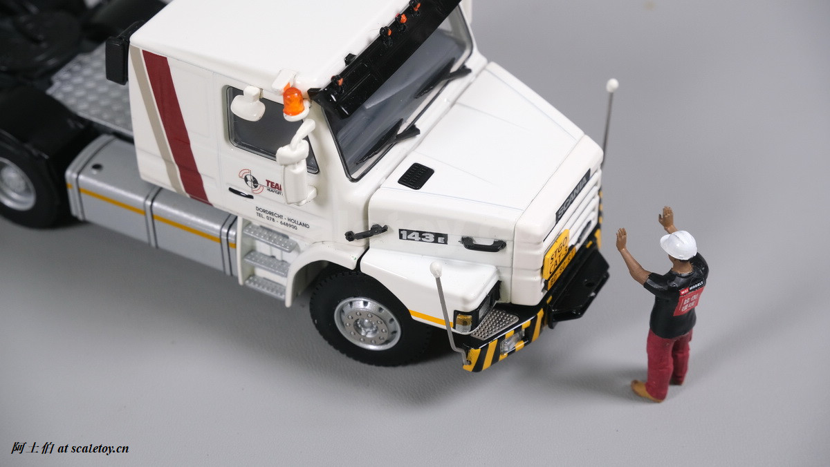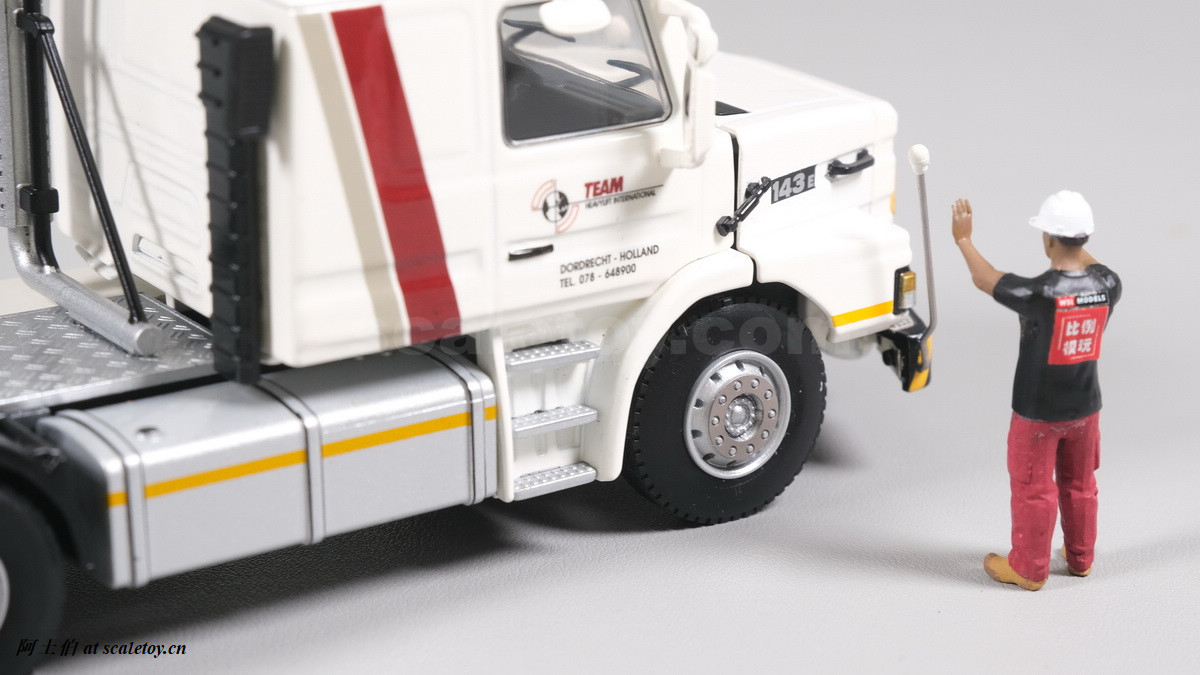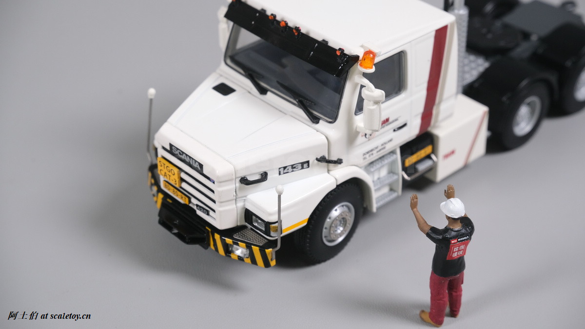 今天介绍的模型就是TEAM HEAVY LIFT涂装的一台斯堪尼亚鱼雷拖头143E 420 6X4。模型为WSI生产,编号01-3580,比例1/50。考虑到车辆年代,应该是复古怀旧模型: