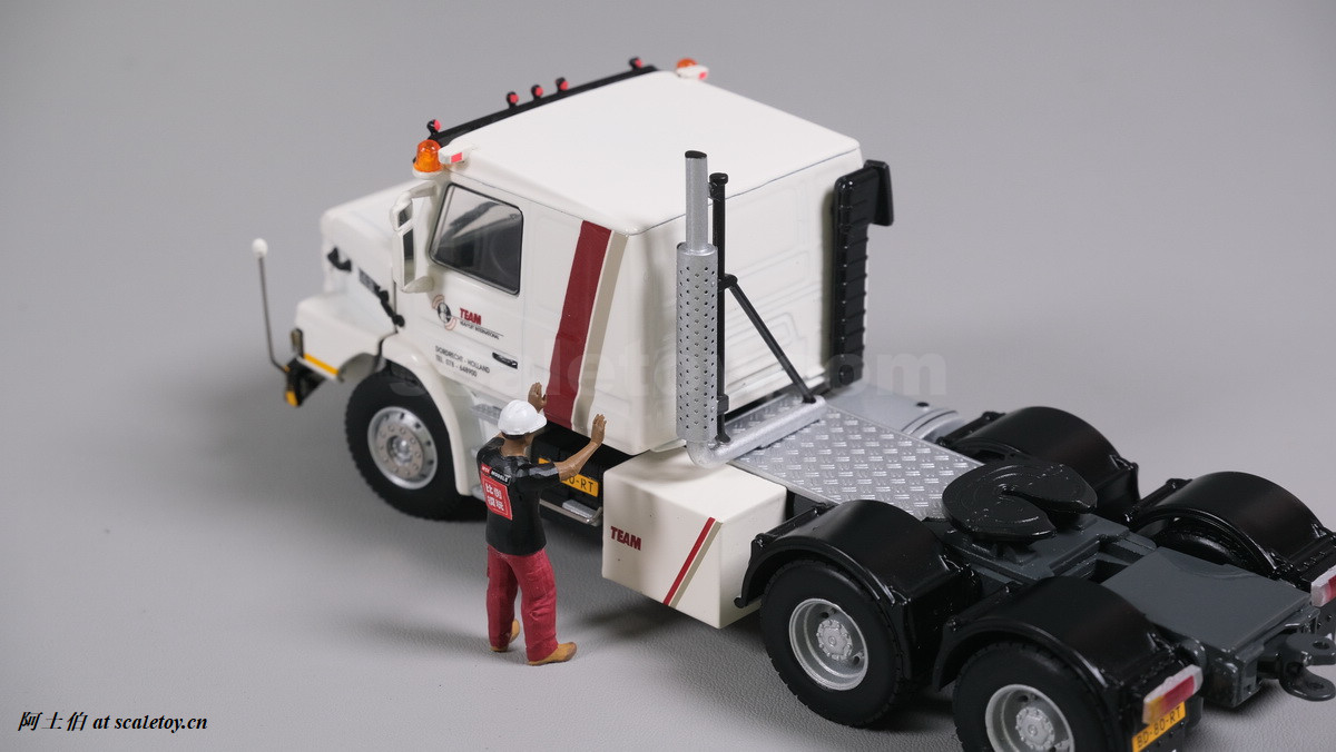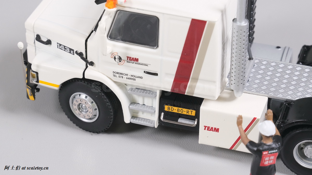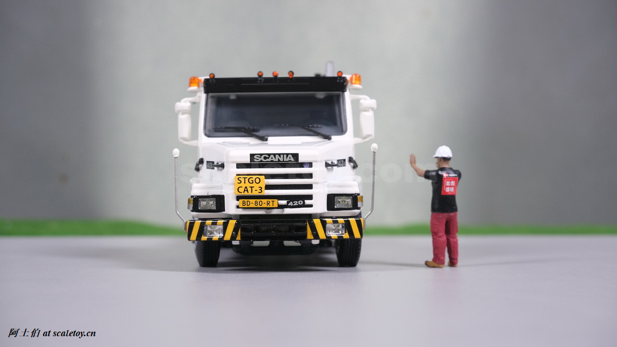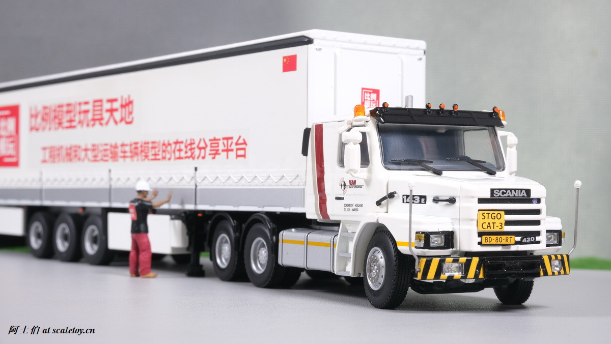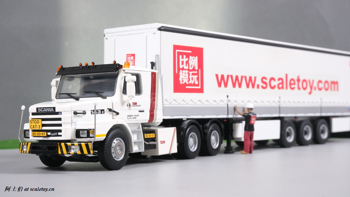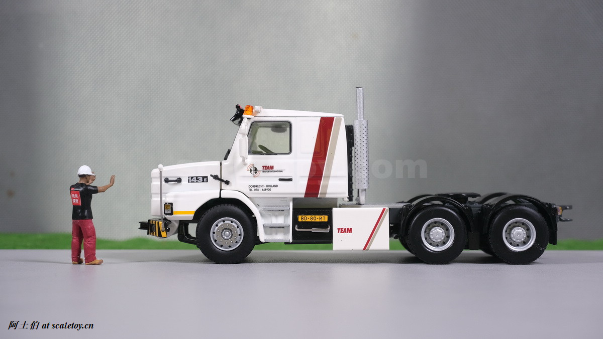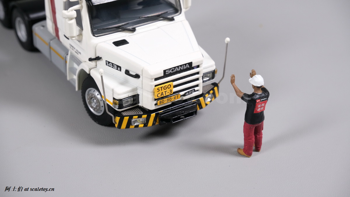 今天介绍的模型就是TEAM HEAVY LIFT涂装的一台斯堪尼亚鱼雷拖头143E 420 6X4。模型为WSI生产,编号01-3580,比例1/50。考虑到车辆年代,应该是复古怀旧模型: