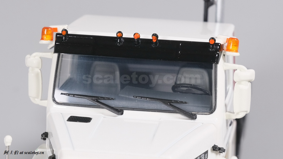 车顶光滑,前遮阳板上沿加了一些灯饰,两侧警灯。
