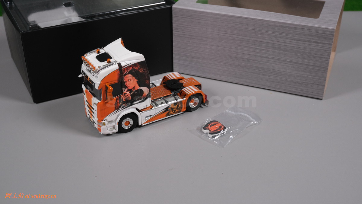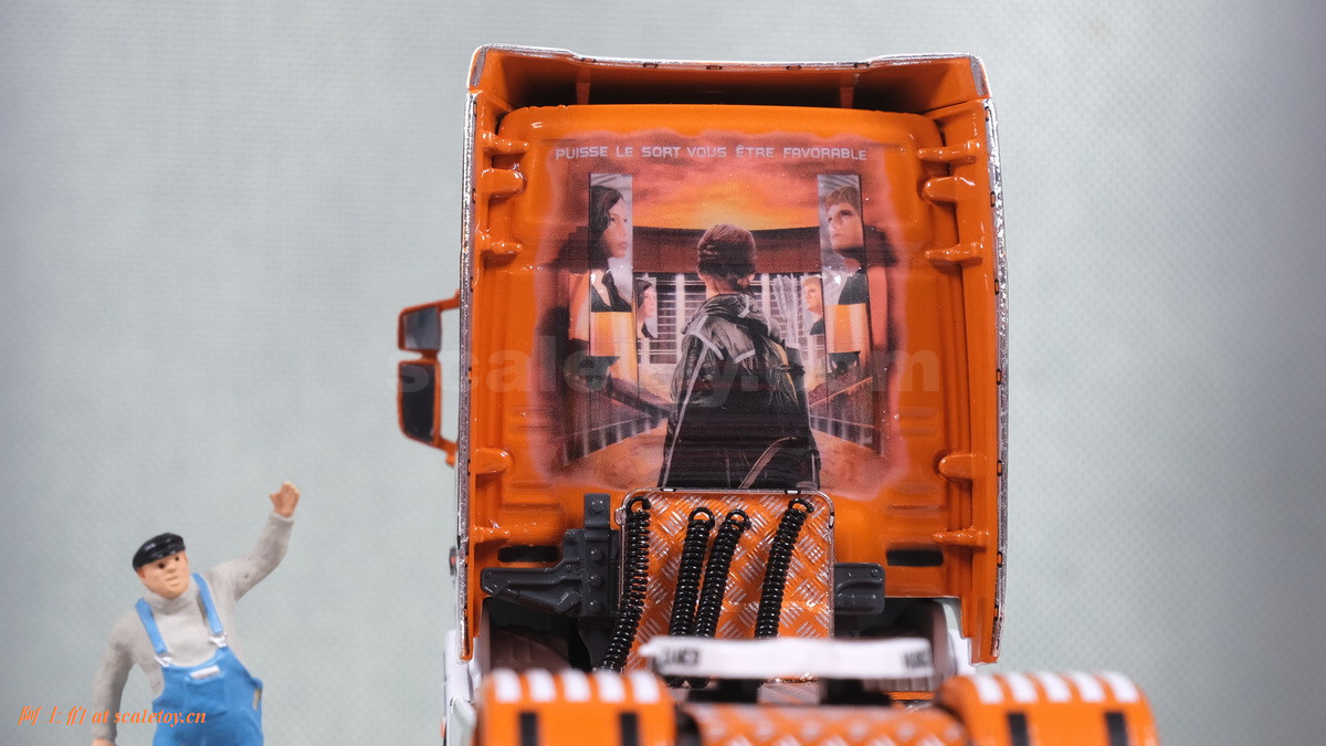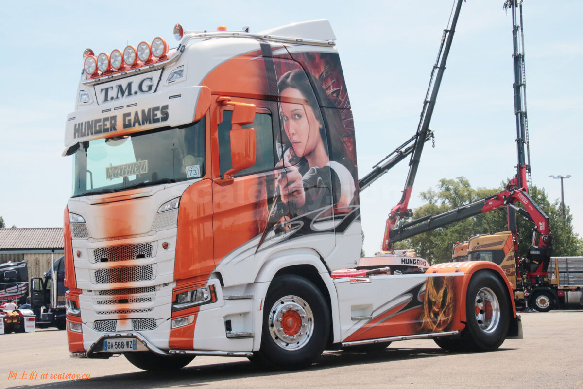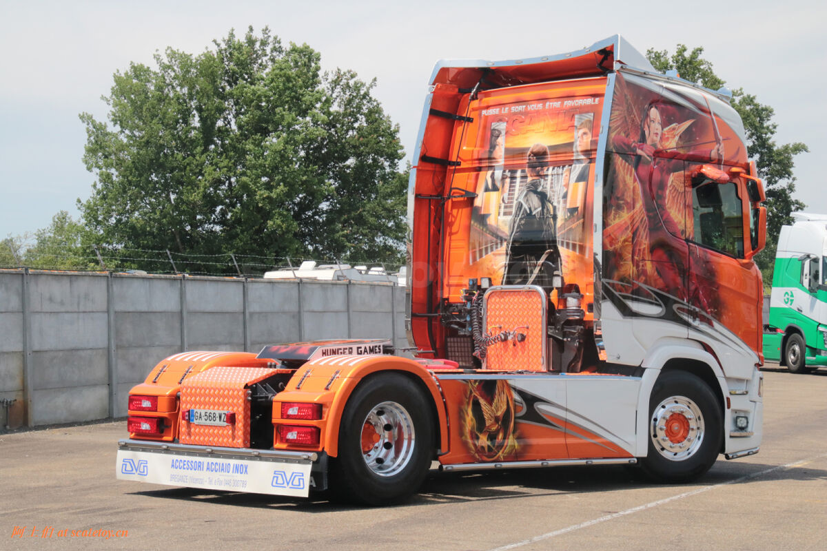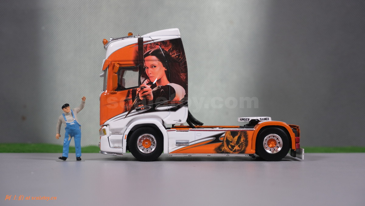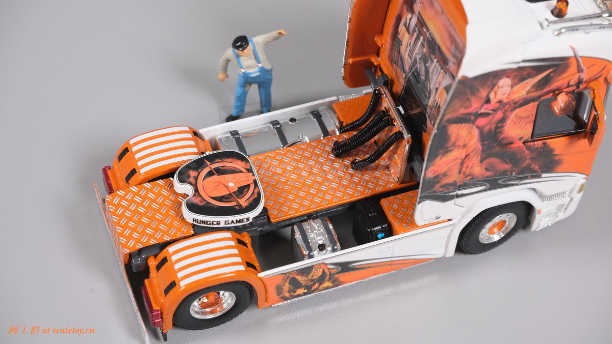 这是一台斯堪尼亚R系列HIGHLINE CR20H 4X2拖头,彩绘是电影《饥饿游戏》。我们可以看到,车辆内外都有精心设计的漂亮主题涂装设计。