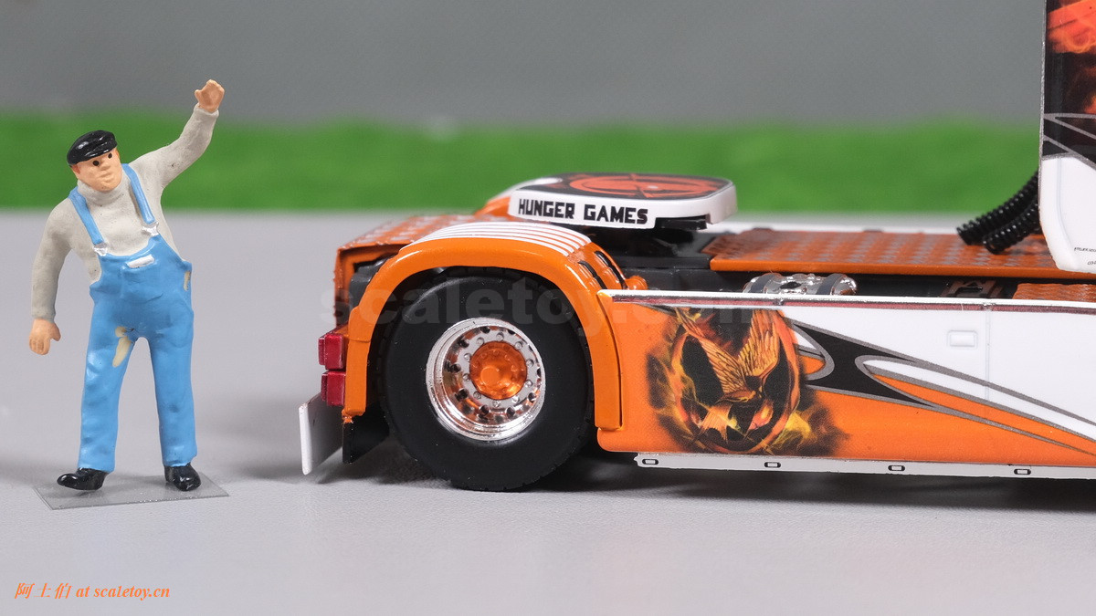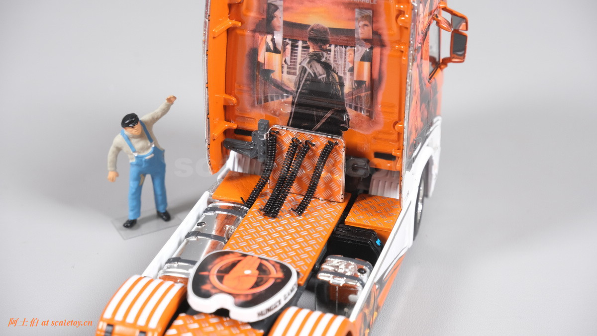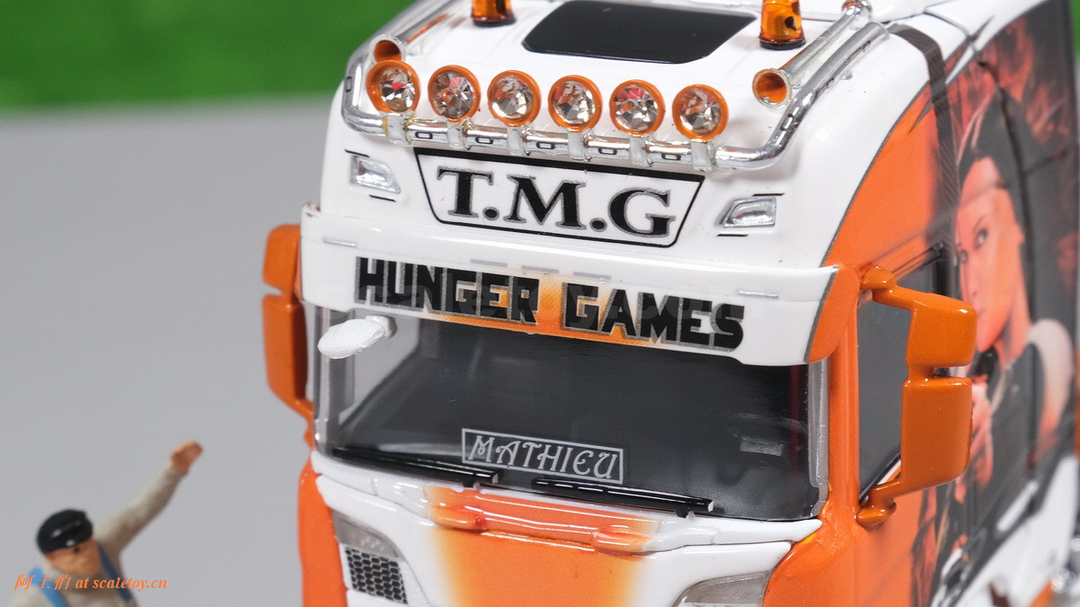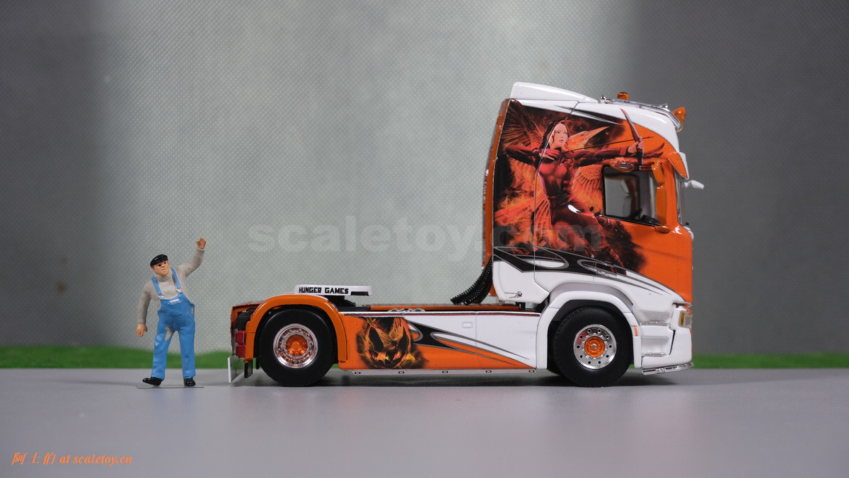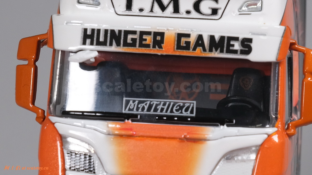 这是一台斯堪尼亚R系列HIGHLINE CR20H 4X2拖头,彩绘是电影《饥饿游戏》。我们可以看到,车辆内外都有精心设计的漂亮主题涂装设计。