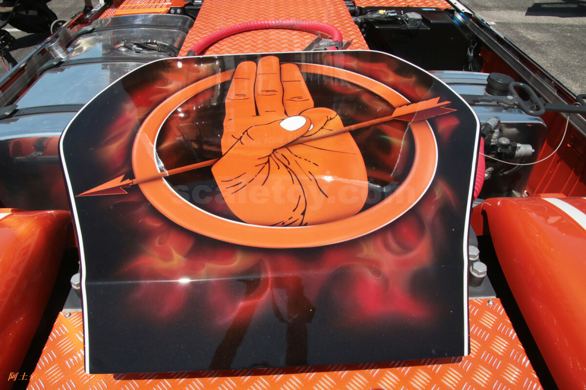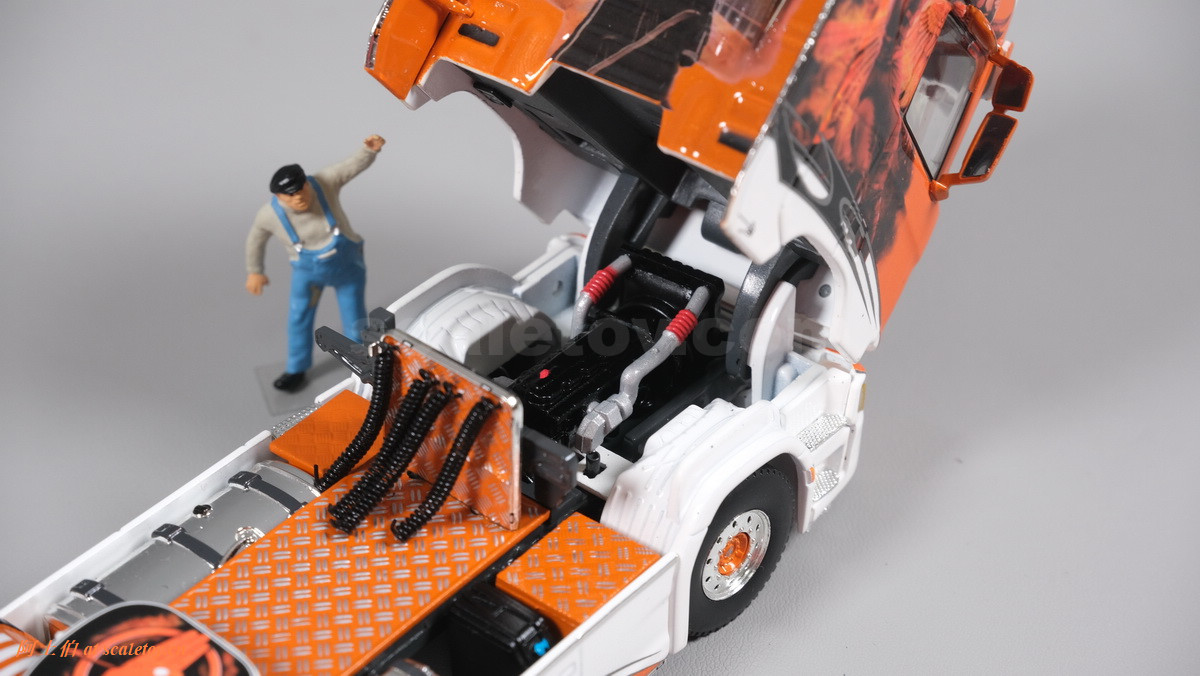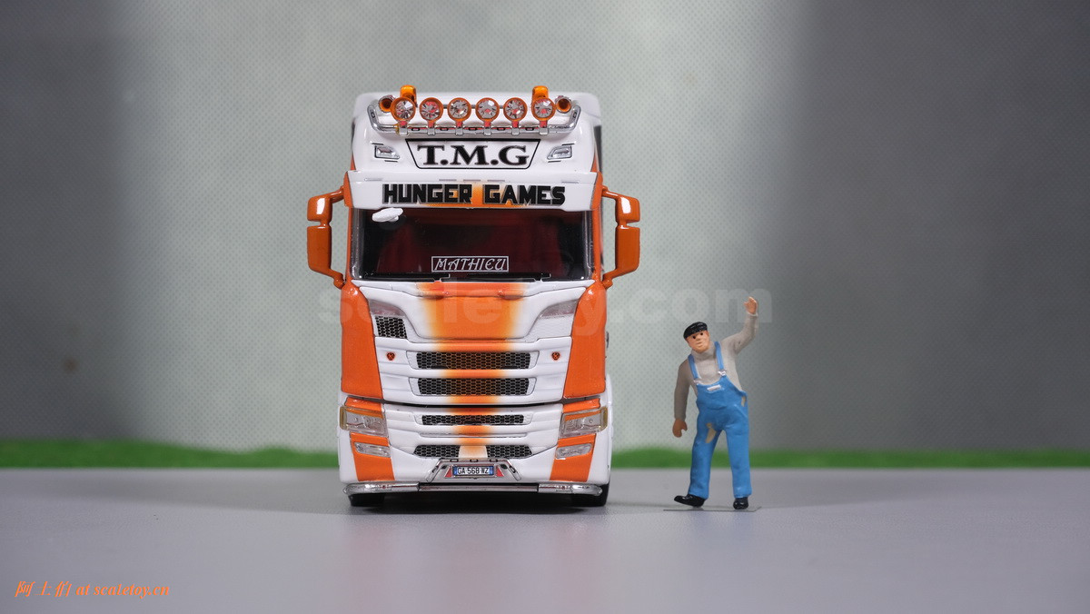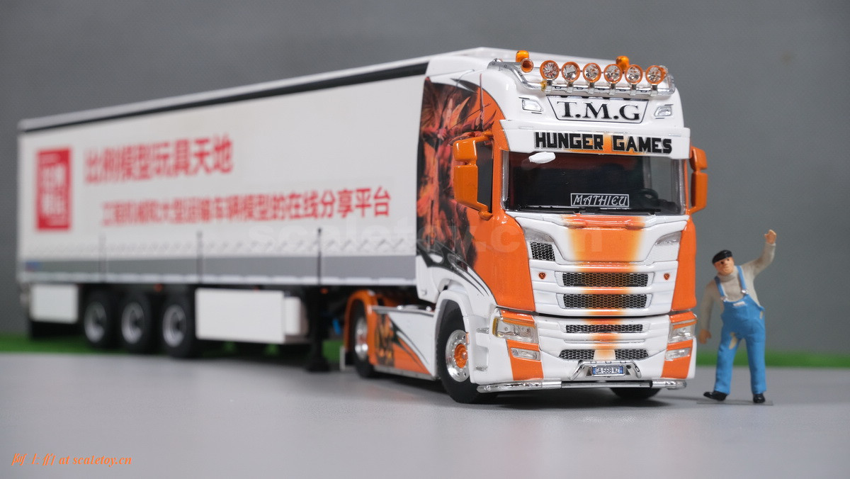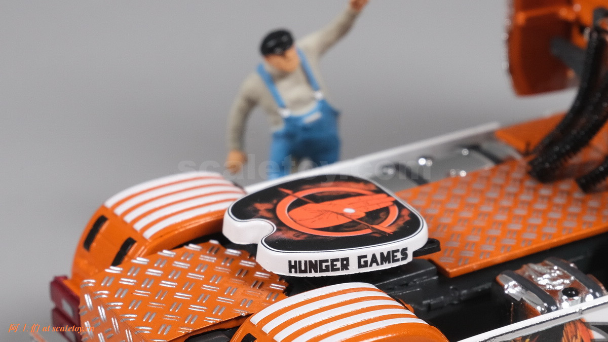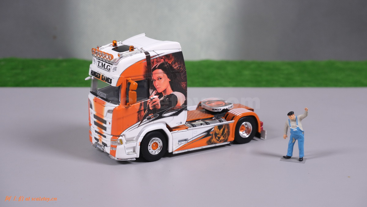 这是一台斯堪尼亚R系列HIGHLINE CR20H 4X2拖头,彩绘是电影《饥饿游戏》。我们可以看到,车辆内外都有精心设计的漂亮主题涂装设计。