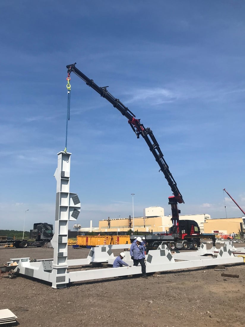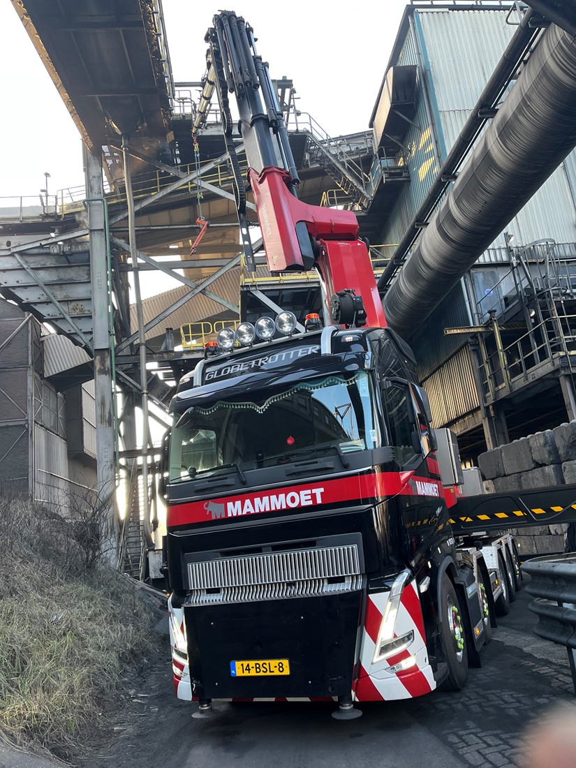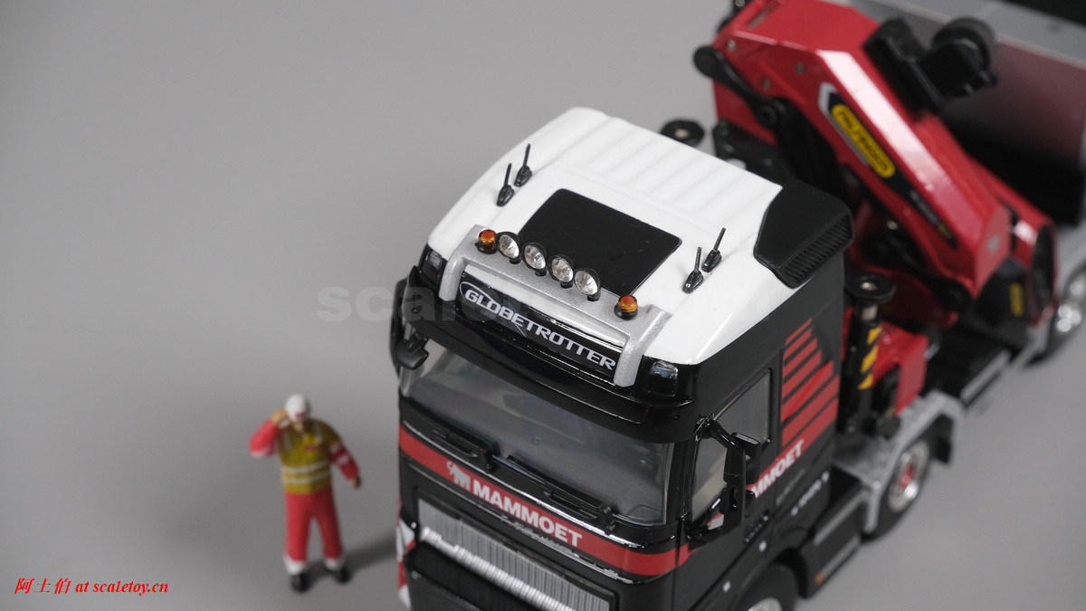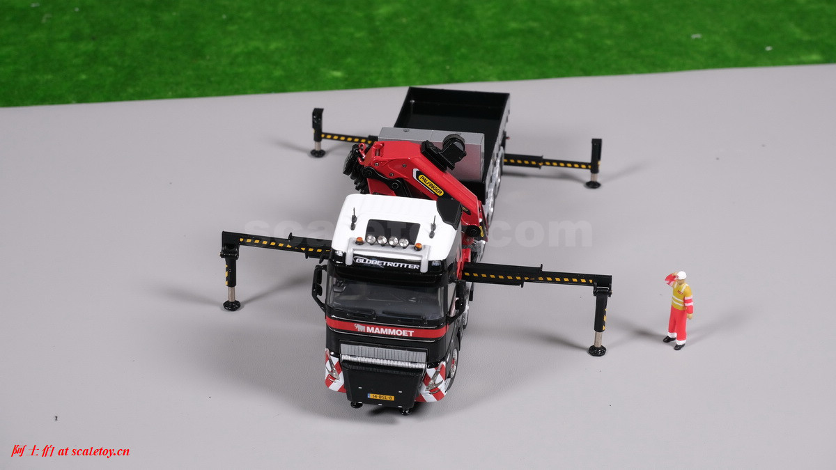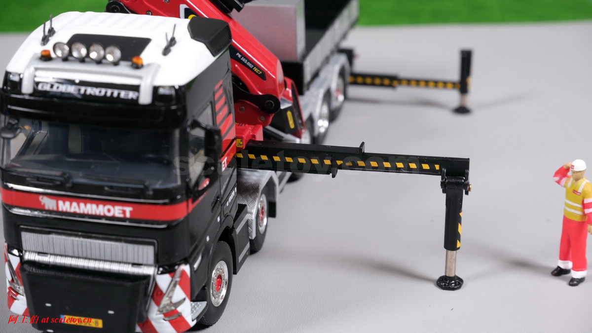这是一款PALFINGER PK165.002 随车吊,安装在一台沃尔沃FH05 GLOBETROTTER 10X4 拖头上,涂装是荷兰公司MAMMOET: