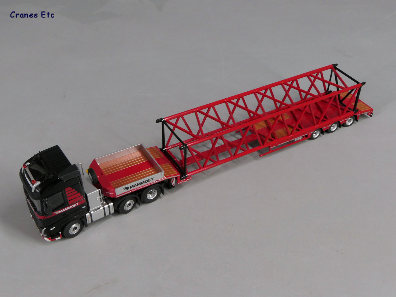 这是一款沃尔沃 FH5 6×2 拖头,挂三轴 Faymonville MAX100 半低板,涂装是MAMMOET,模型套装包含一节起重机桁架作为装载物。