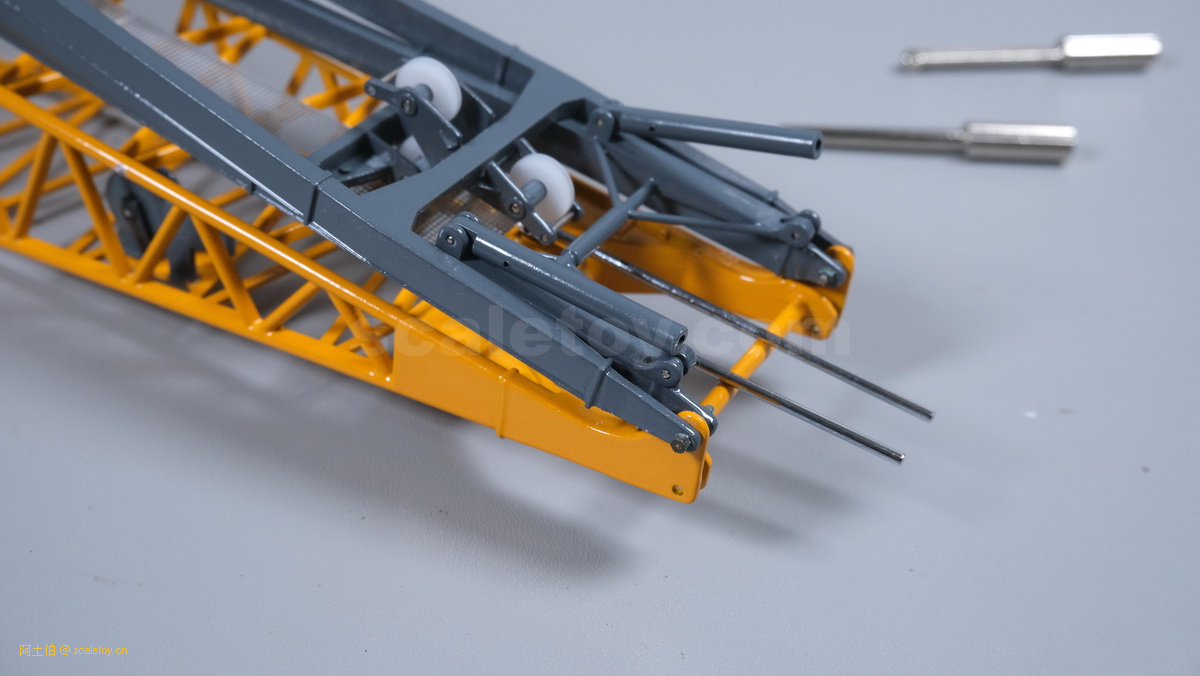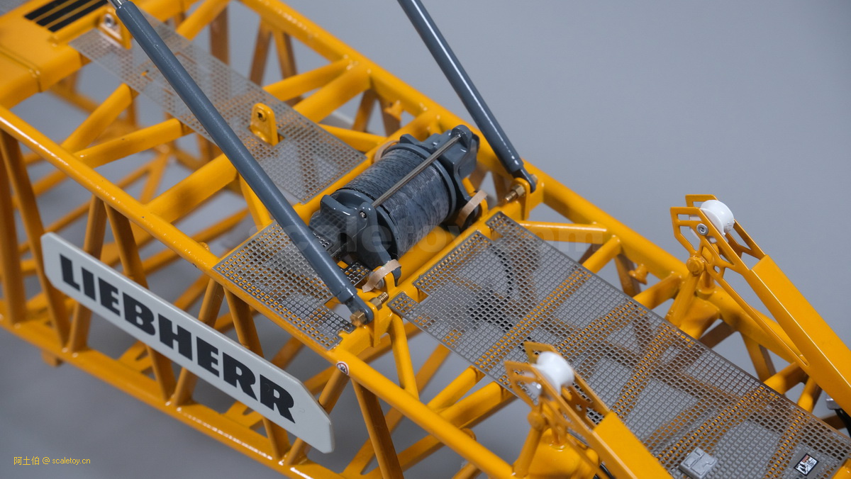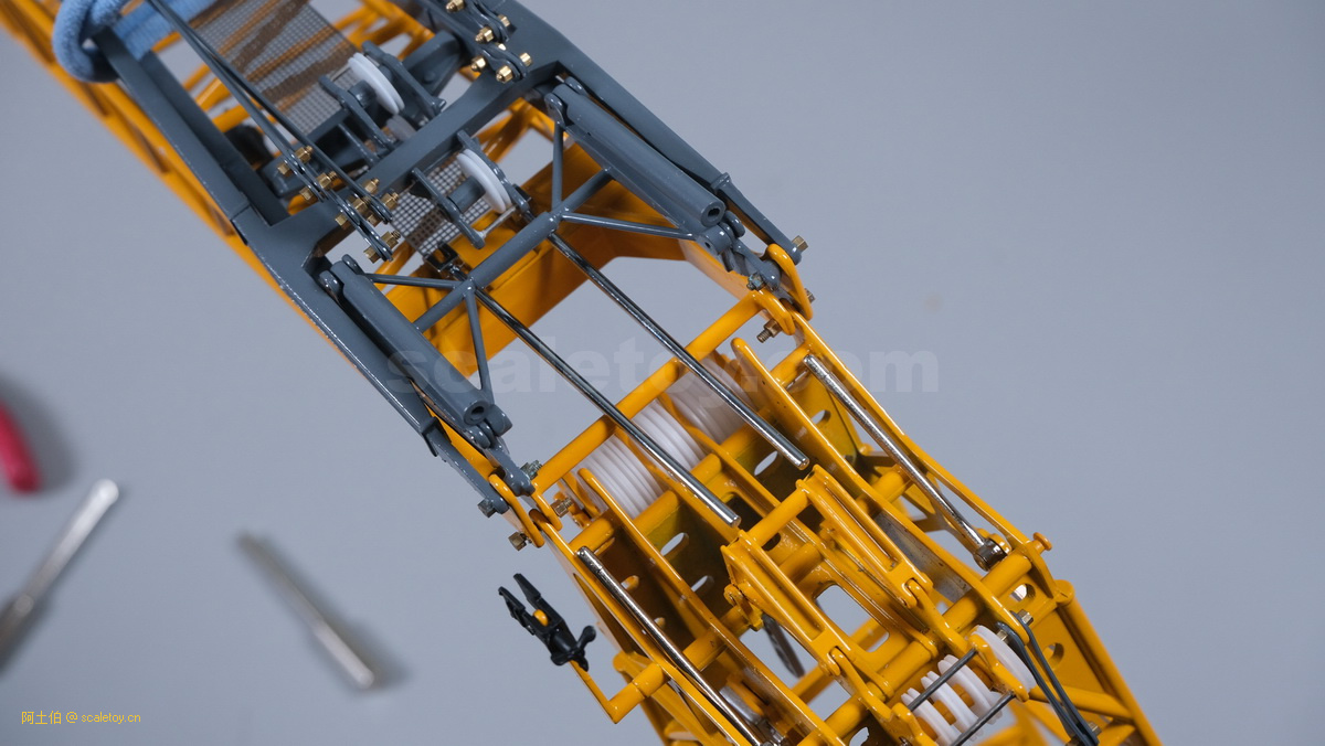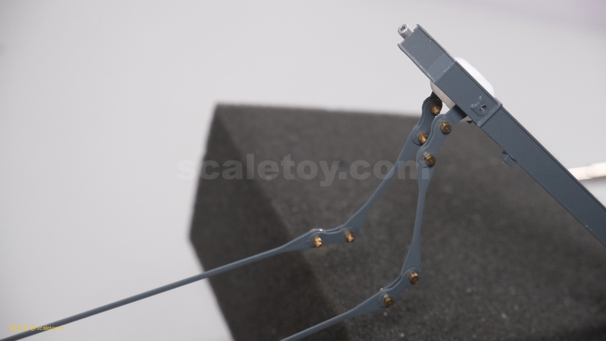 拉起来了。在收回一些的时候一定要小心,两根带弹簧的限位液压杆,是否顶在合适的地方,否则不注意,收线的巨大力量会压坏细节结构。