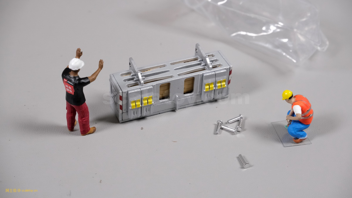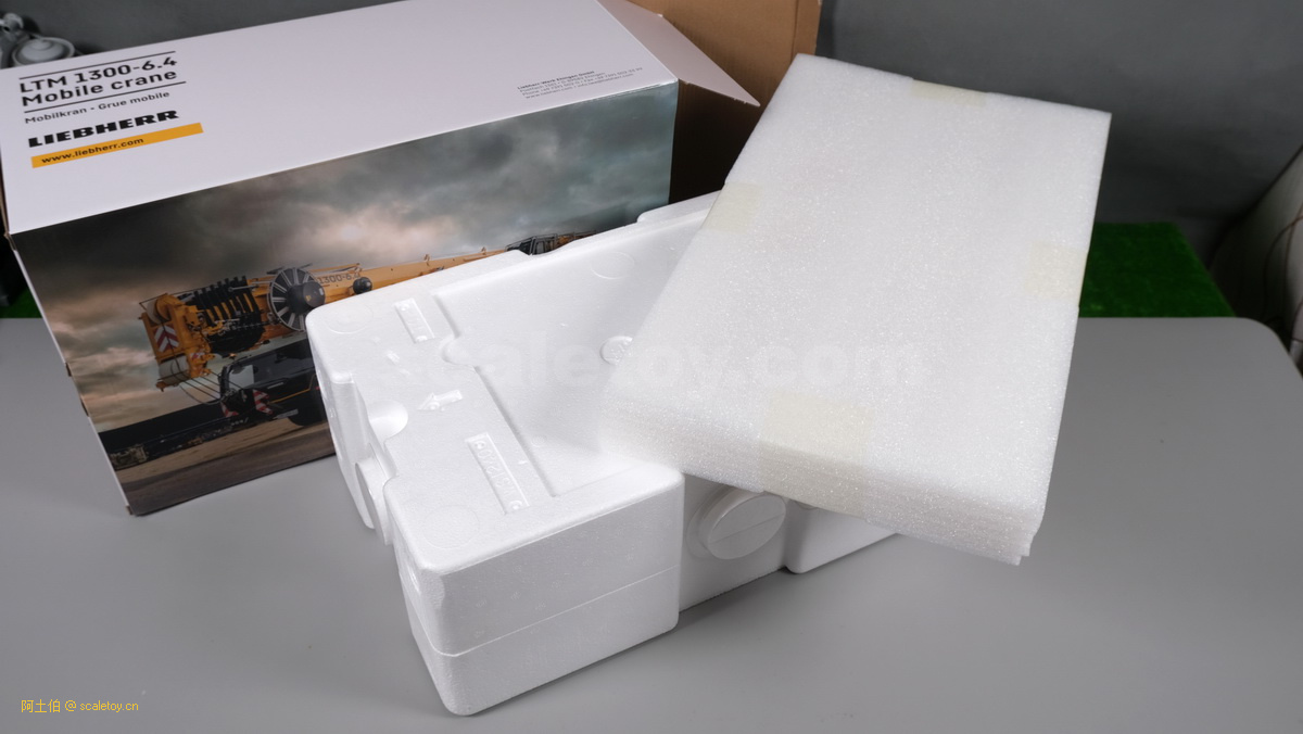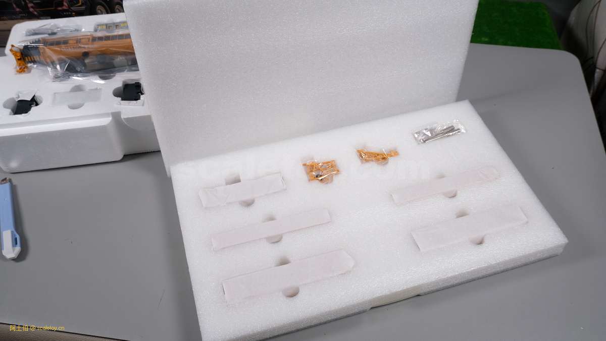 泡沫盒上下层也用了四面圆圈盖子夹住,里面是主要的车体、配重、吊钩等附件。