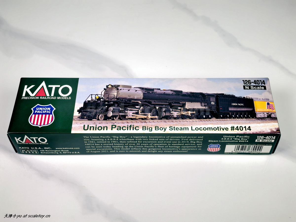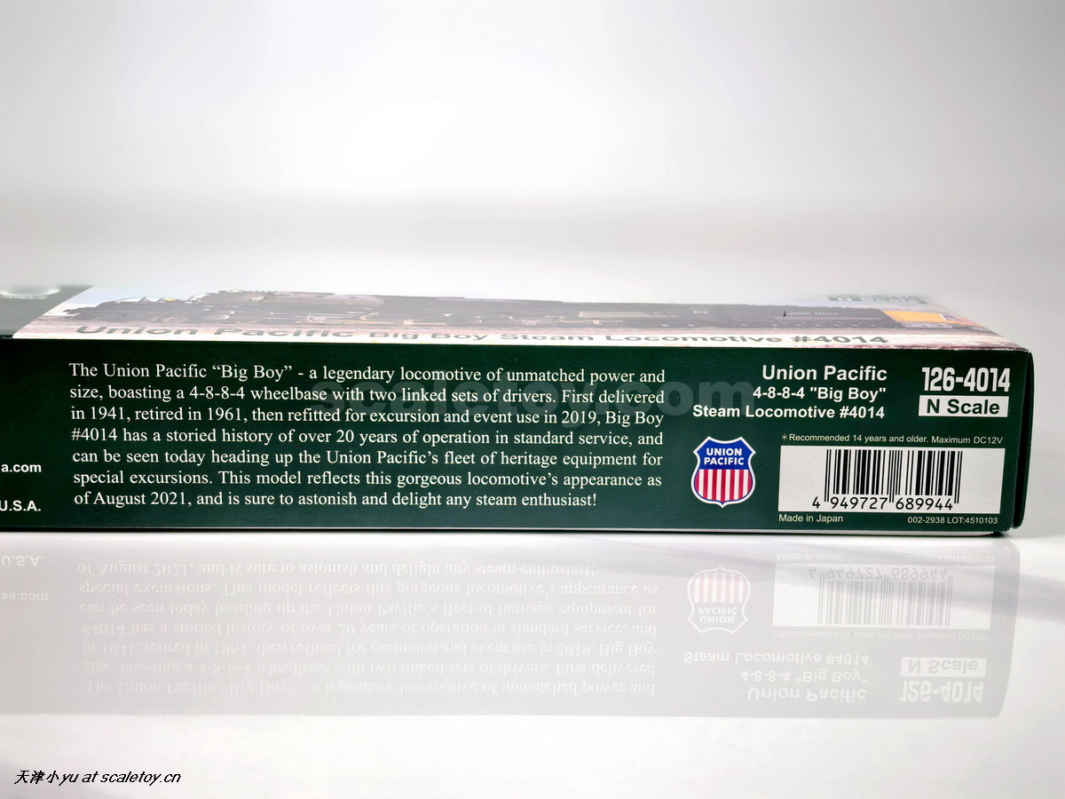 纸盒侧面的介绍,具体内容为“联合太平洋铁路的传奇机车“大男孩”——这台拥有无与伦比动力和规模的机车,其轮距为4-8-8-4,配备两组相连的驱动装置。该机车于1941年首次交付,1961年退役,2019年进行了改造,用于观光和活动。大男孩#4014拥有超过20年的标准服务运营历史,如今作为联合太平洋铁路遗产设备的一部分,带领着车队进行特别的观光旅行。这款模型展示了这台美丽机车截至2021年8月的外观,定会让任何蒸汽爱好者感到惊喜和愉悦!