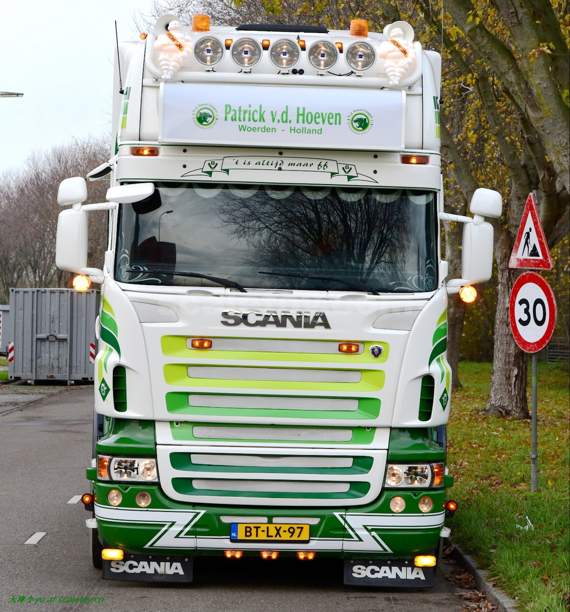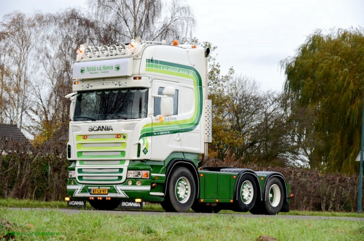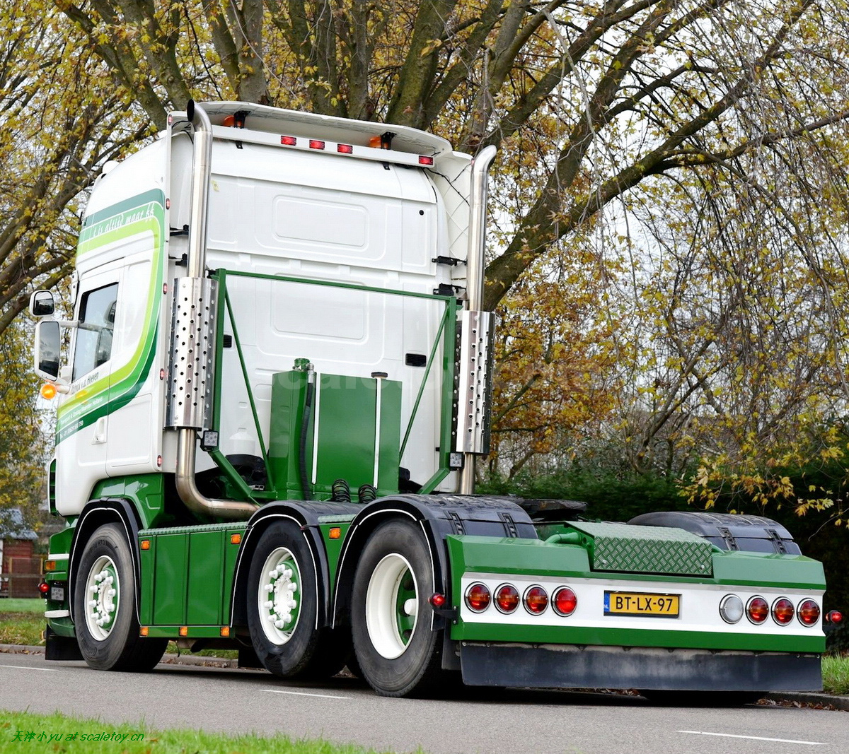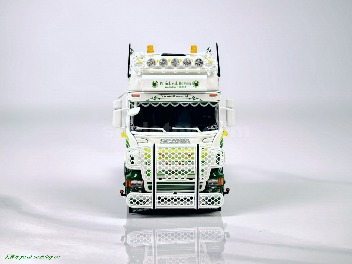 先看实车图,scania R500车型,刚开始我还纳闷为什么这个车的车头没有印刷车牌照。仔细研究一下终于发现了其中的端倪,从顶部灯箱和探照灯看,模型对应的实车车牌尾号是97,但是97的车又不带前牛栏,另外再看带牛栏的尾号是61,但是顶灯探照灯和遮阳板的图案那里又对不上,所以可以认为这是tekno做了个四不像。