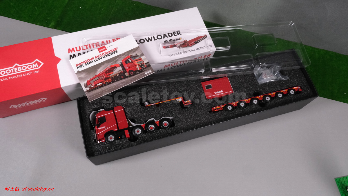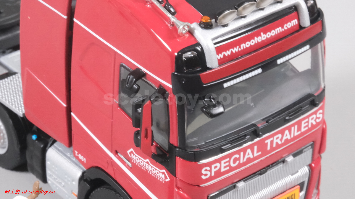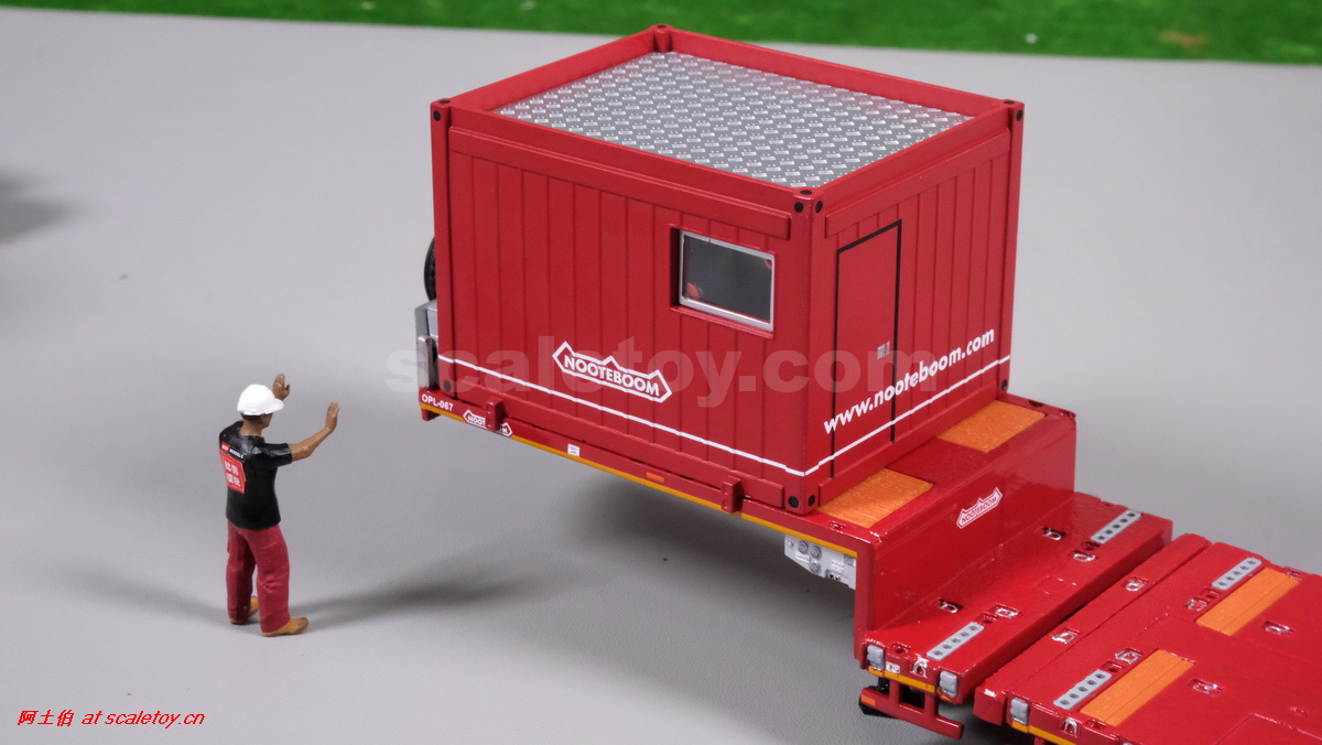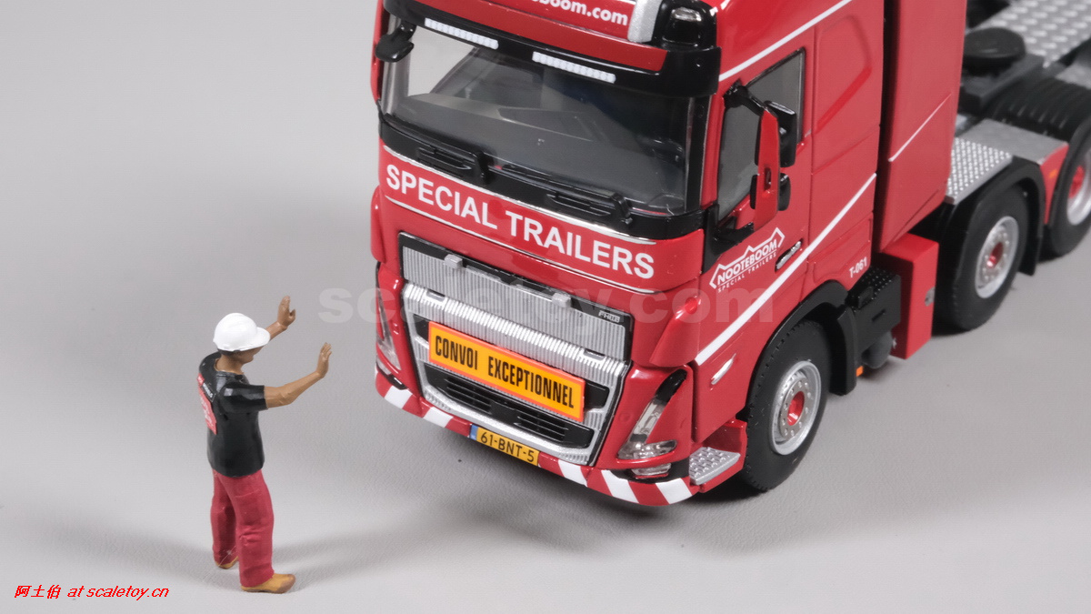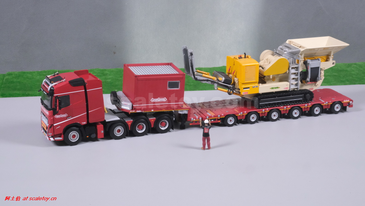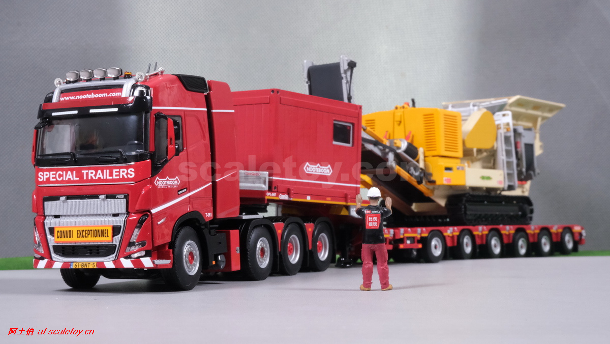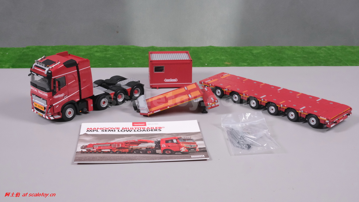 今天介绍的是WSI为NOOTEBOOM原厂涂装专门做的RED LINE系列模型之一,编号6073368的,沃尔沃FH5 GLOBETROTTER 8X4 拖头,挂六轴的MANOOVR MPL半低板,并配10呎简易工房集装箱。