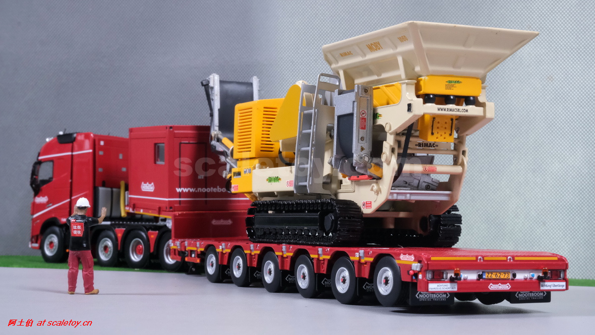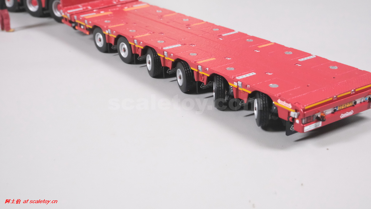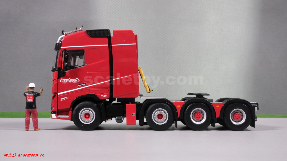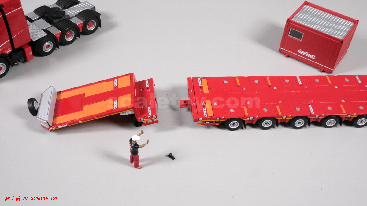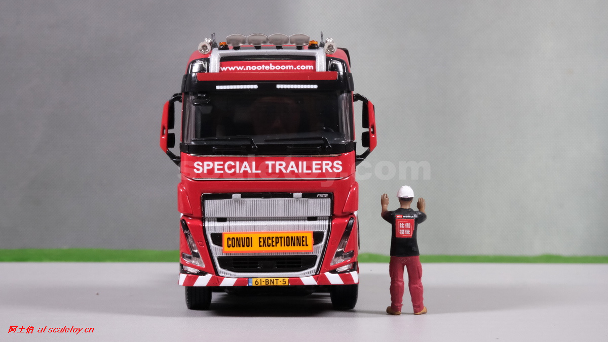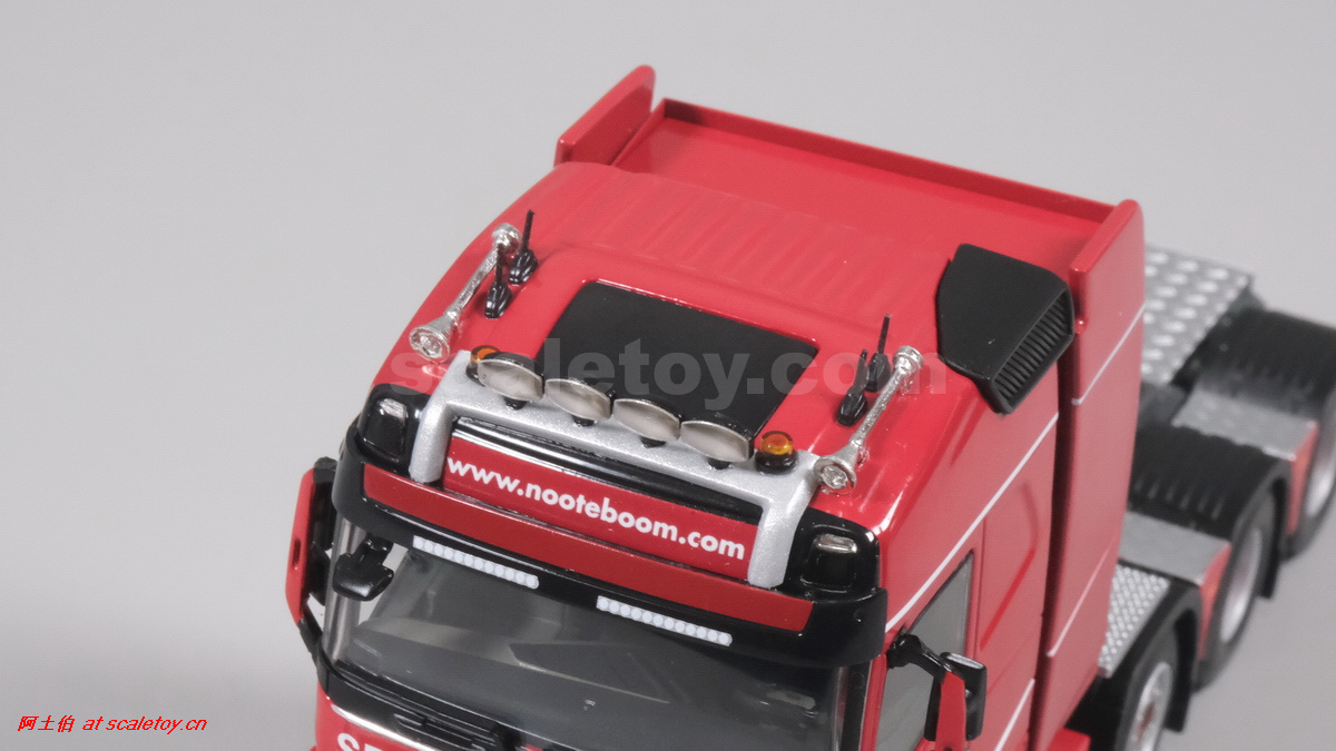 今天介绍的是WSI为NOOTEBOOM原厂涂装专门做的RED LINE系列模型之一,编号6073368的,沃尔沃FH5 GLOBETROTTER 8X4 拖头,挂六轴的MANOOVR MPL半低板,并配10呎简易工房集装箱。