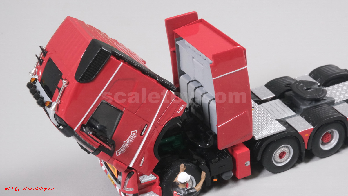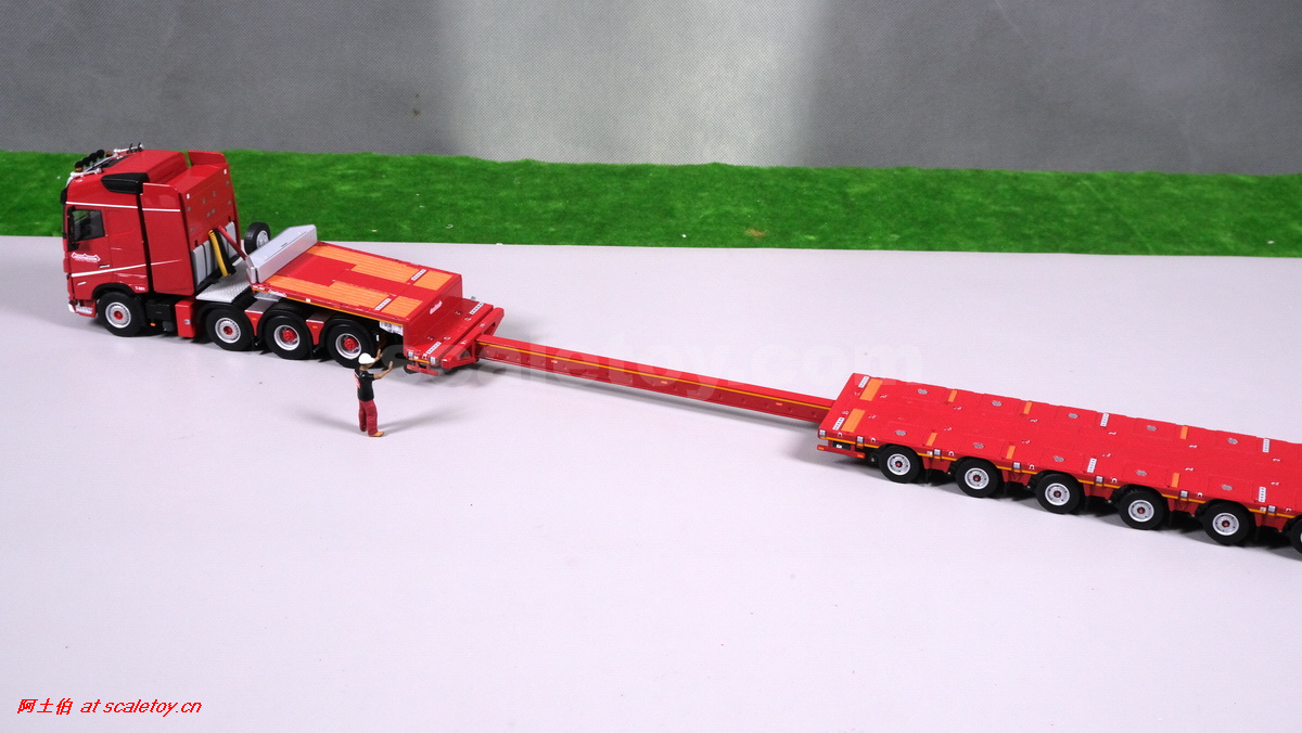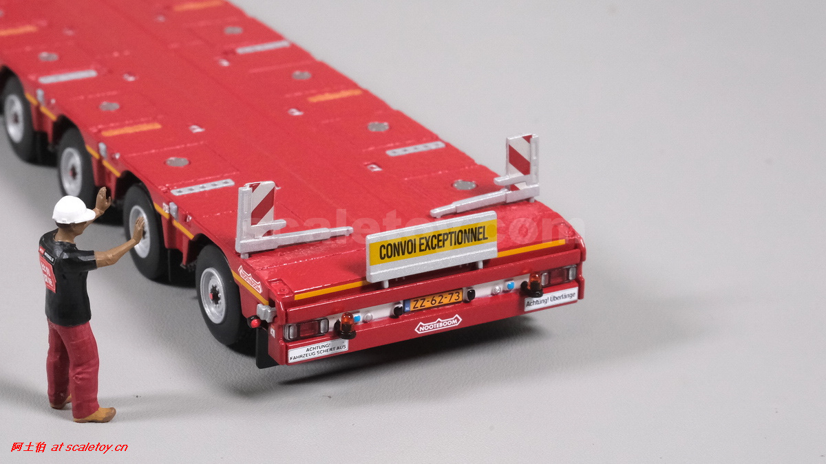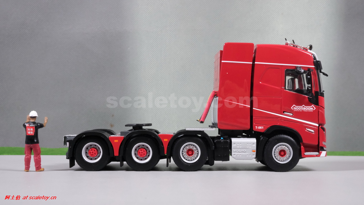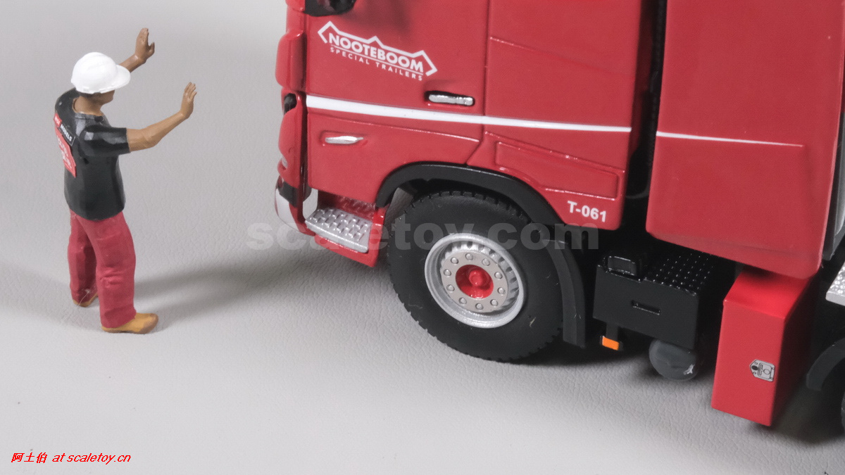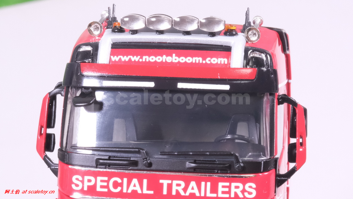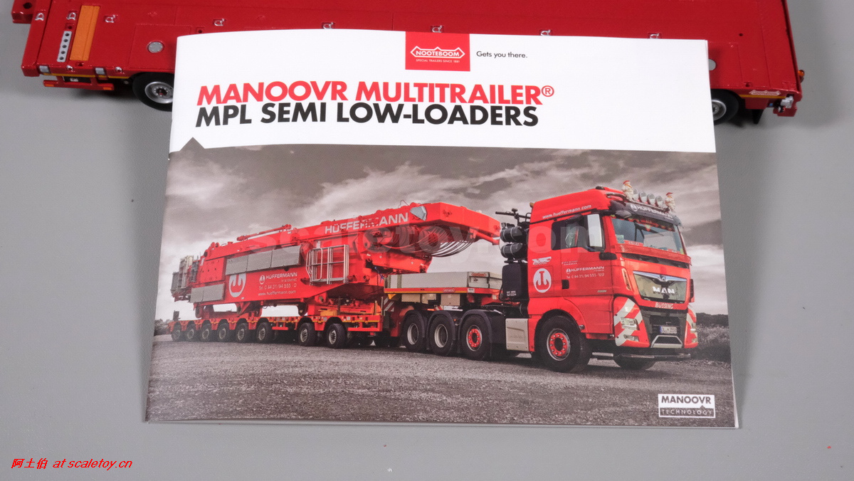 今天介绍的是WSI为NOOTEBOOM原厂涂装专门做的RED LINE系列模型之一,编号6073368的,沃尔沃FH5 GLOBETROTTER 8X4 拖头,挂六轴的MANOOVR MPL半低板,并配10呎简易工房集装箱。