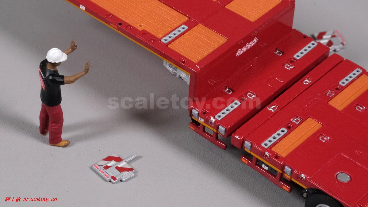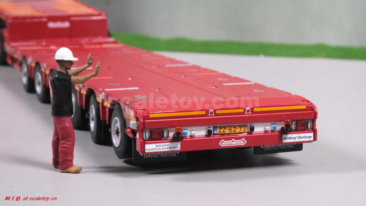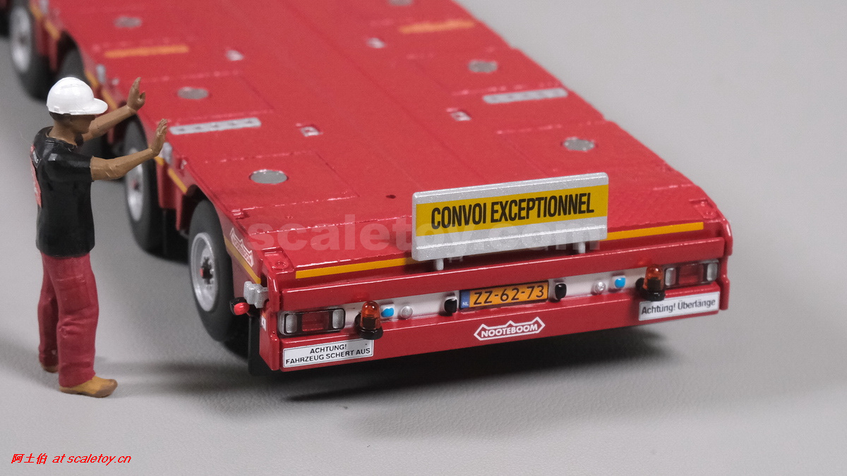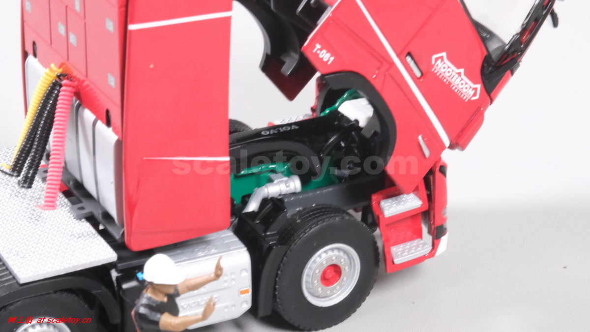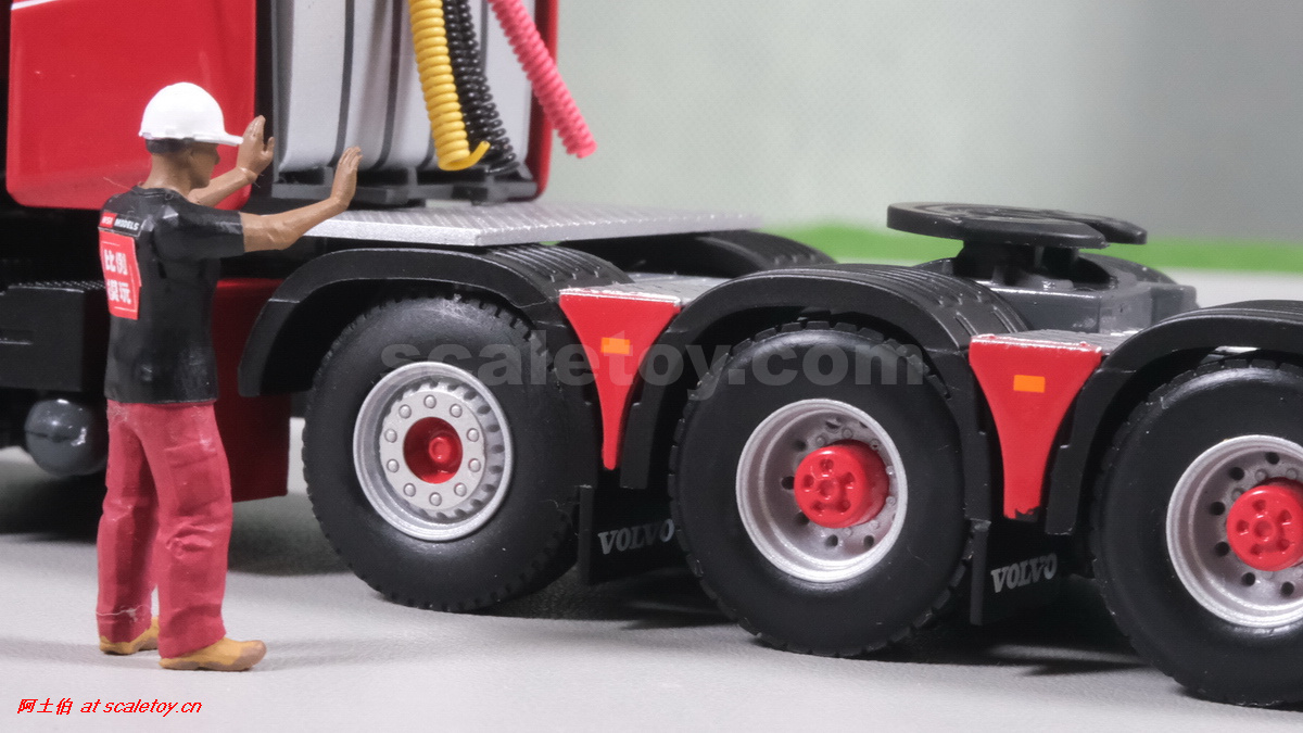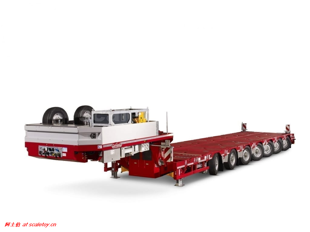 今天介绍的是WSI为NOOTEBOOM原厂涂装专门做的RED LINE系列模型之一,编号6073368的,沃尔沃FH5 GLOBETROTTER 8X4 拖头,挂六轴的MANOOVR MPL半低板,并配10呎简易工房集装箱。