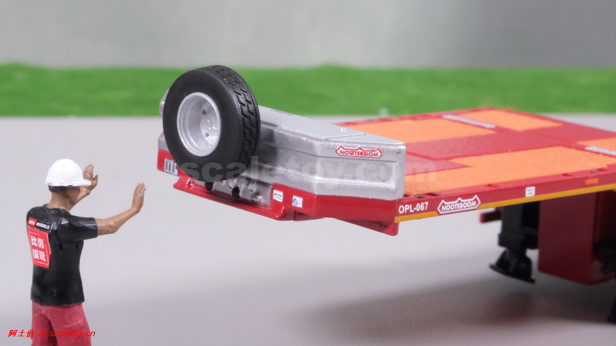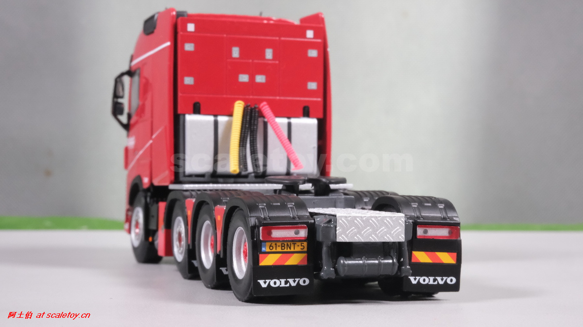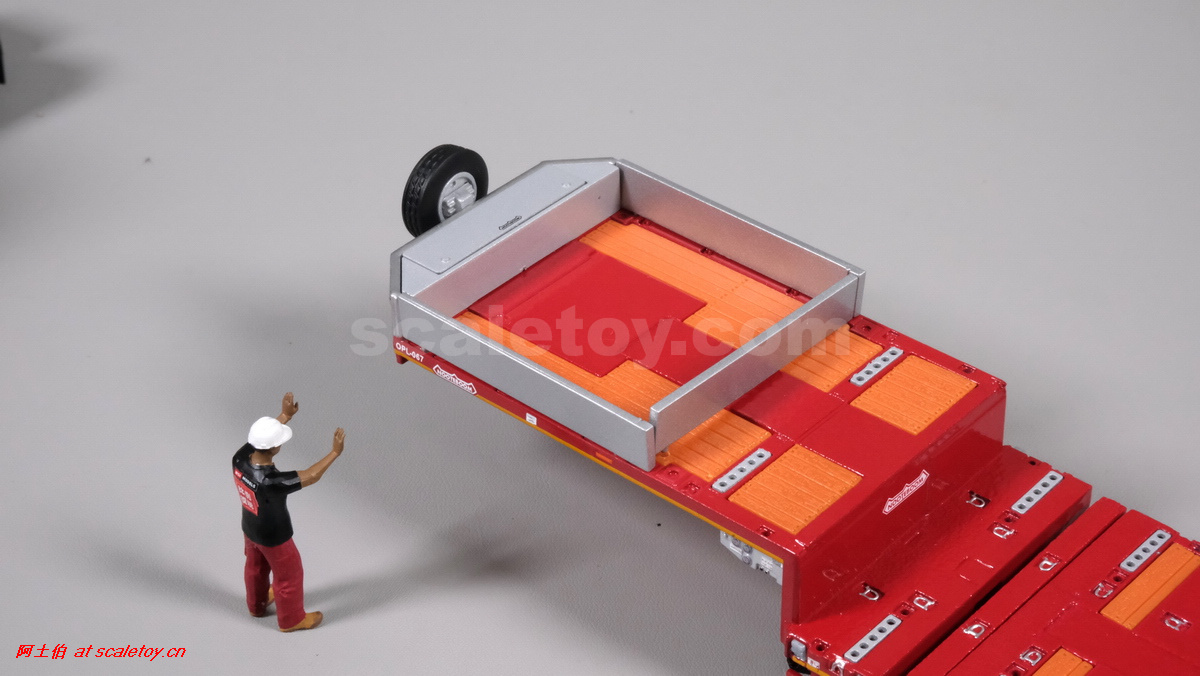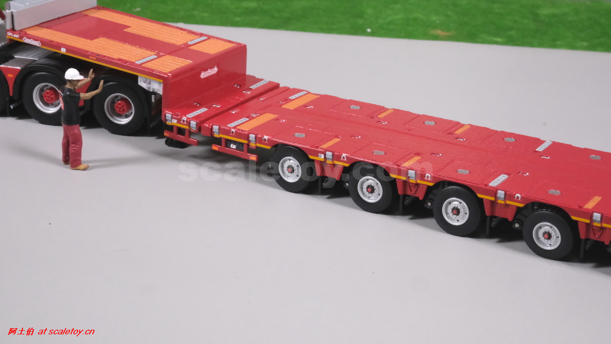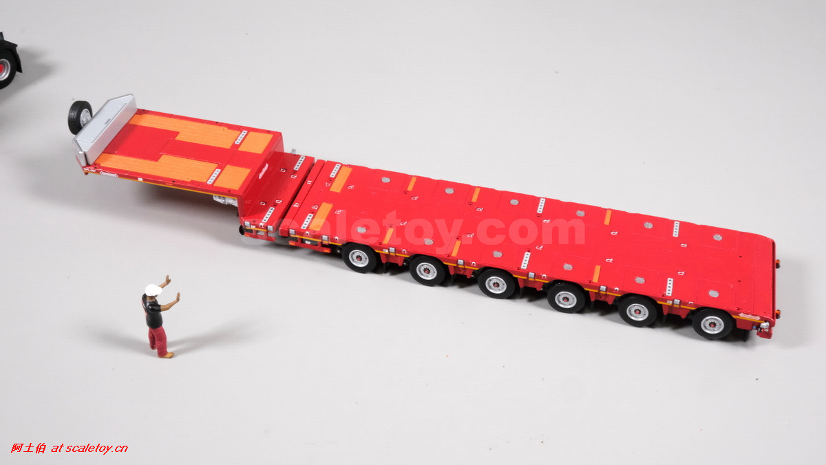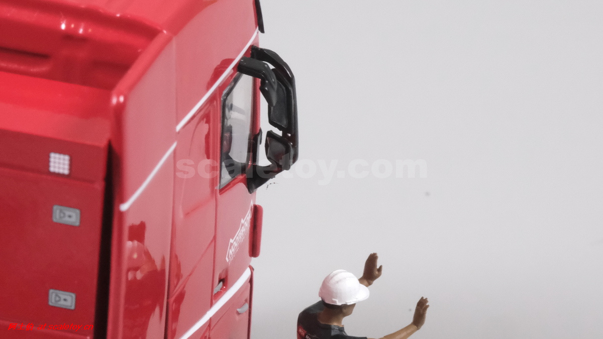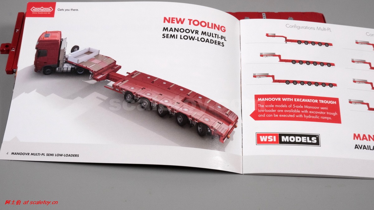 今天介绍的是WSI为NOOTEBOOM原厂涂装专门做的RED LINE系列模型之一,编号6073368的,沃尔沃FH5 GLOBETROTTER 8X4 拖头,挂六轴的MANOOVR MPL半低板,并配10呎简易工房集装箱。