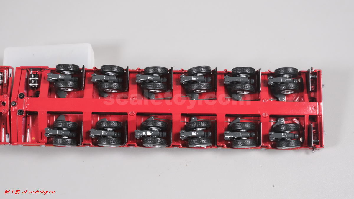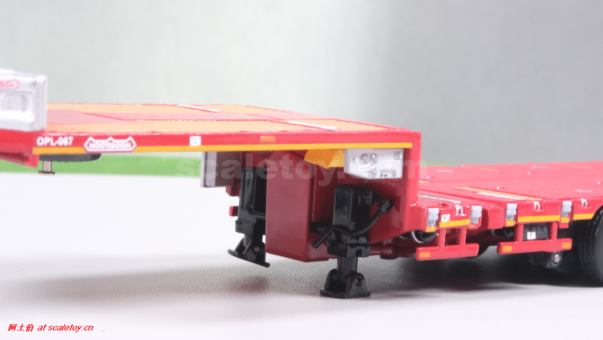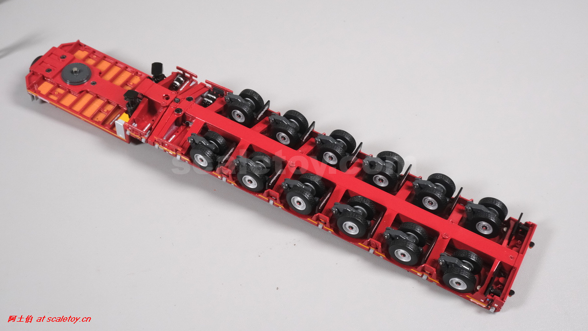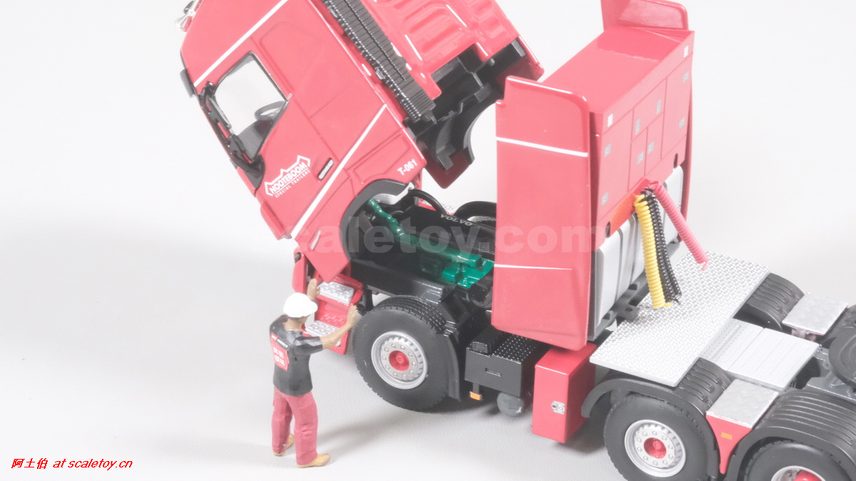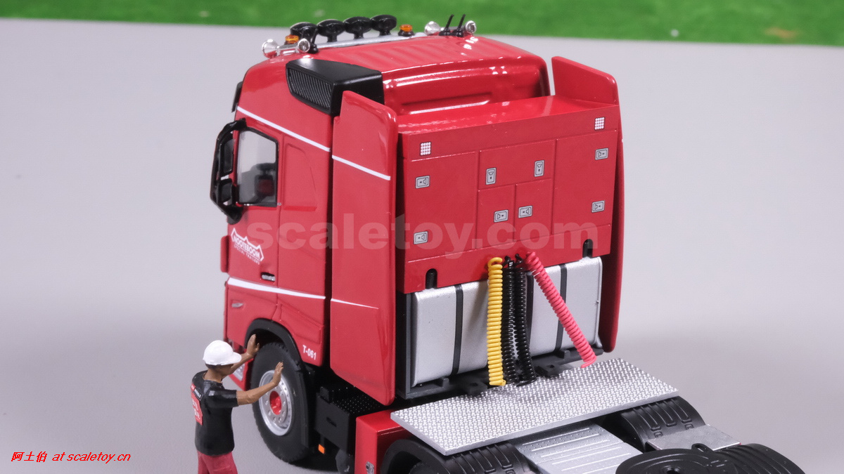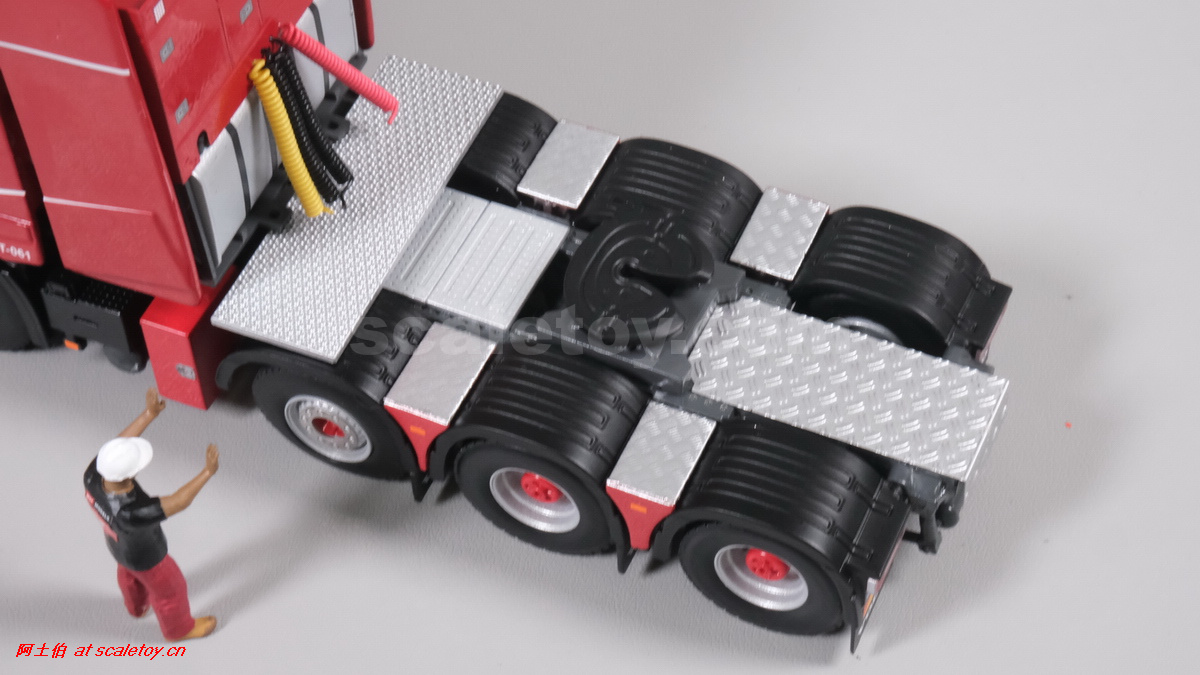 今天介绍的是WSI为NOOTEBOOM原厂涂装专门做的RED LINE系列模型之一,编号6073368的,沃尔沃FH5 GLOBETROTTER 8X4 拖头,挂六轴的MANOOVR MPL半低板,并配10呎简易工房集装箱。