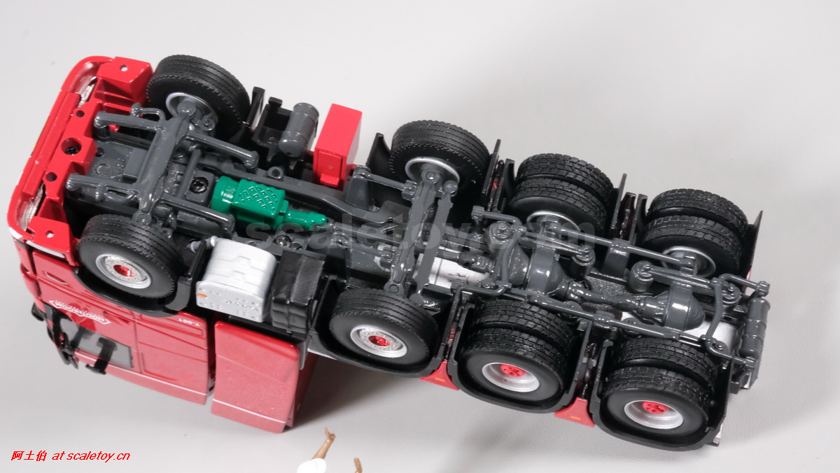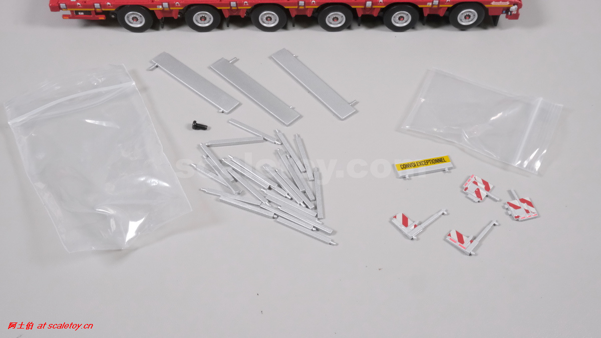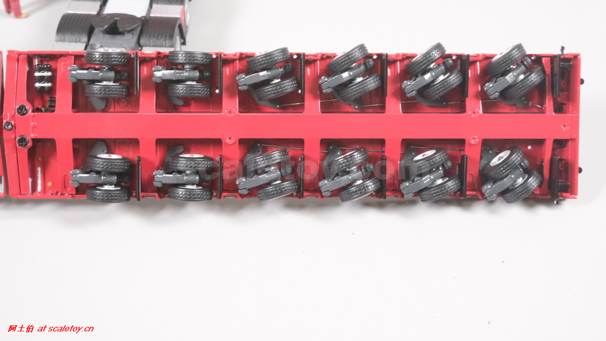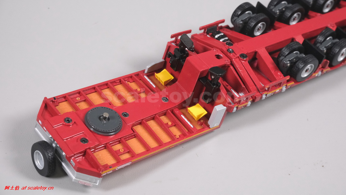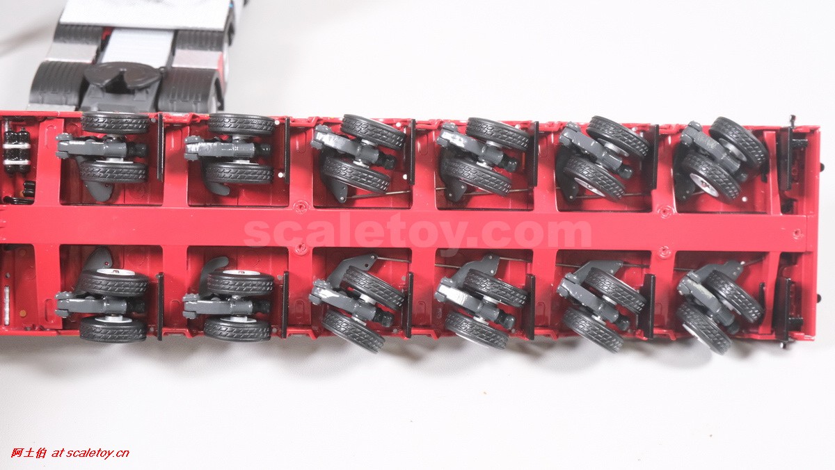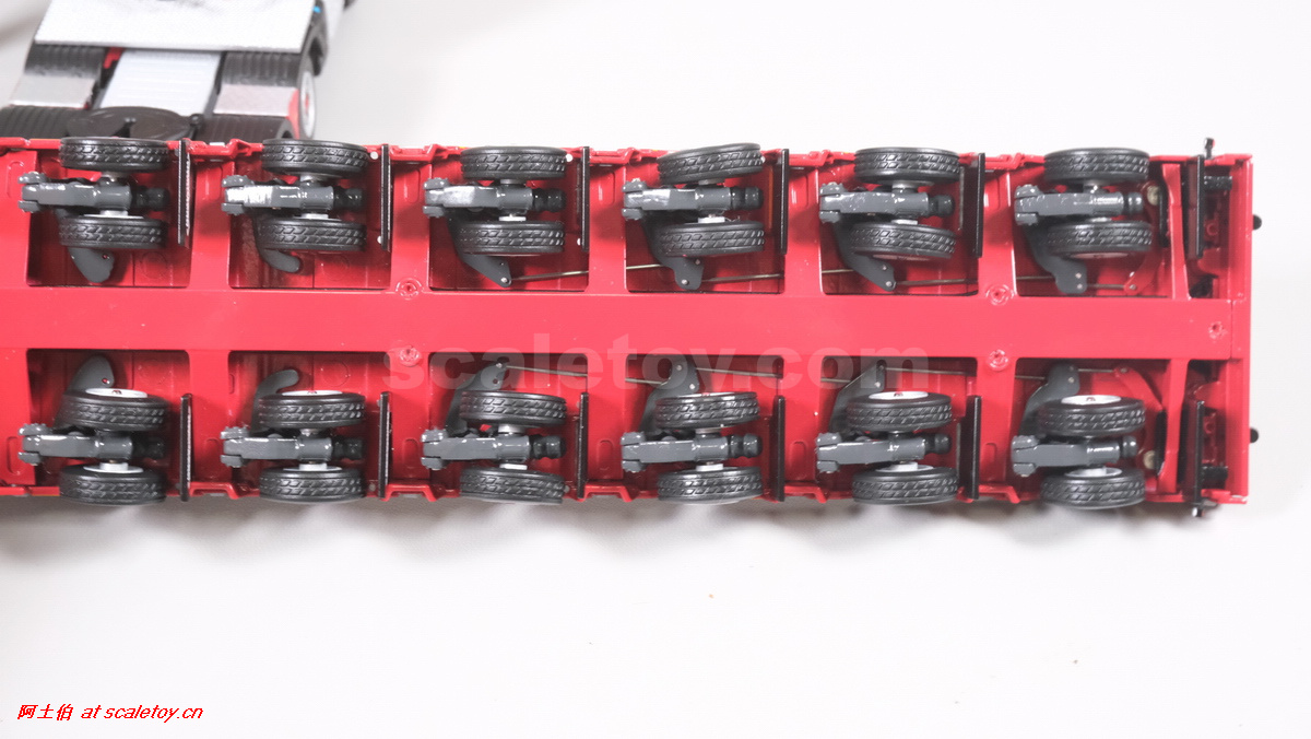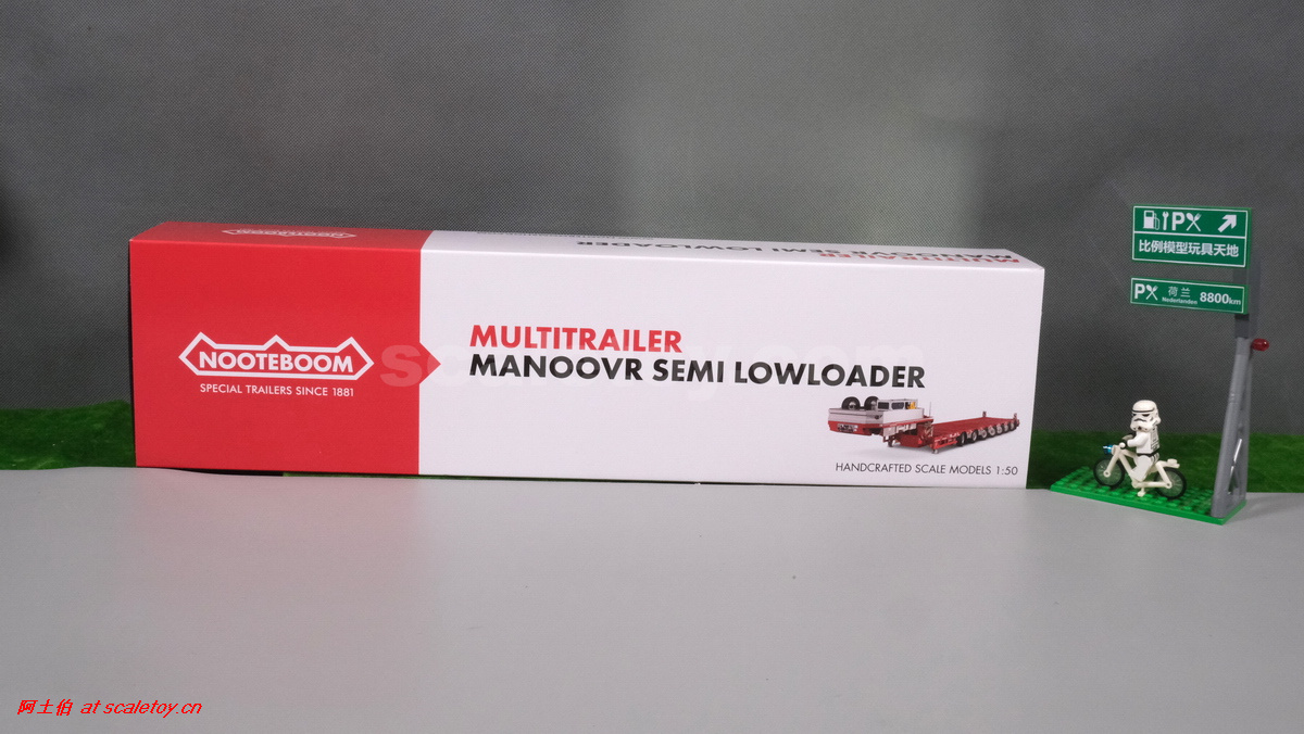 今天介绍的是WSI为NOOTEBOOM原厂涂装专门做的RED LINE系列模型之一,编号6073368的,沃尔沃FH5 GLOBETROTTER 8X4 拖头,挂六轴的MANOOVR MPL半低板,并配10呎简易工房集装箱。
